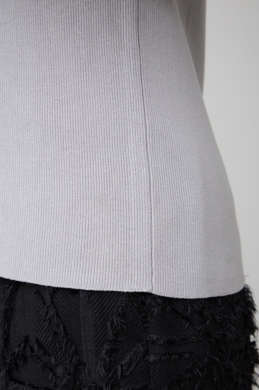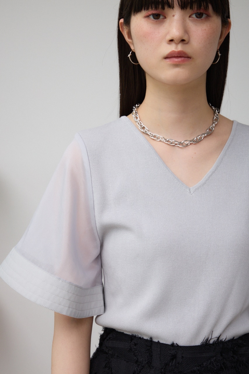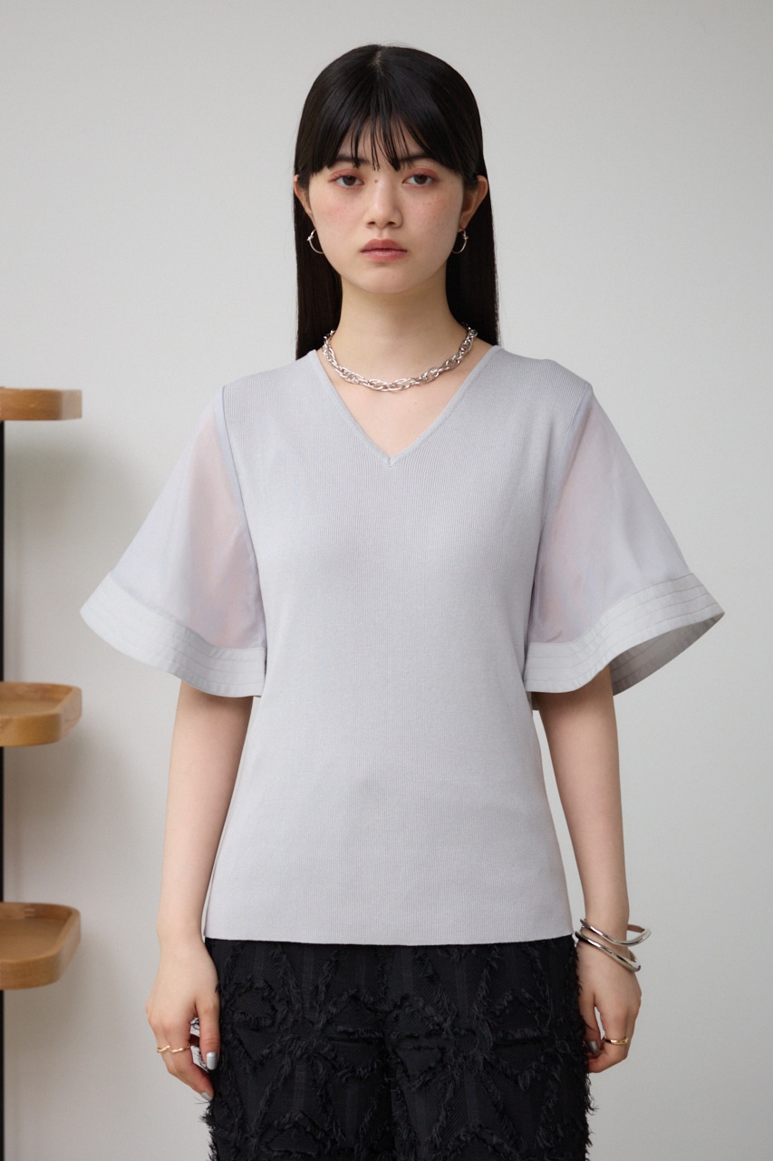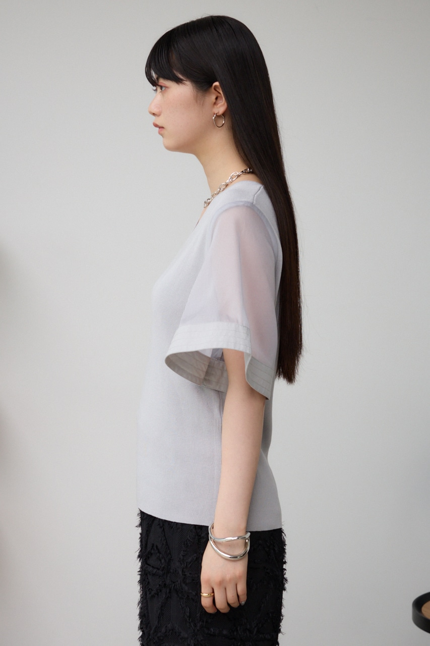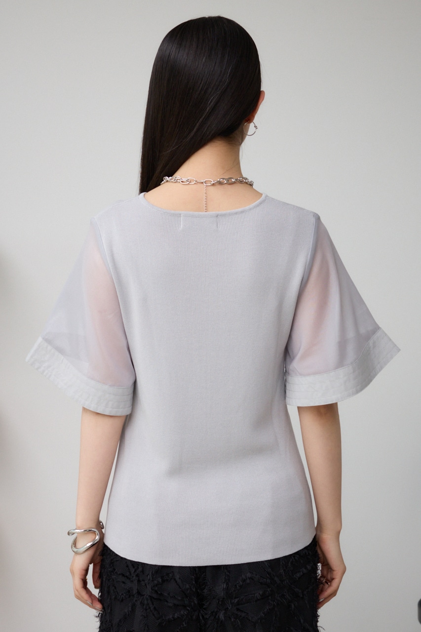 袖は上品なシアー感のあるオーガンジーとサテンを、身頃は清涼感のあるニットを合わせた異素材ドッキングトップス。