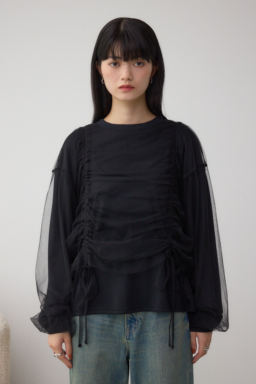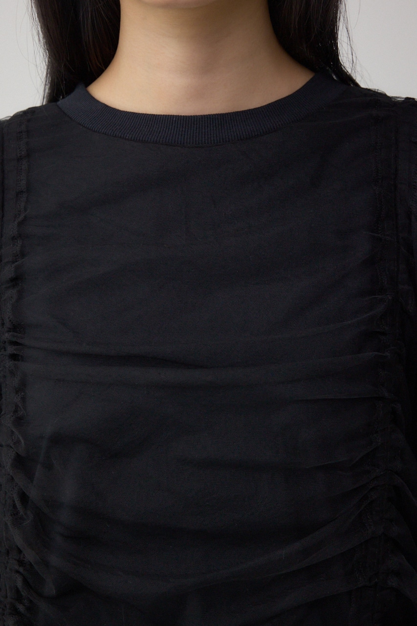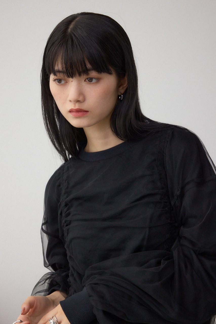 女性らしいギャザーを施したチュールドッキングした1枚で着映え抜群のトップスです。