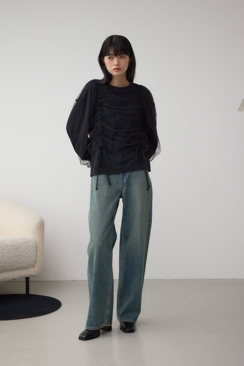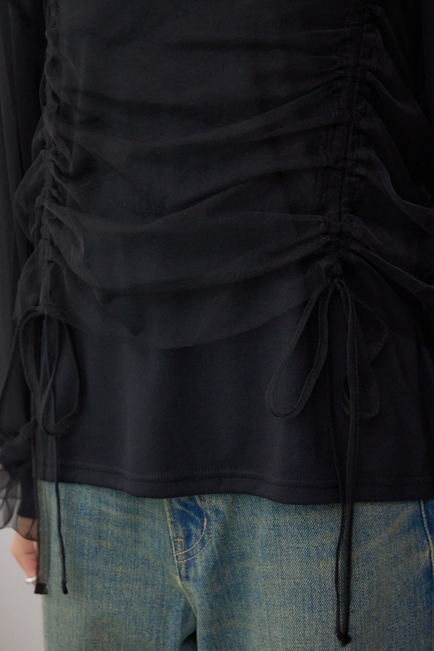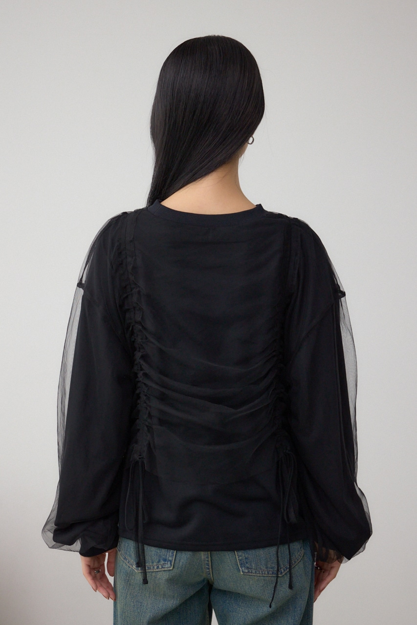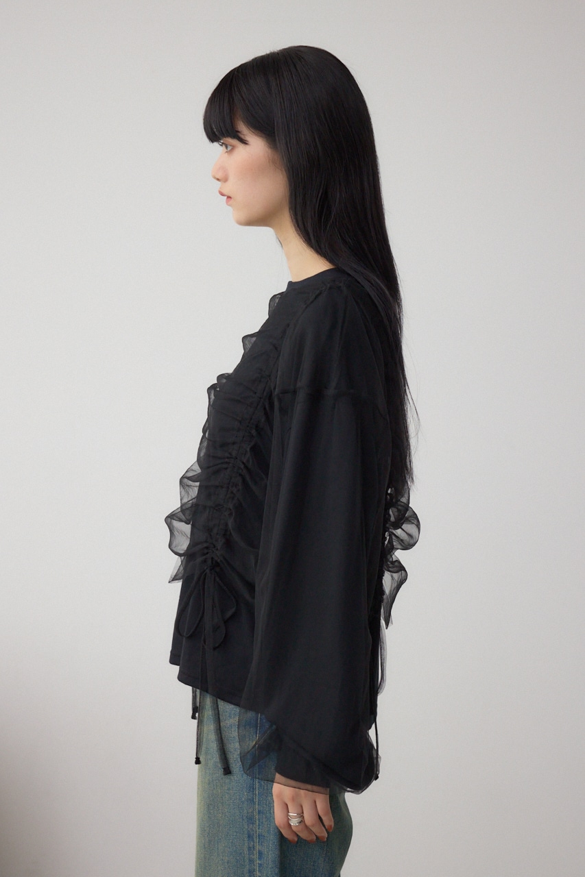 女性らしいギャザーを施したチュールドッキングした1枚で着映え抜群のトップスです。