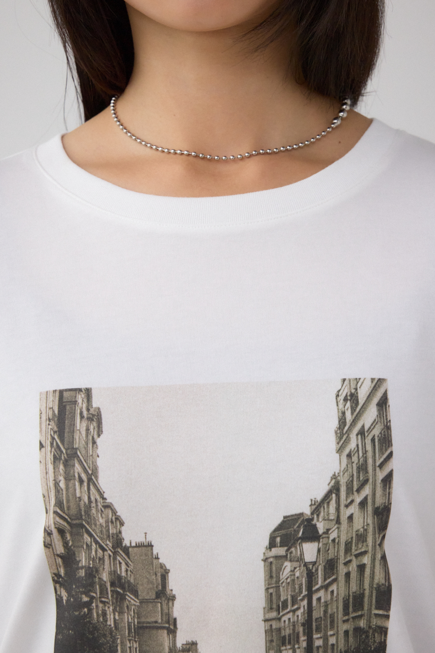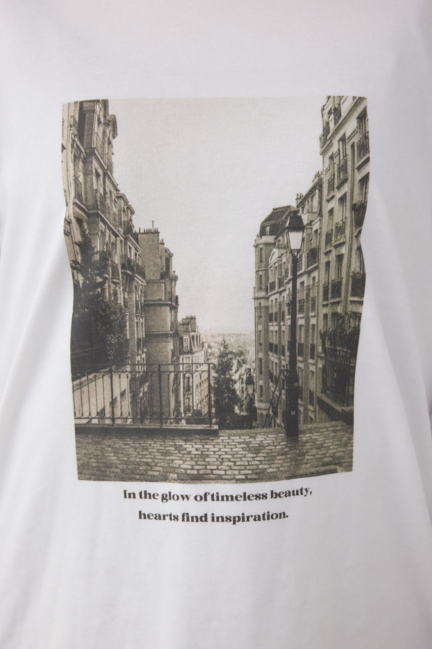 フォトプリント加工を施したTC天竺カットソー生地を使用。