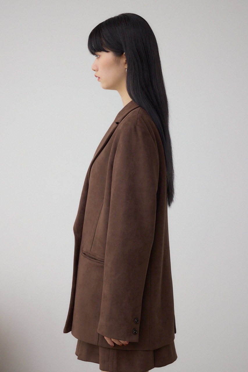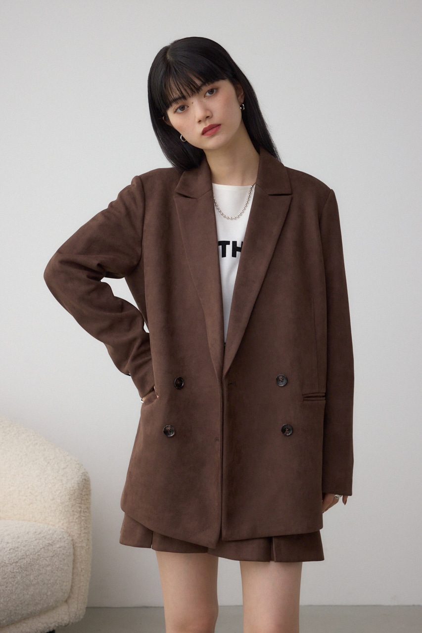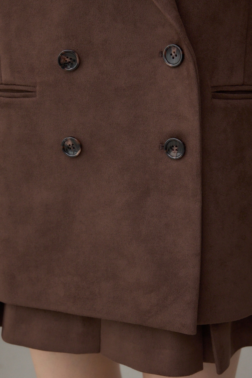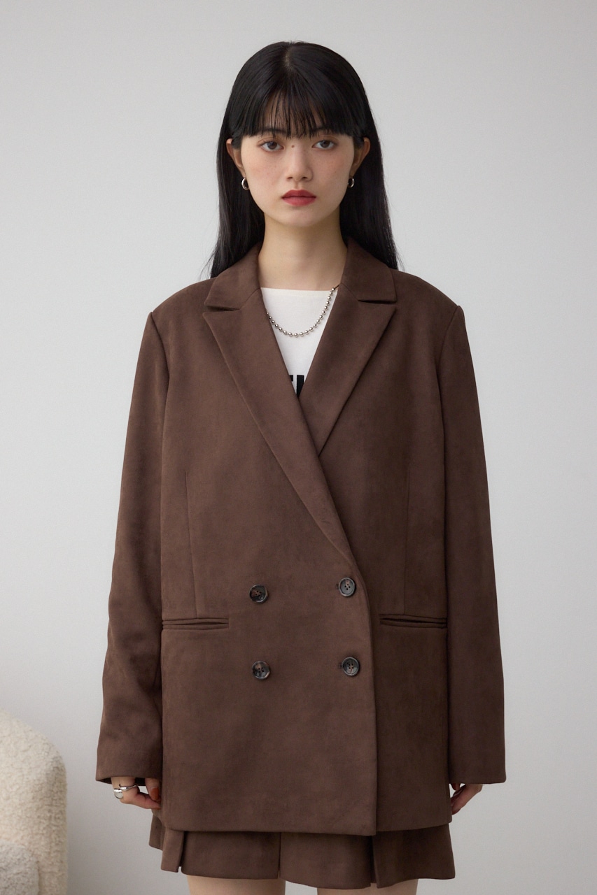 ブラウンは上品なスエード調素材で仕立てた、洗練感漂うダブルボタンジャケットです。