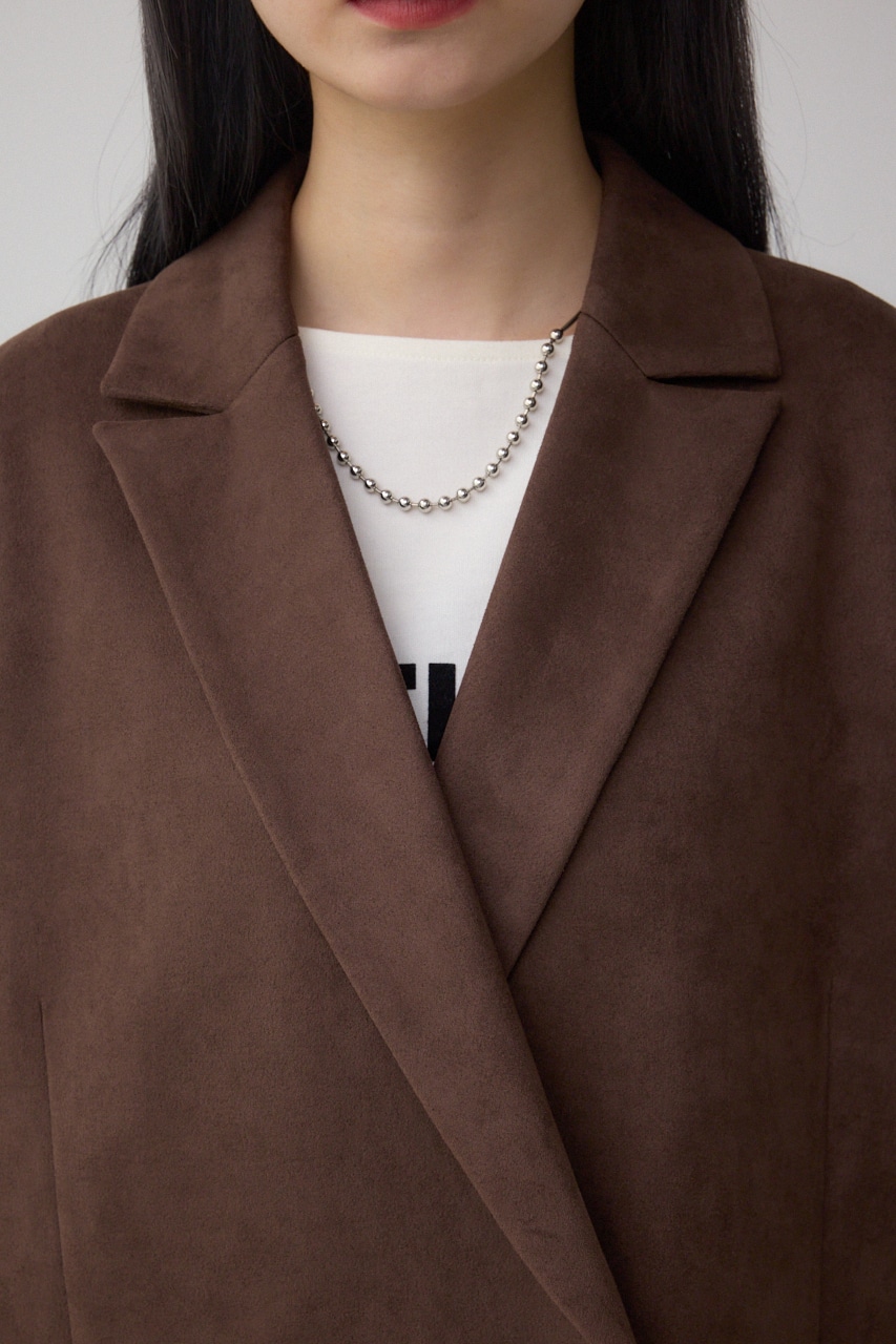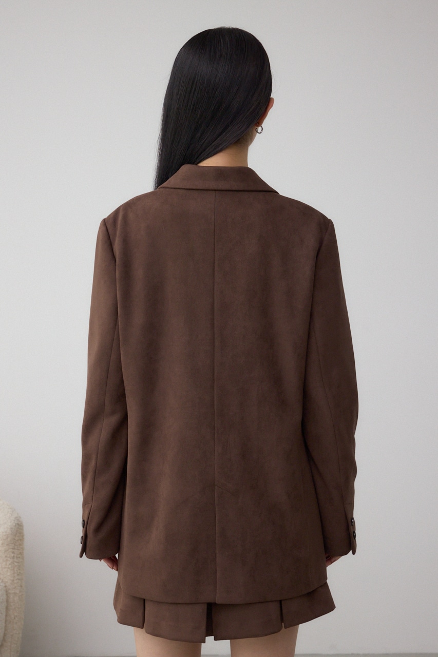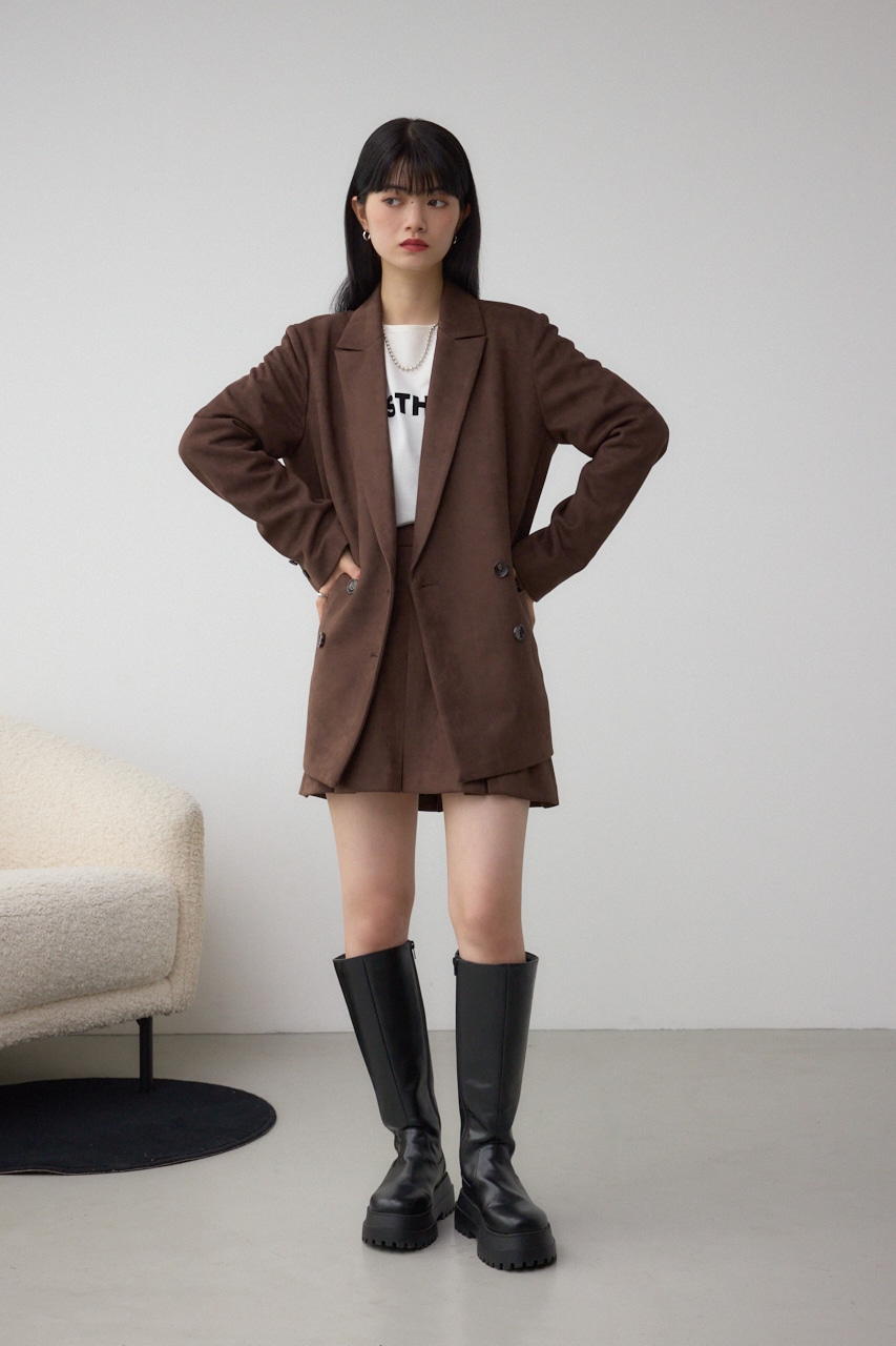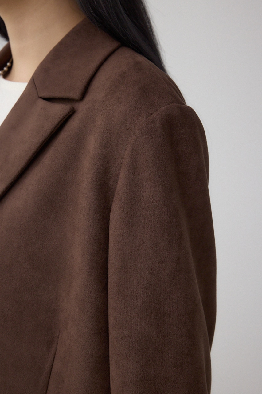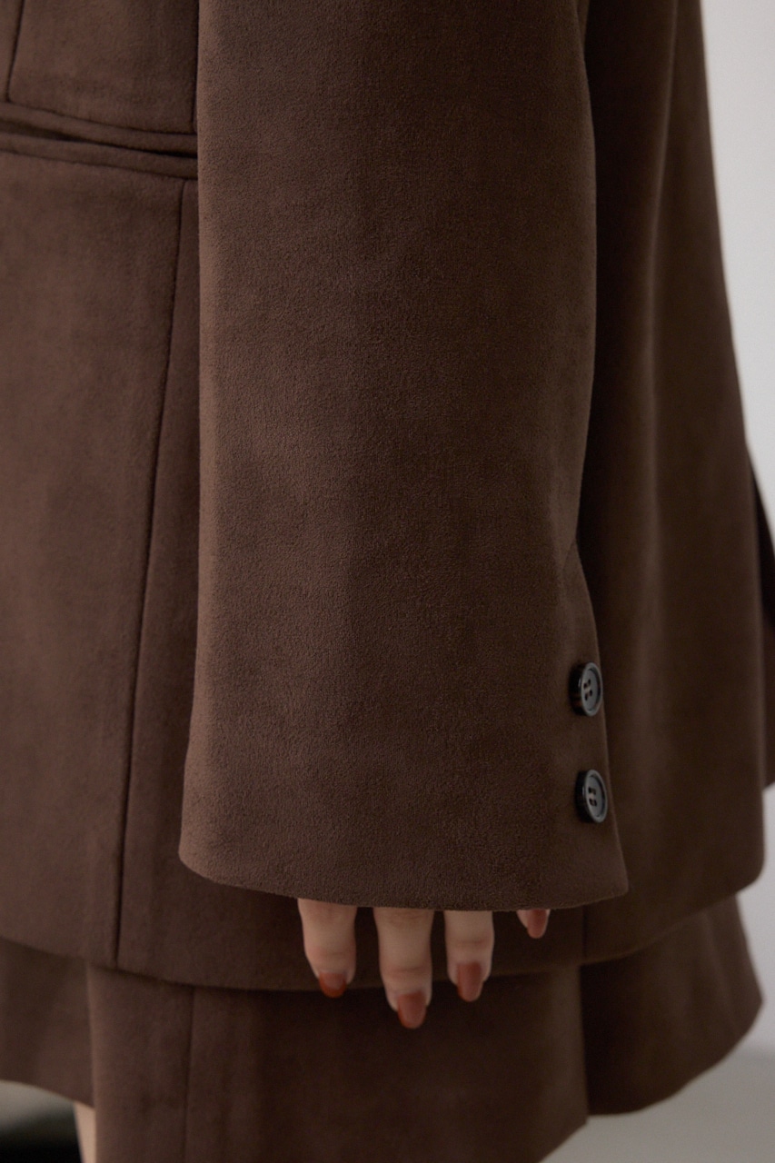ブラウンは上品なスエード調素材で仕立てた、洗練感漂うダブルボタンジャケットです。