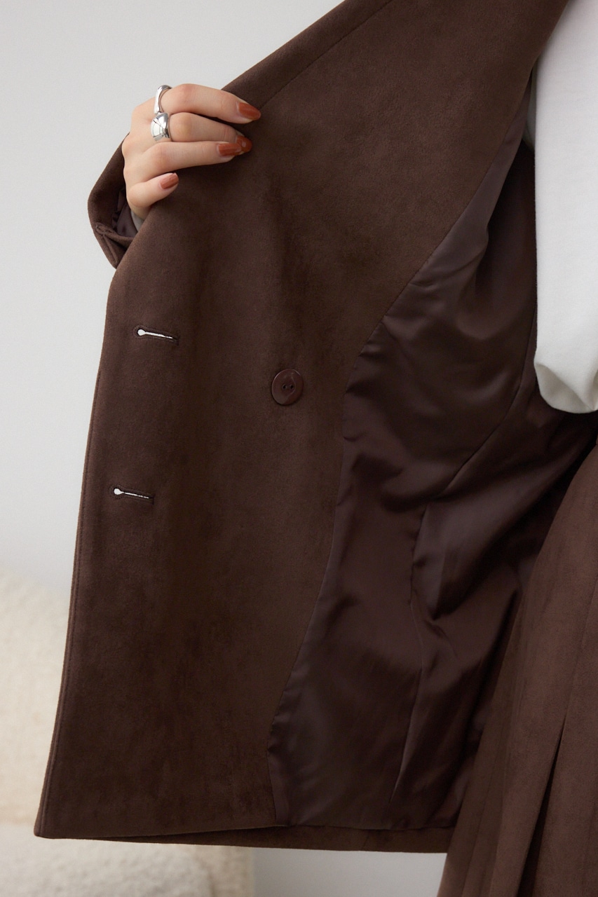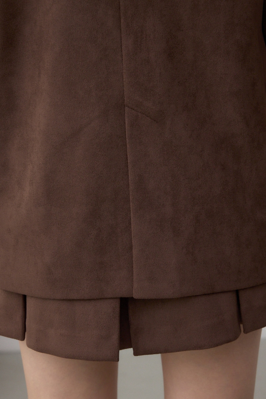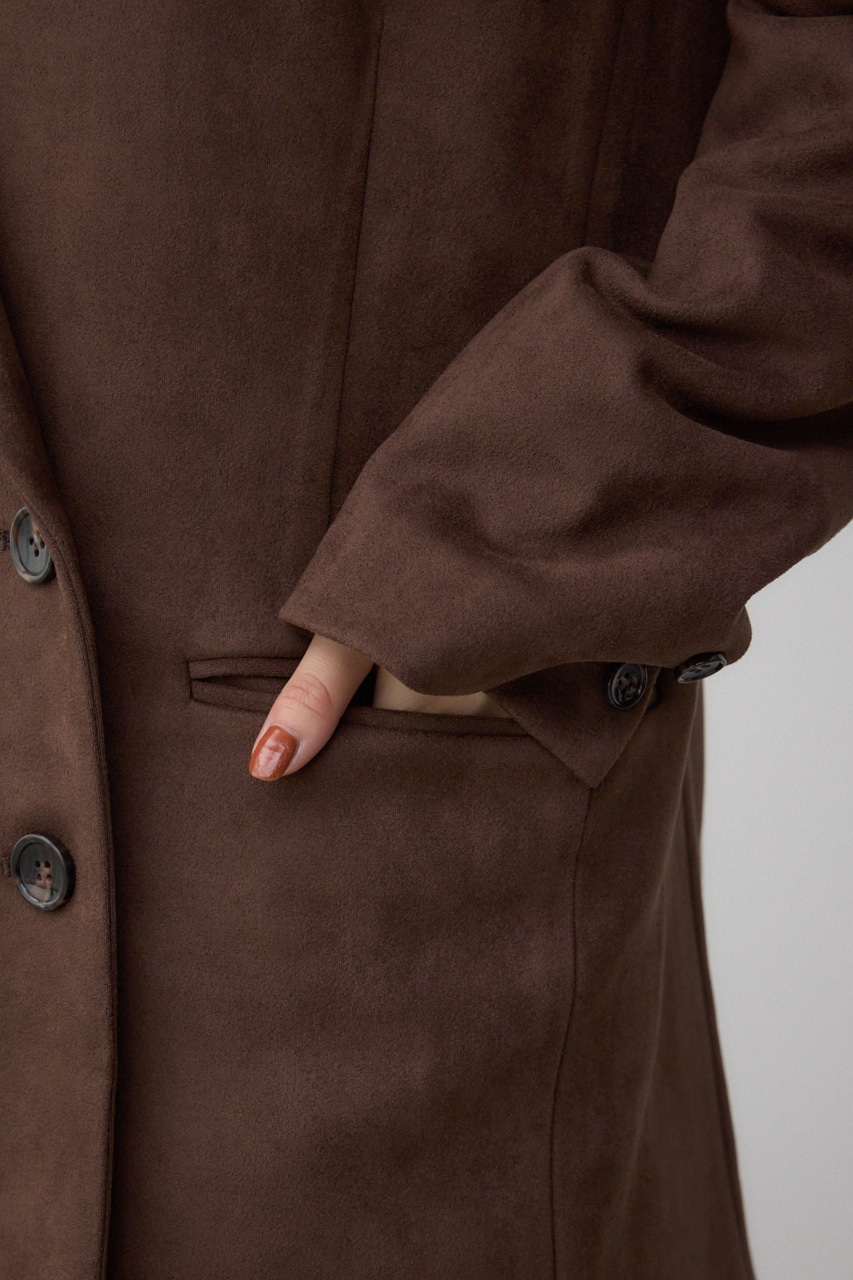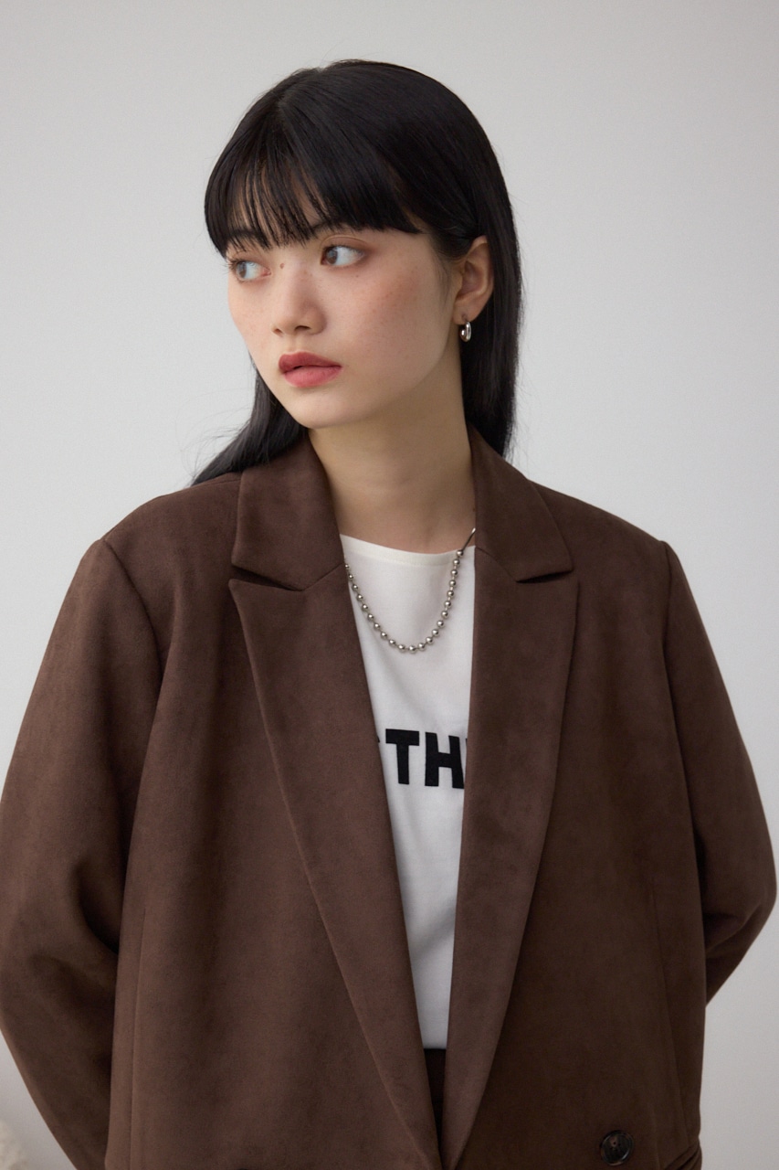 ブラウンは上品なスエード調素材で仕立てた、洗練感漂うダブルボタンジャケットです。