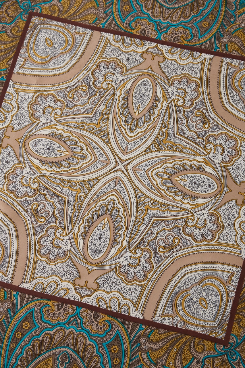 外側は落ち着いたブラウンの無地、内側にかけてグリーン系のペイズリー柄、中央はアイボリーのペイズリー柄と、絶妙な配色バランスがポイント。