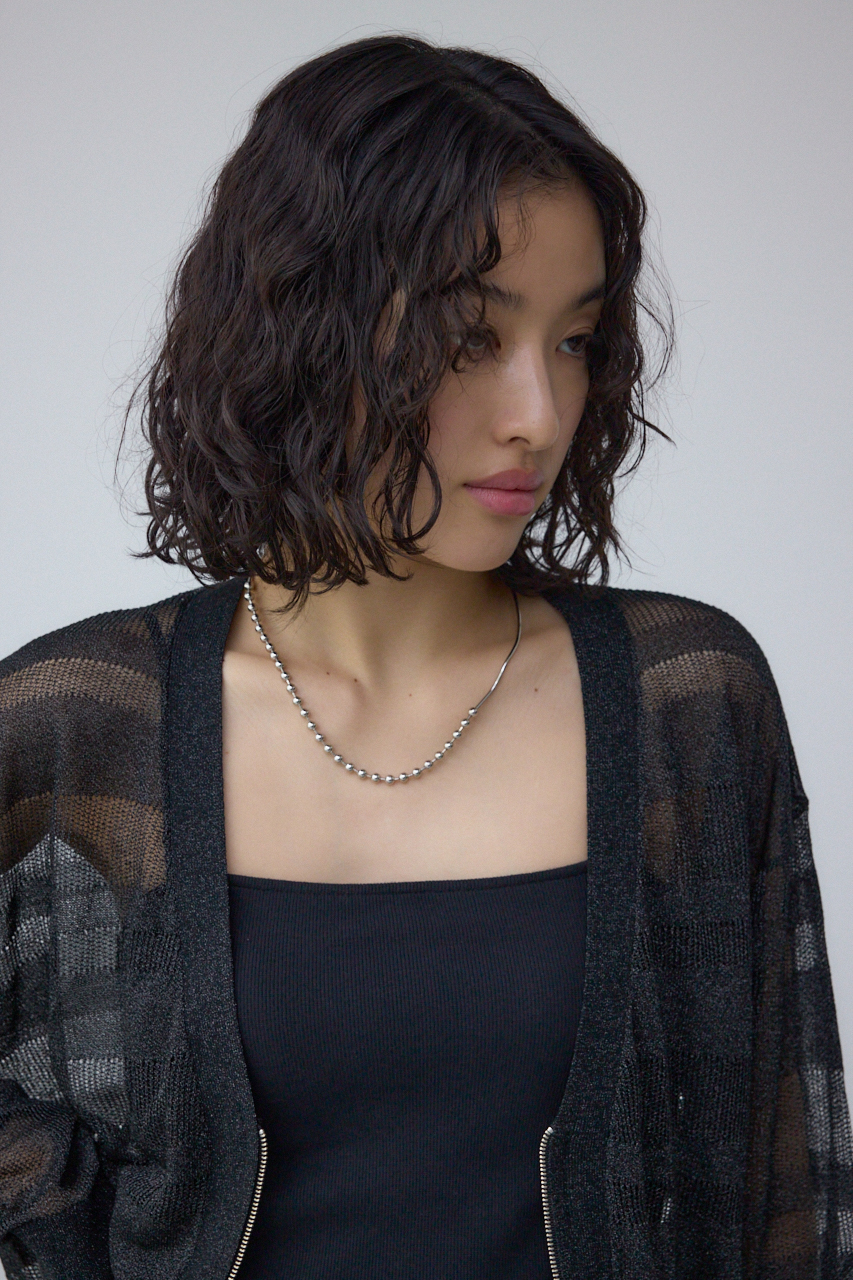メッシュ編みのシアーボーダー柄のジップカーディガン。