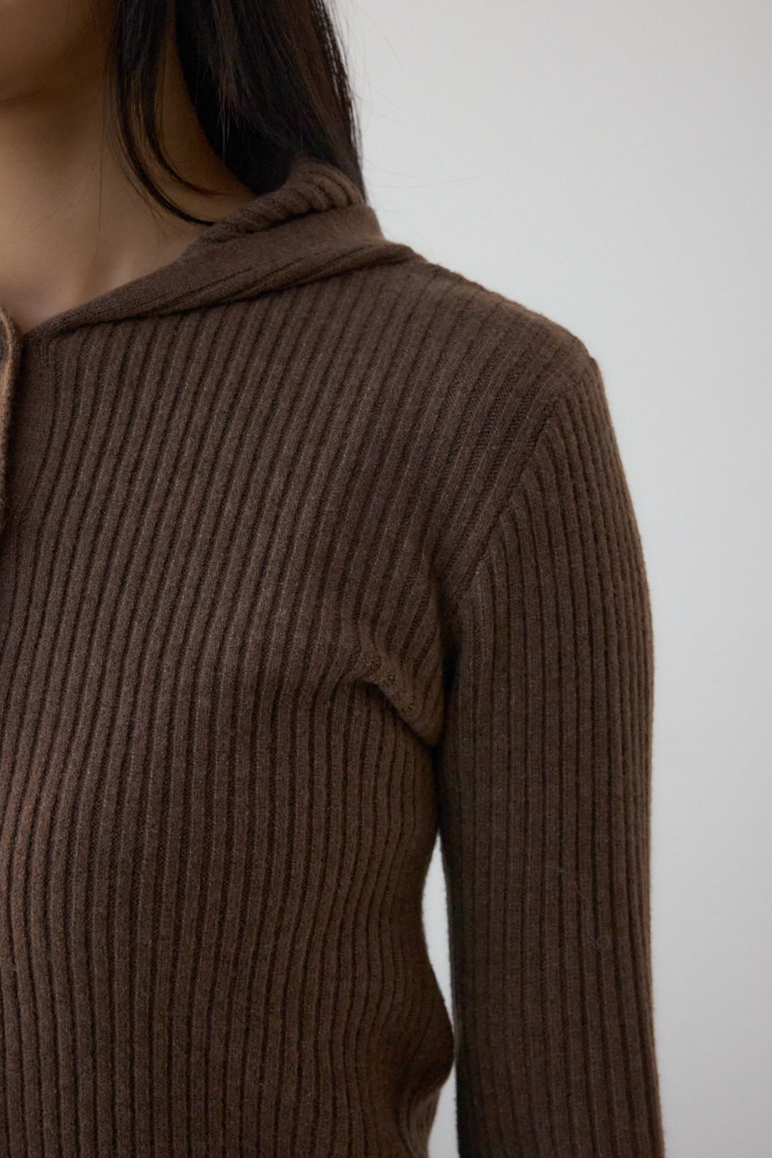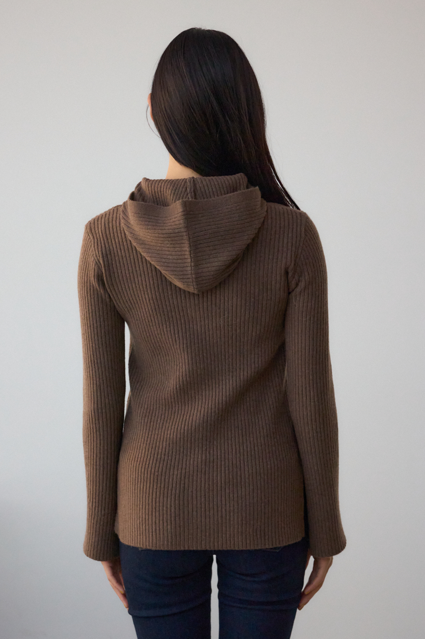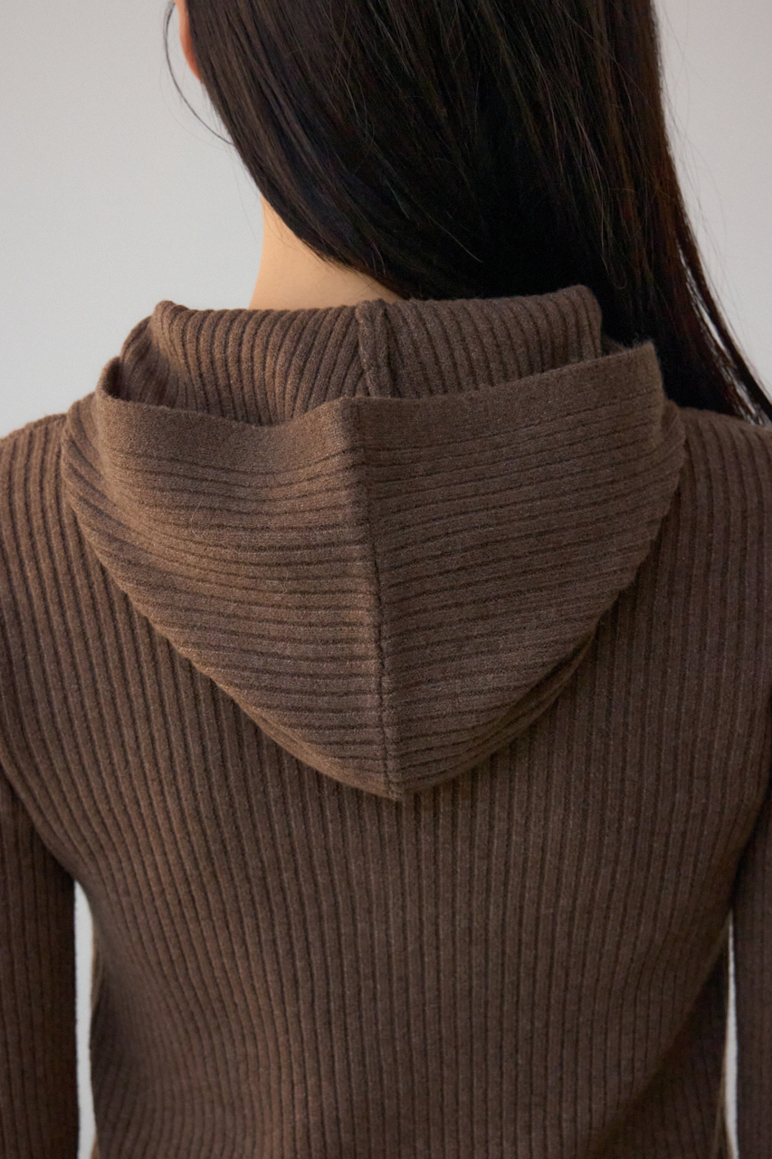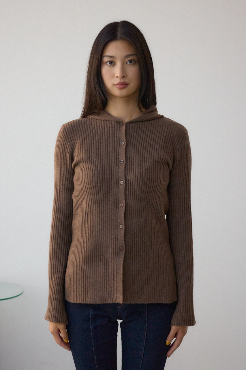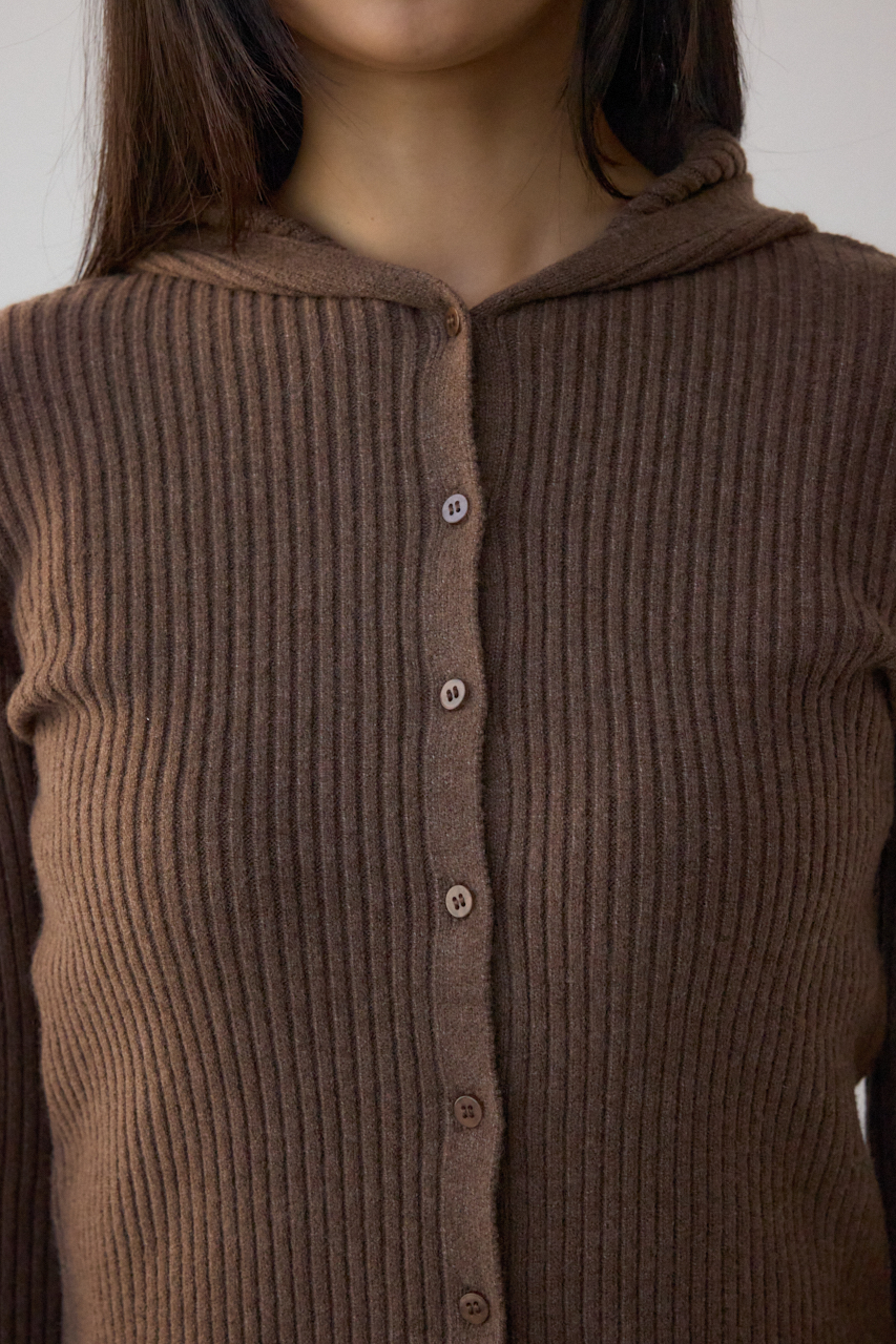 リブで編立てたフーディーデザインのニットカーディガンです。