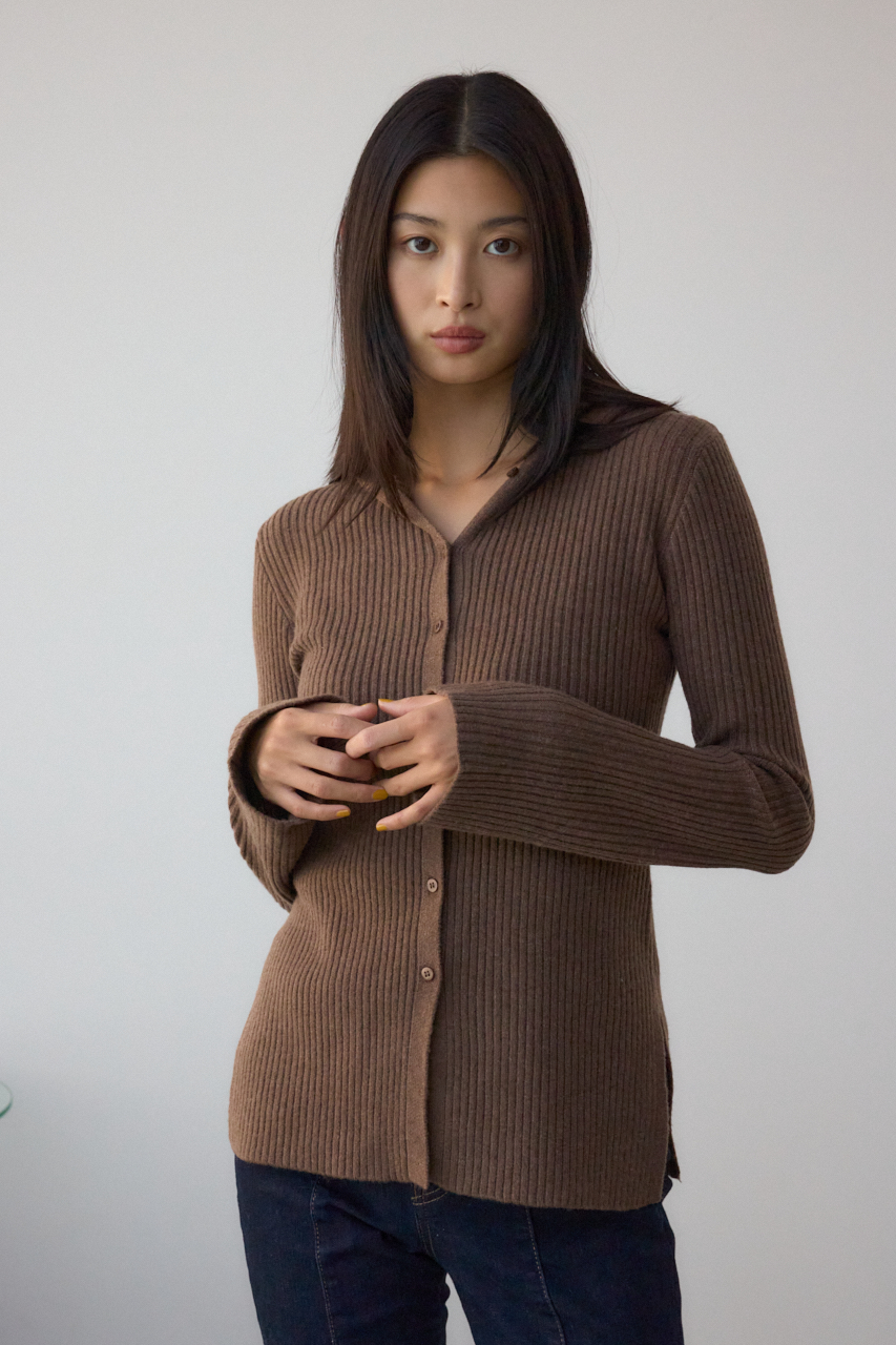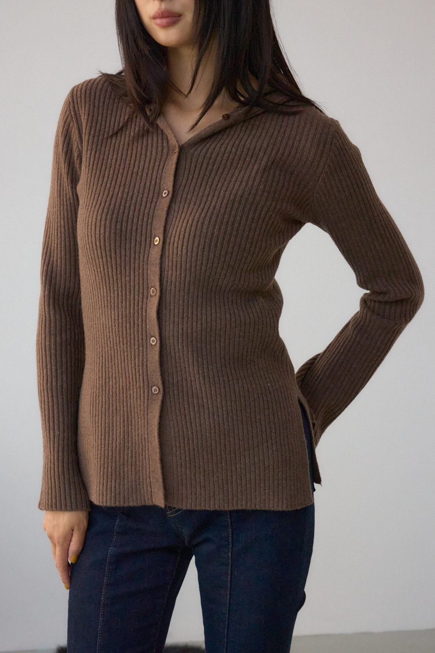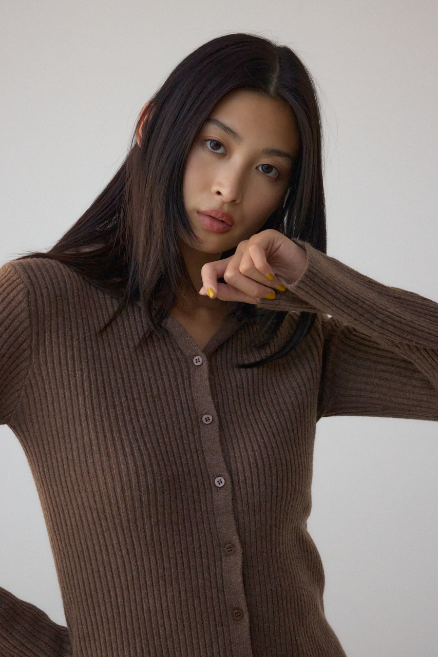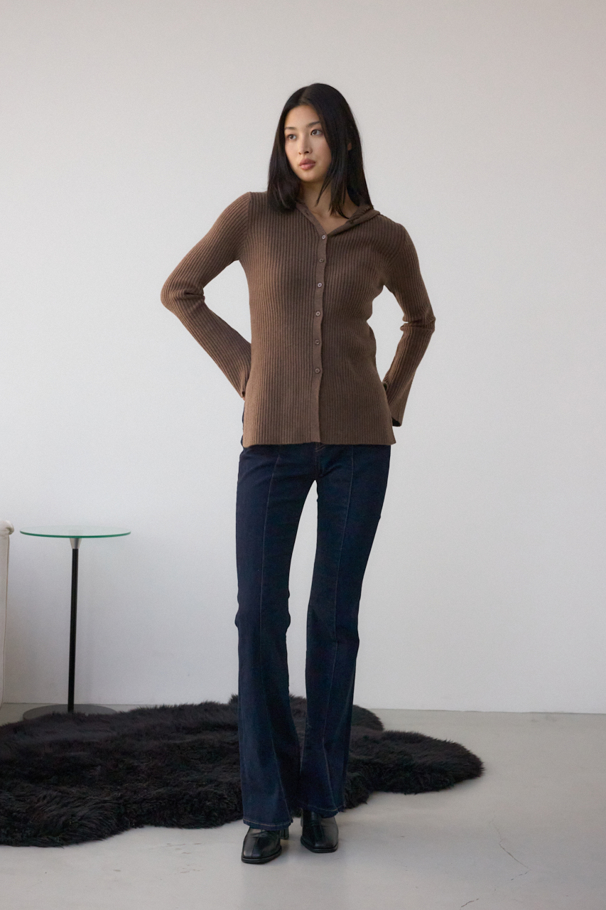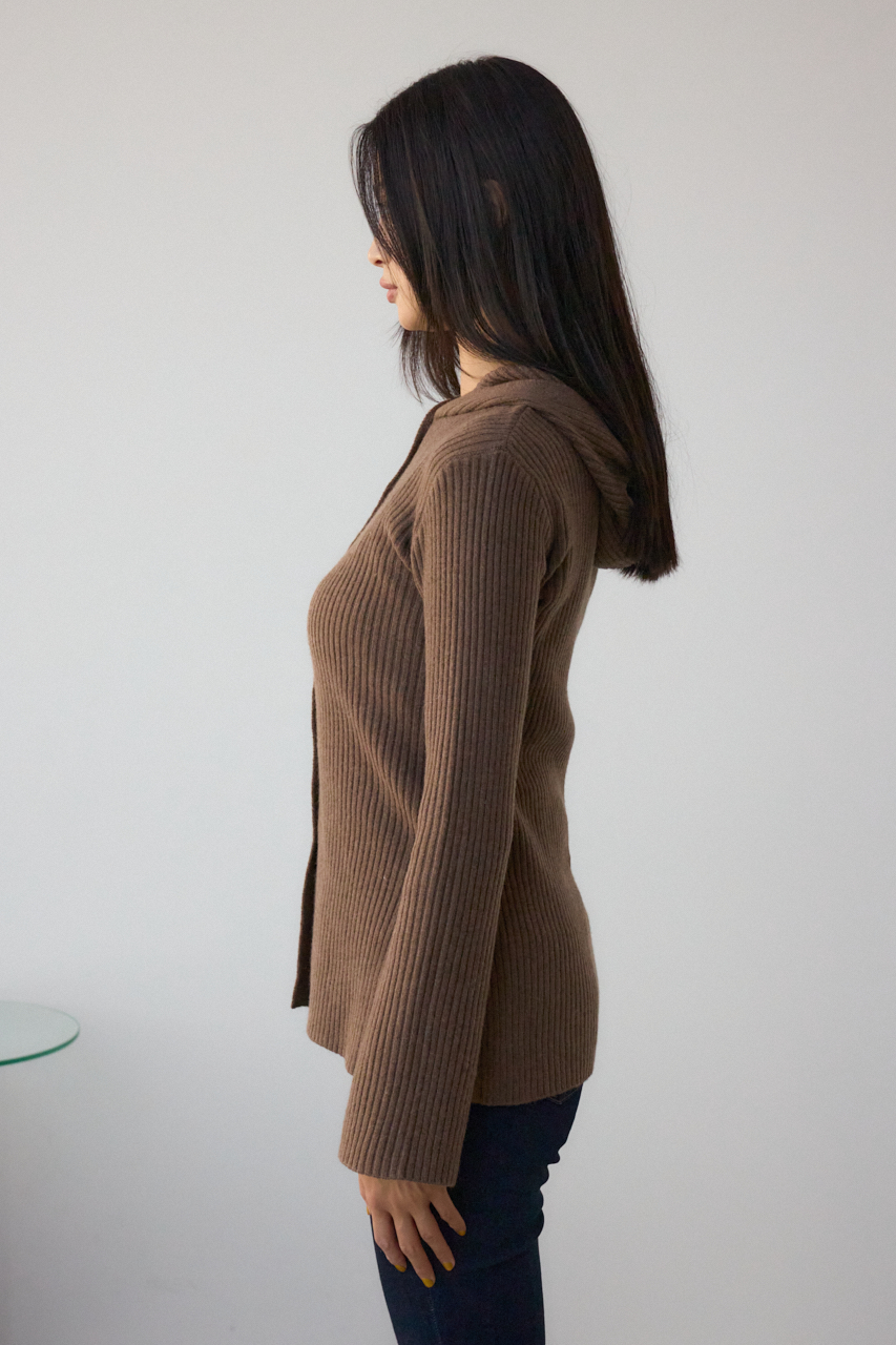 リブで編立てたフーディーデザインのニットカーディガンです。