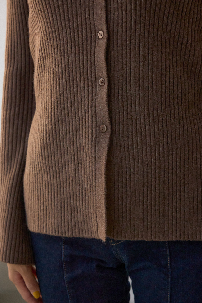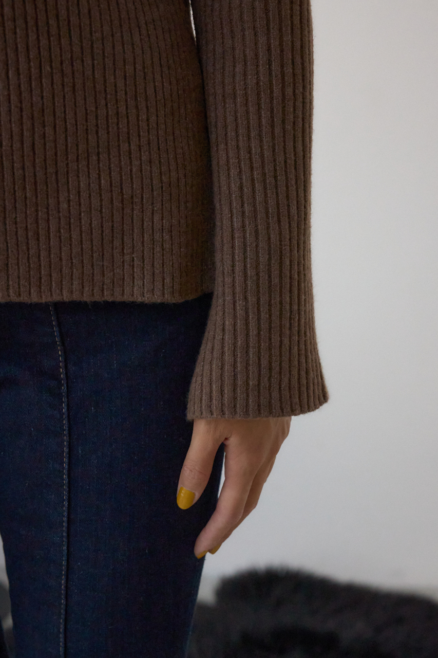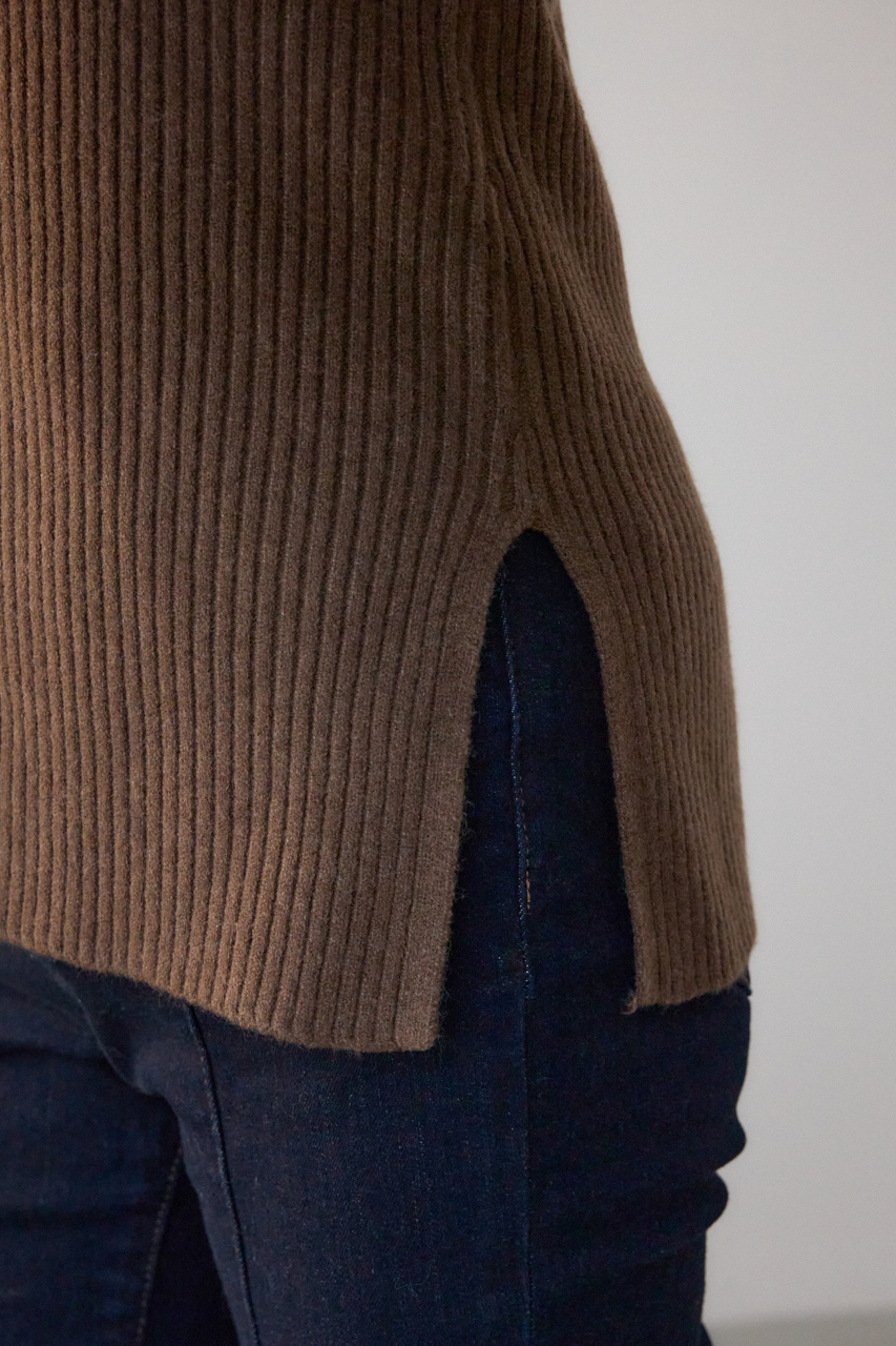 タイト過ぎないすっきりとしたシルエットと、縦見えするリブ編みの表面感で細見え効果があります。