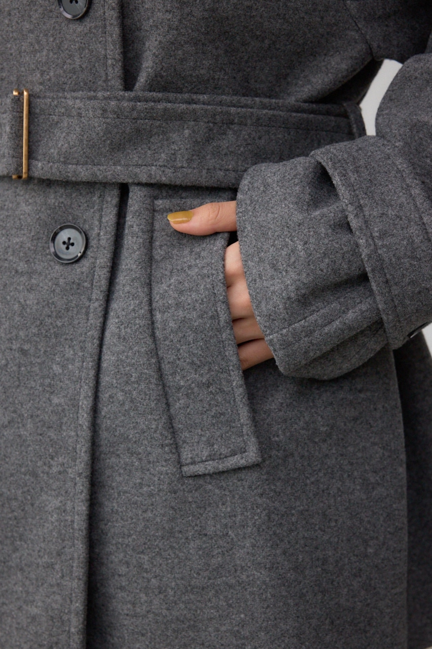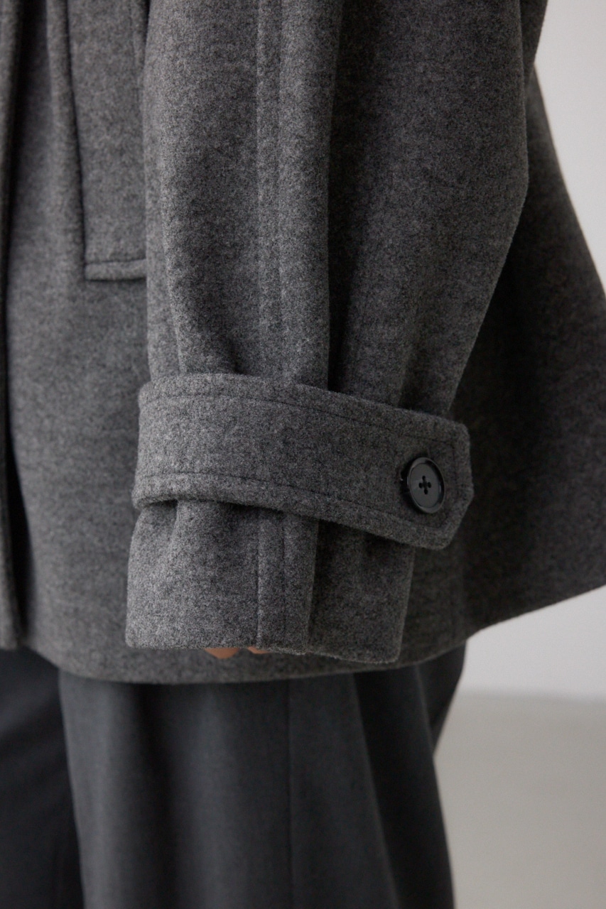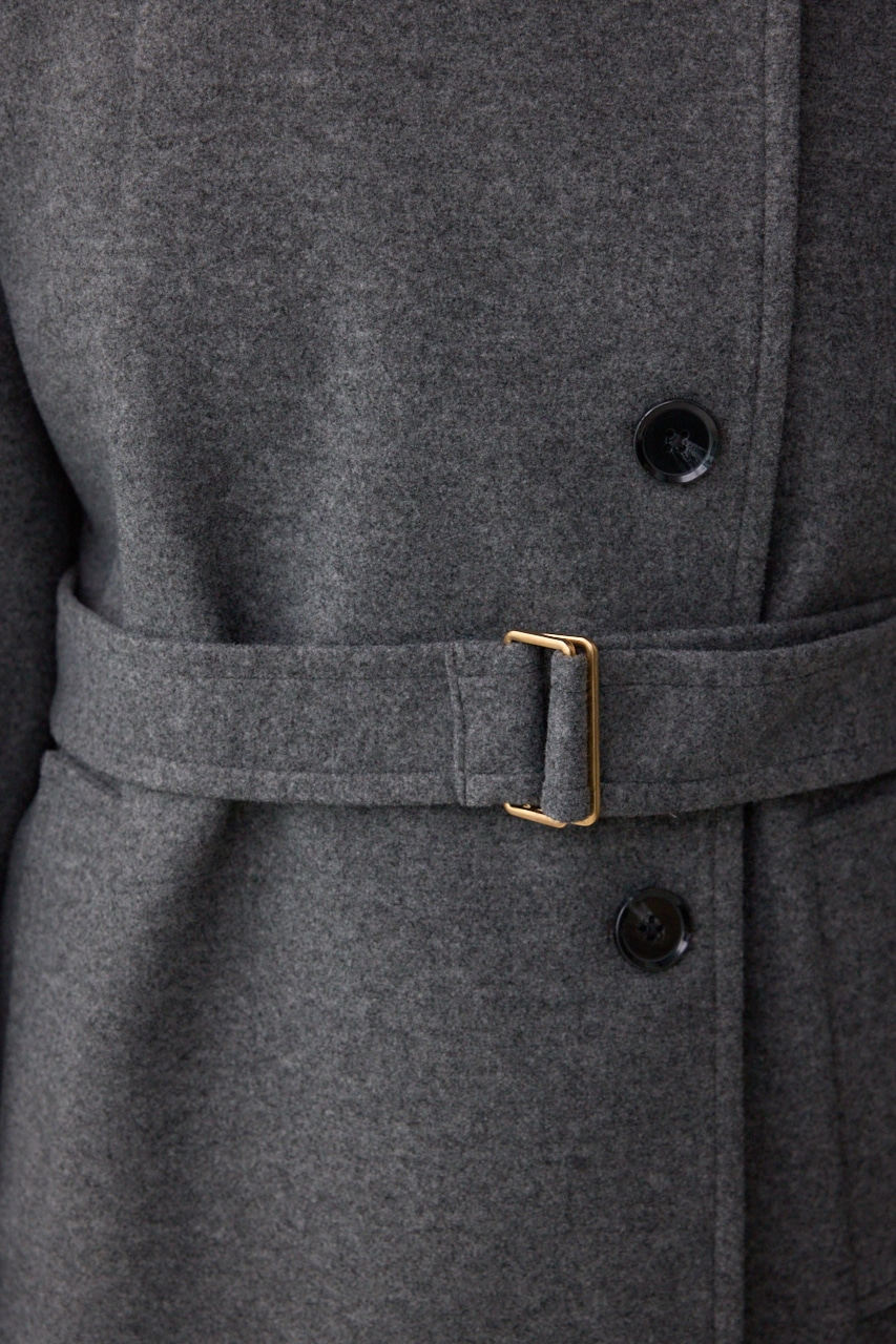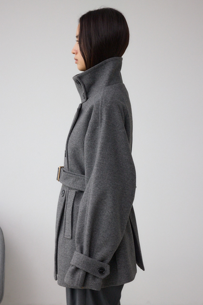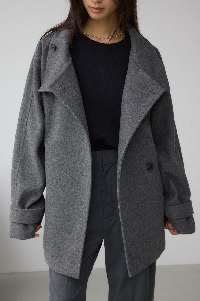 前をしめて襟を立たせると首もとをあたたかく包んでくれるスタンドカラーコート。