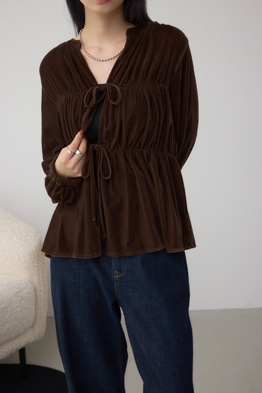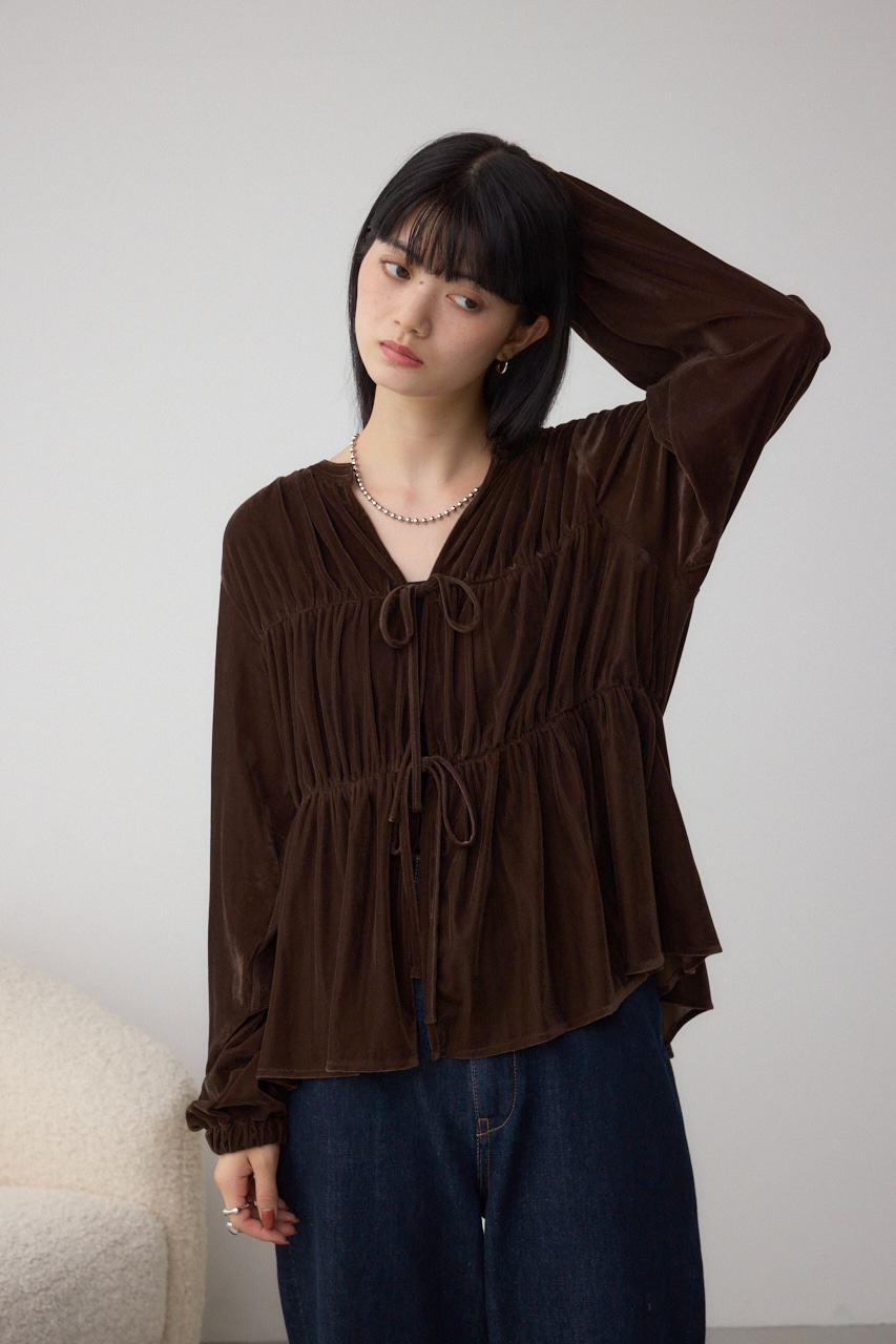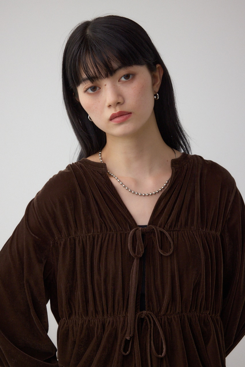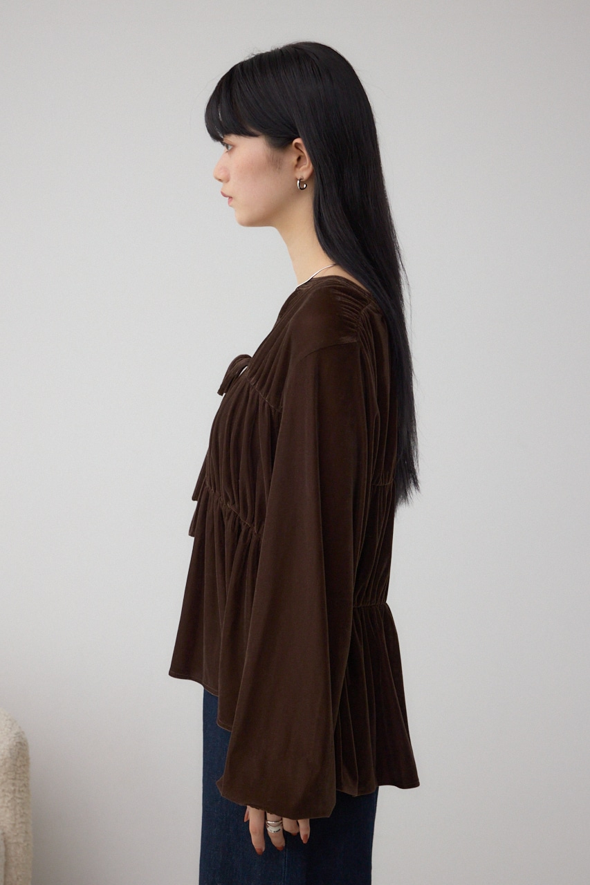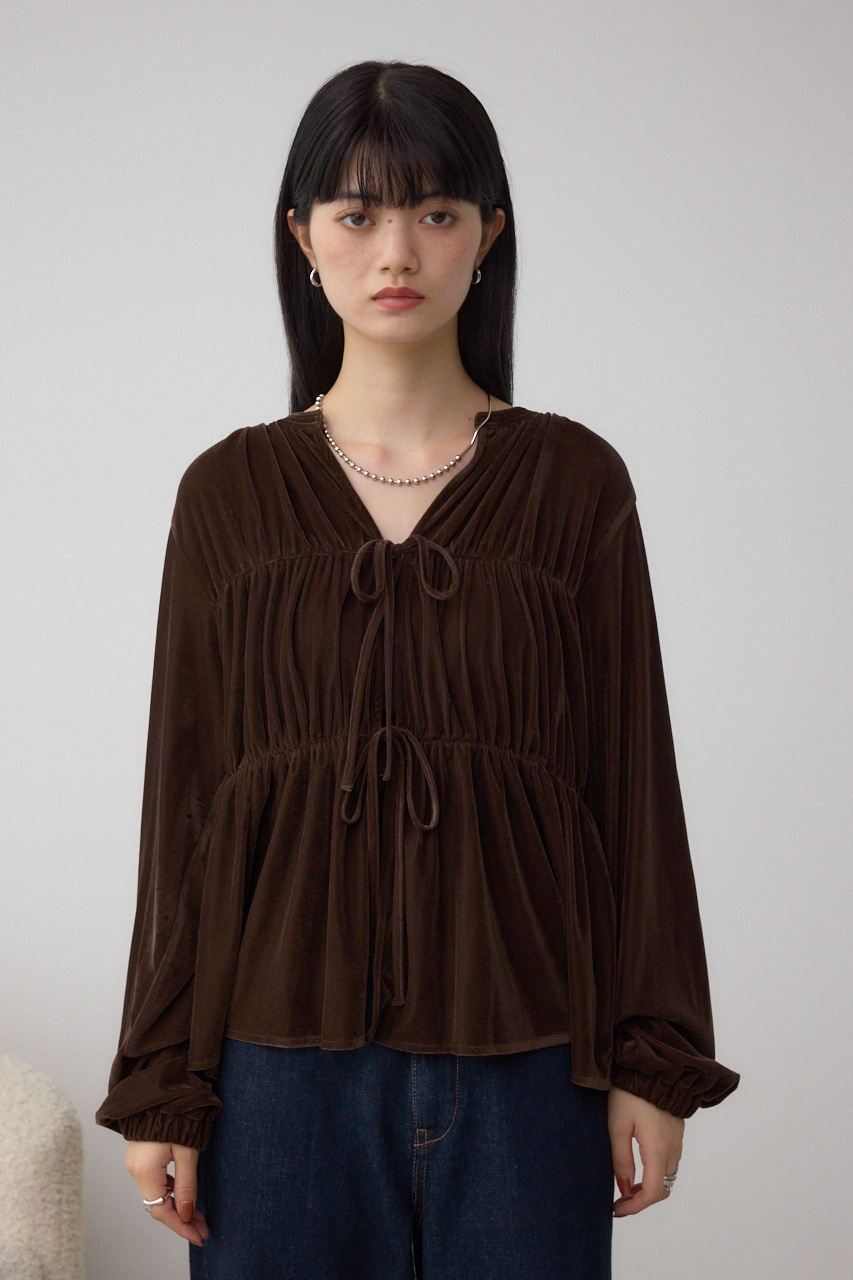 上品な光沢とドレープ感が魅力の、ベロアリボンブラウス。
