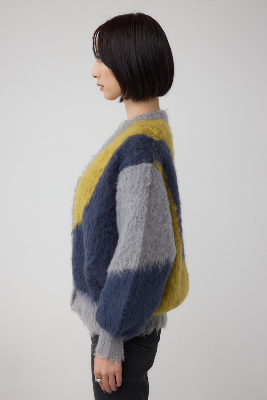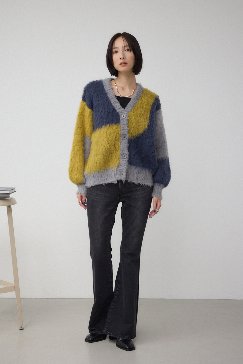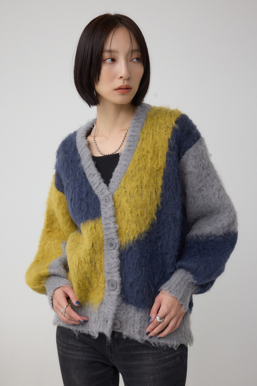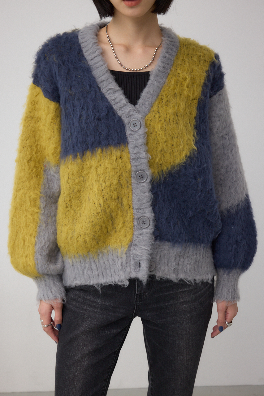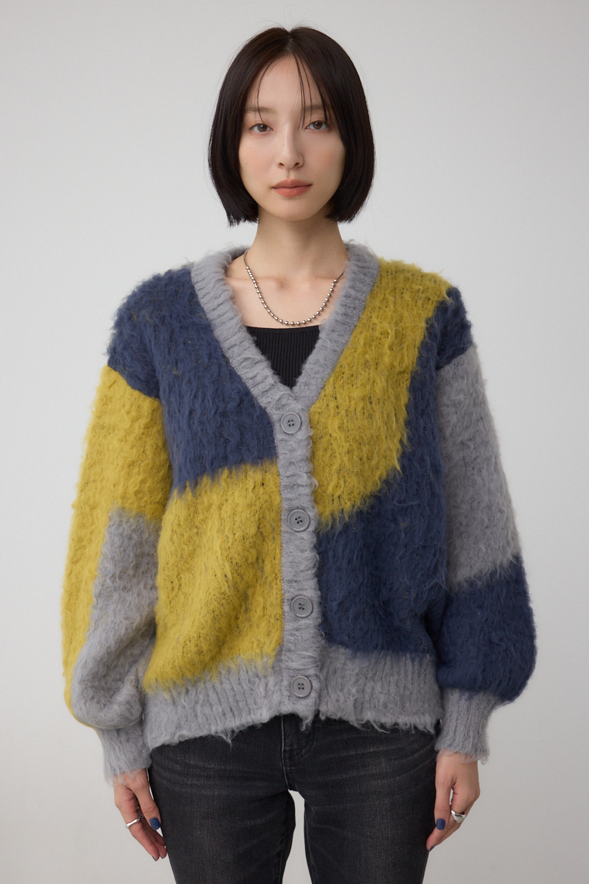カール感のあるシャギー素材と、オリジナルのブロッキングデザインがトレンドライクな印象に仕上げてくれるニットカーディガンです。