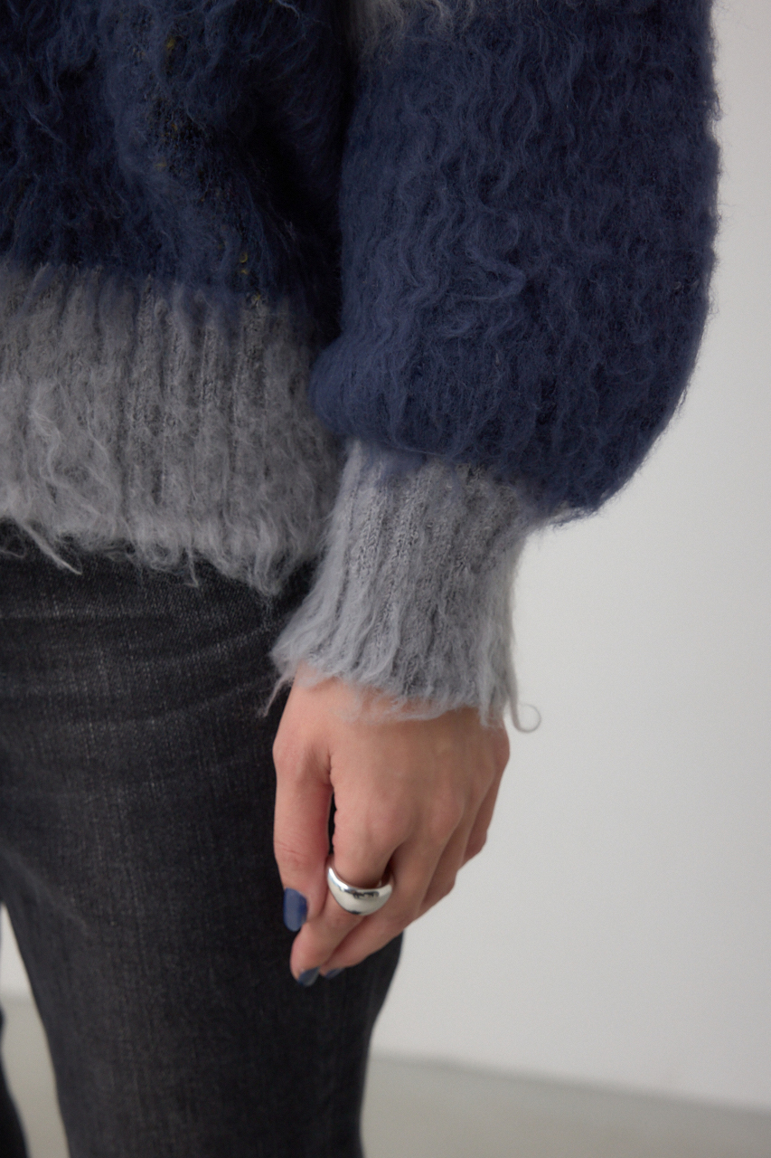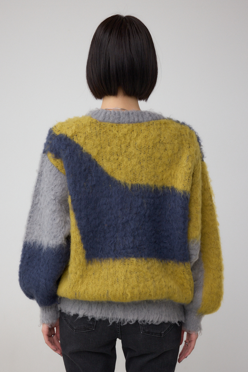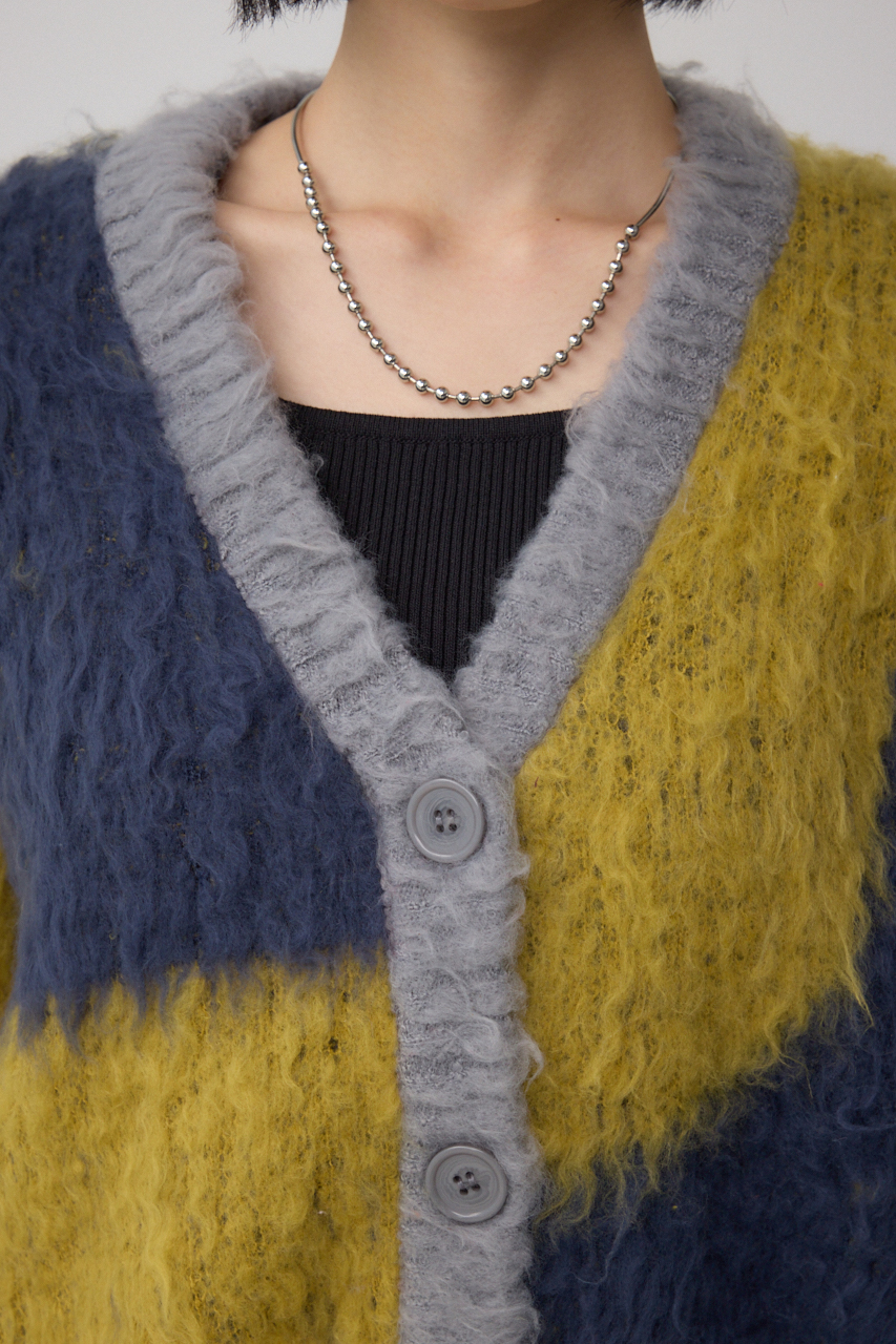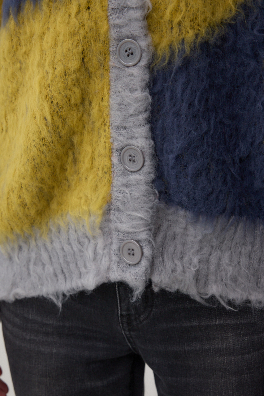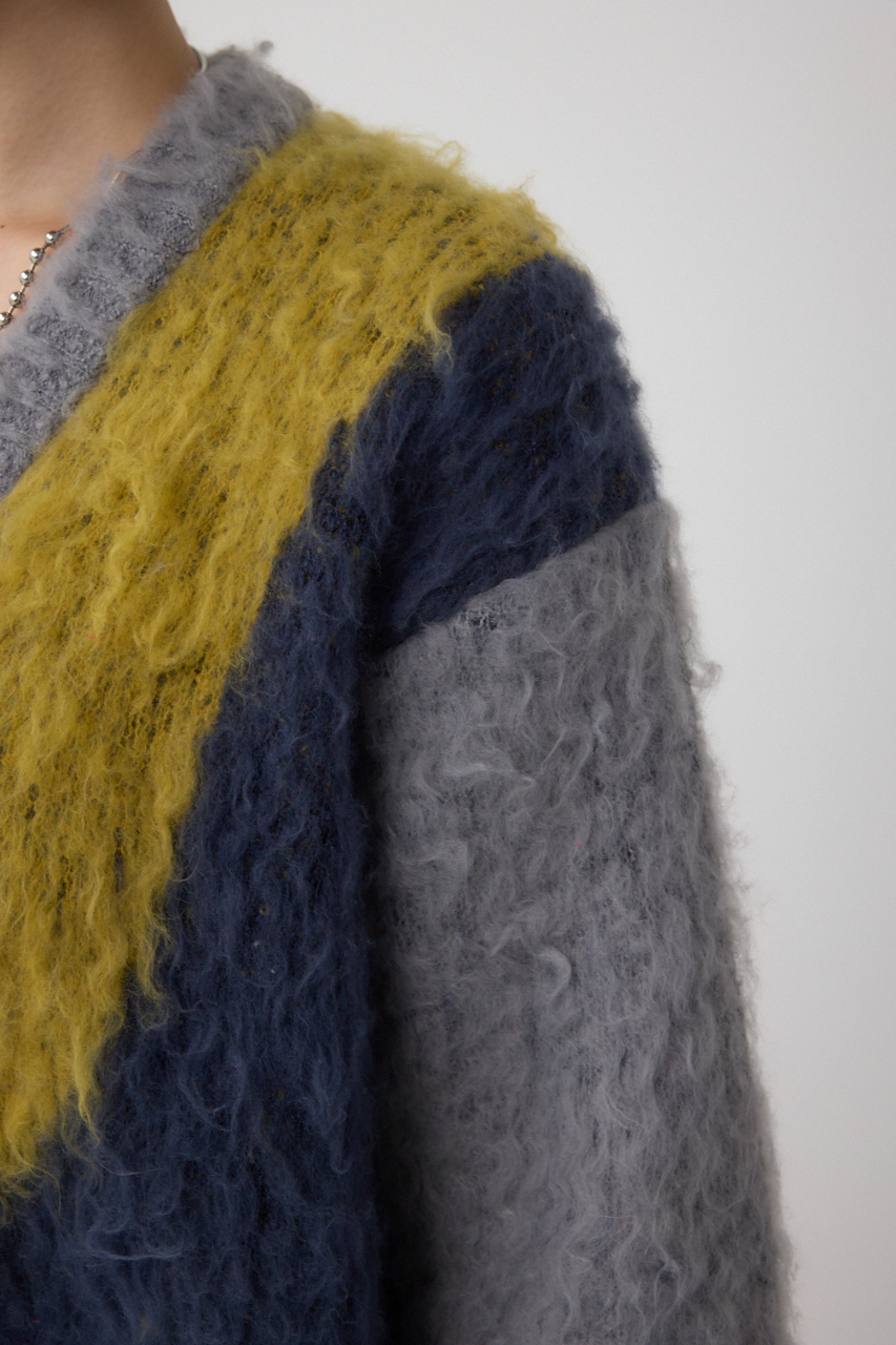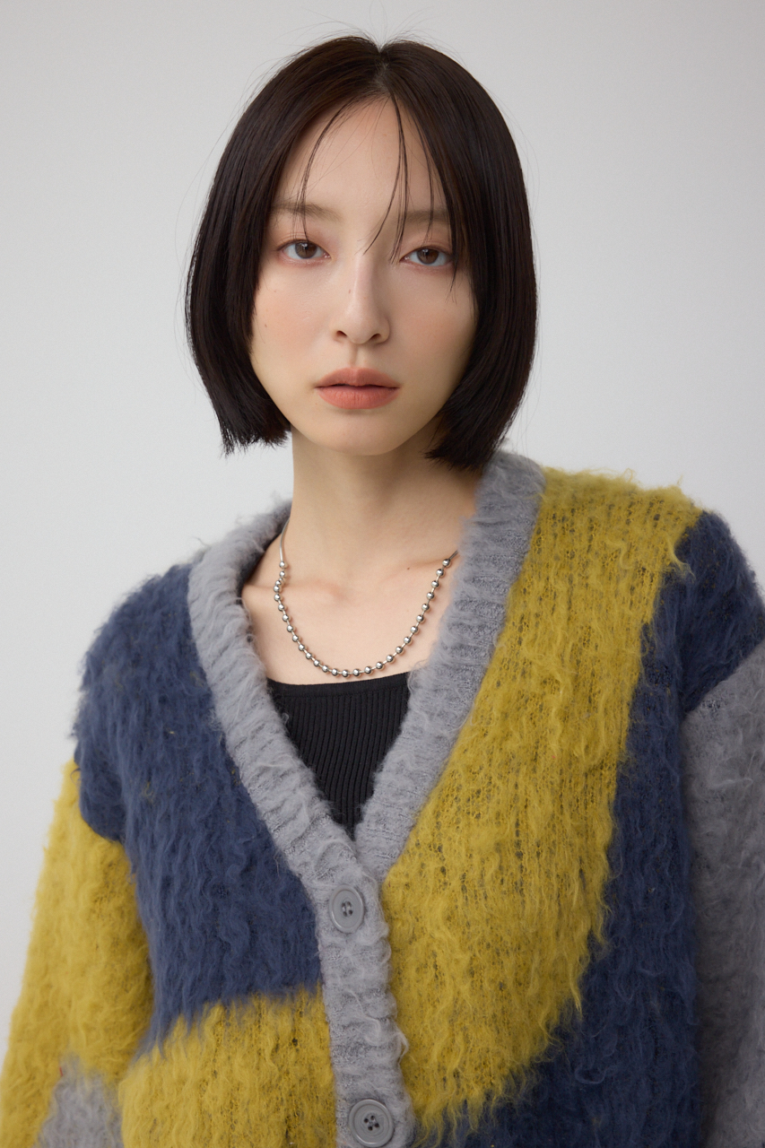 カール感のあるシャギー素材と、オリジナルのブロッキングデザインがトレンドライクな印象に仕上げてくれるニットカーディガンです。