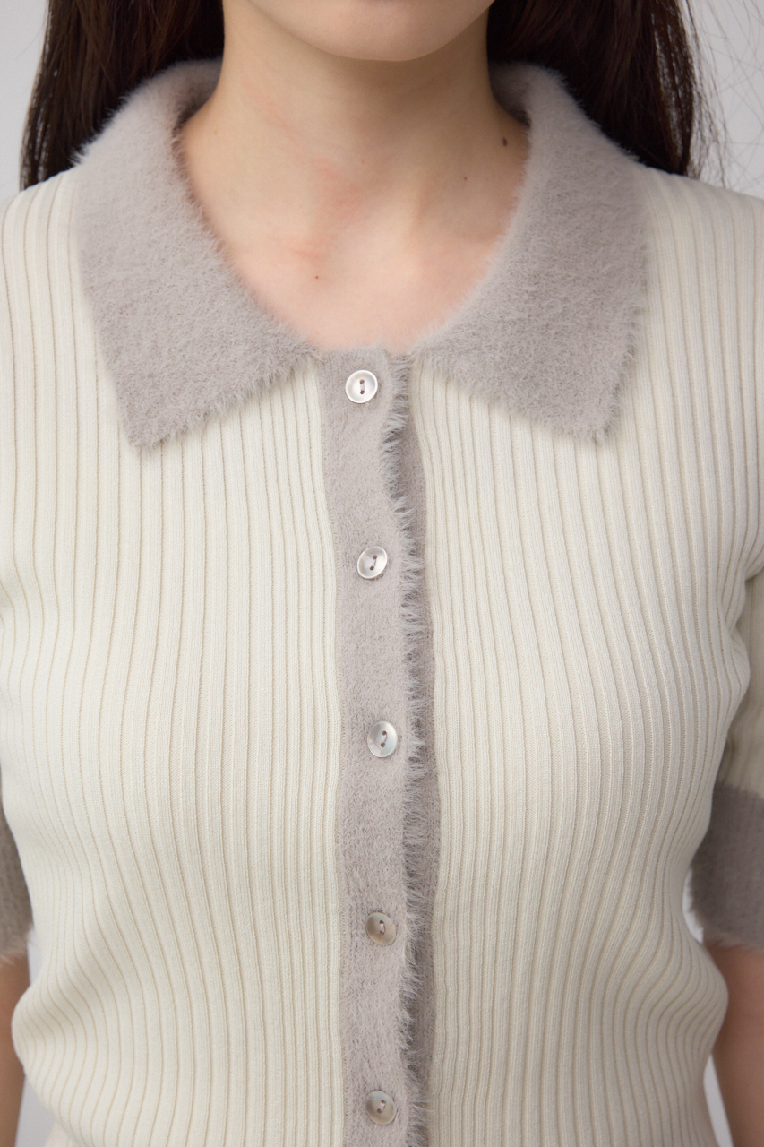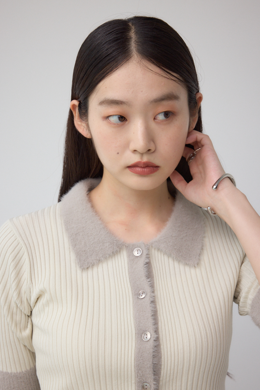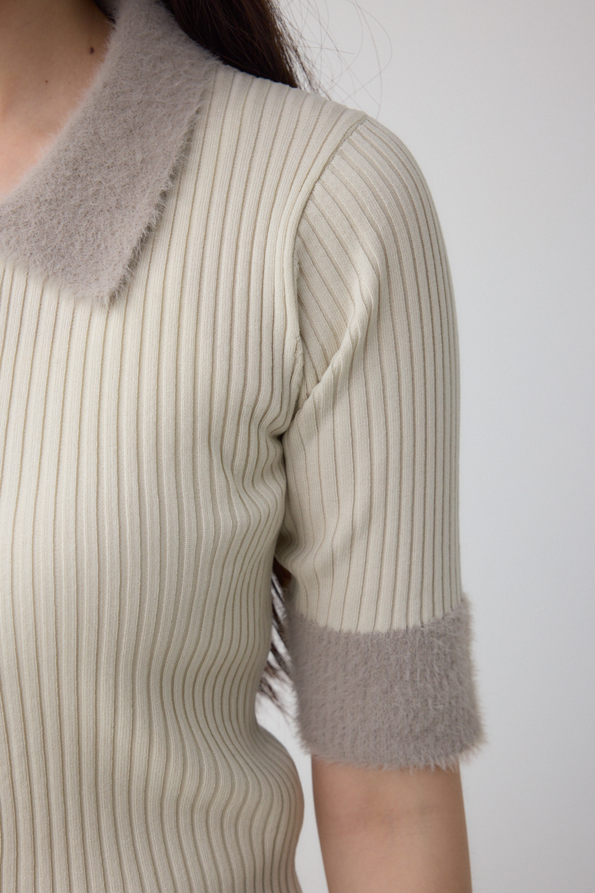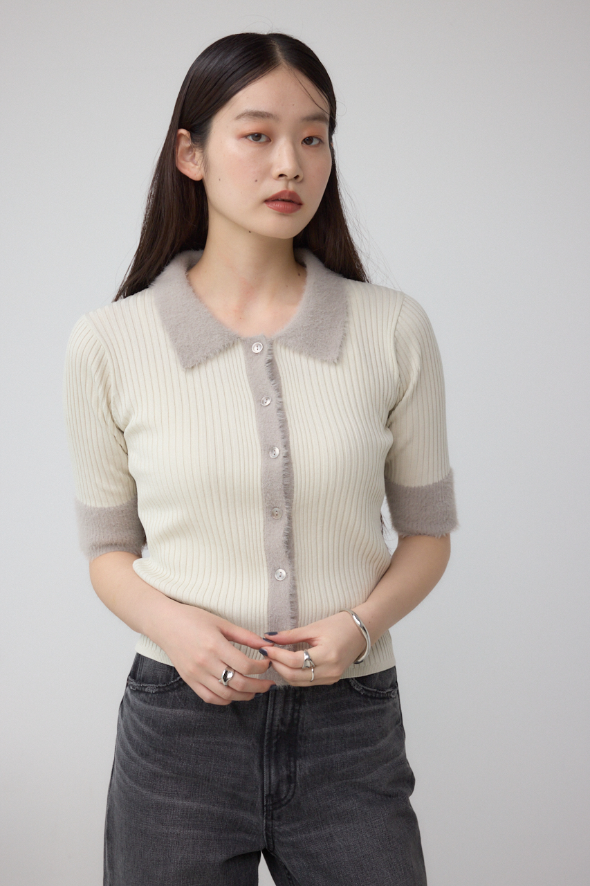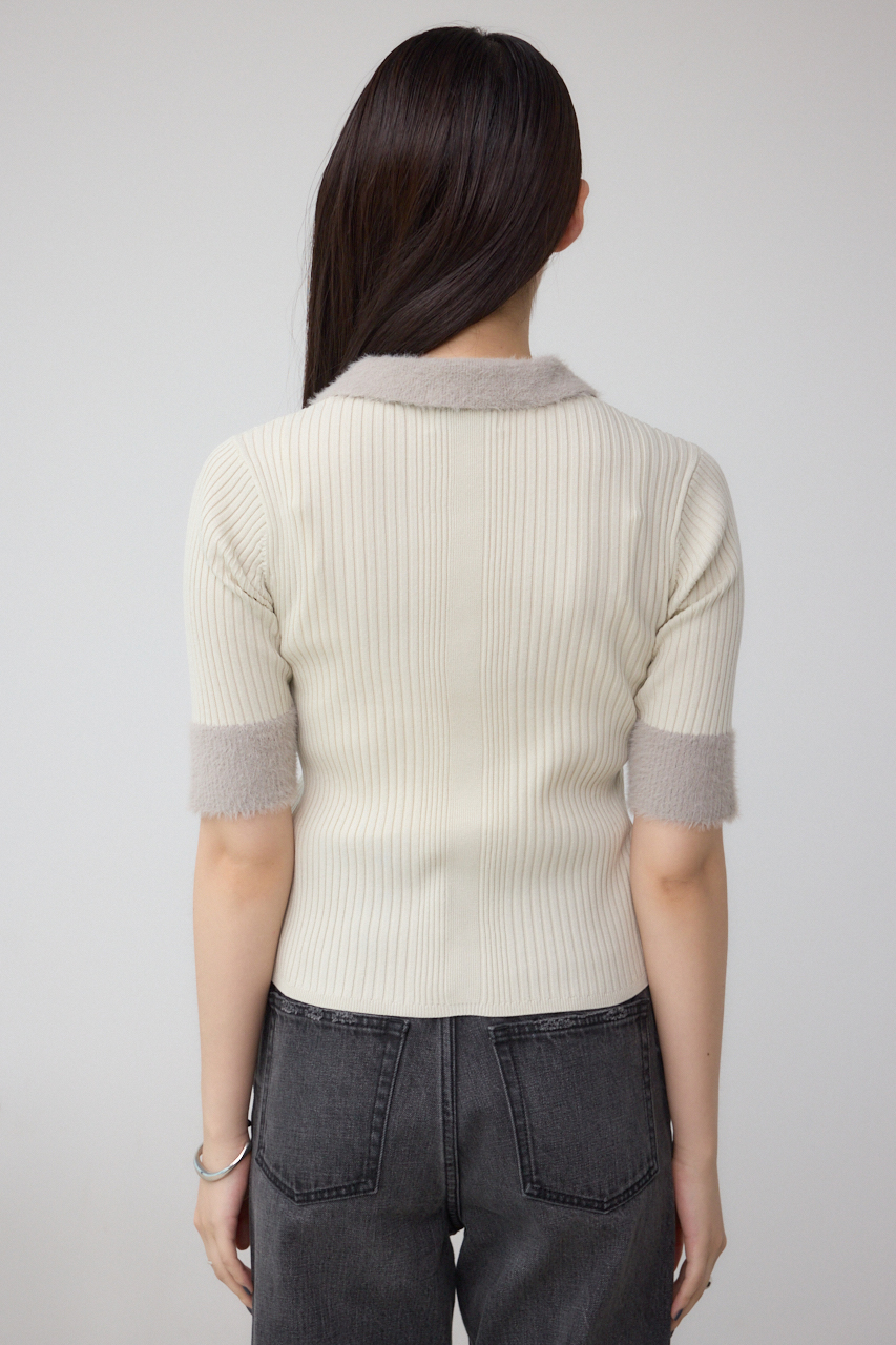 シャギー素材のコンビネーションがポイントのポロカラーニットです。