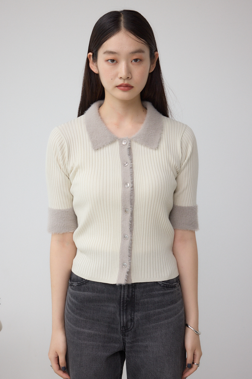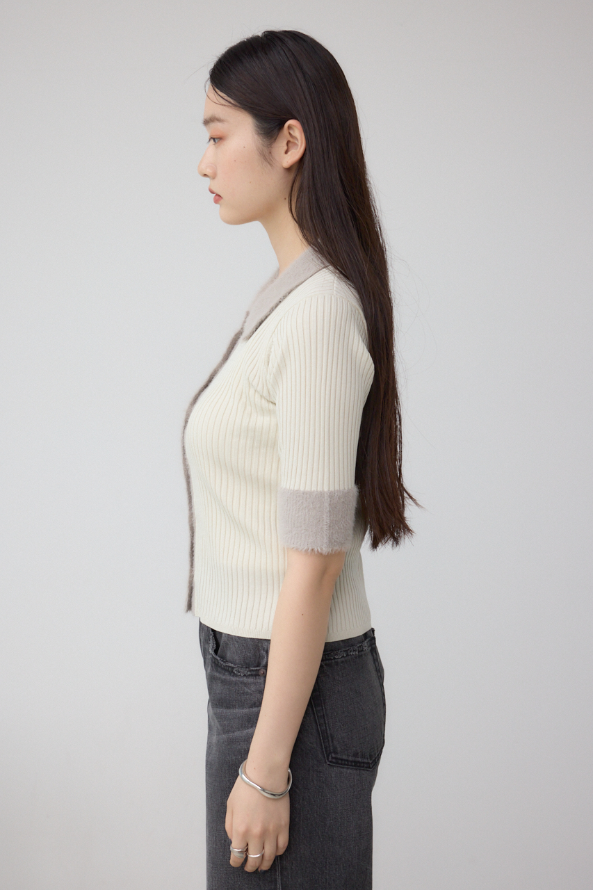 本体はさらっとした風合いの糸をランダムピッチのリブ編みに、襟と前立て、袖口は毛足のあるシャギー糸で作成し、本体で襟と違う表情の色を組み合わせています。