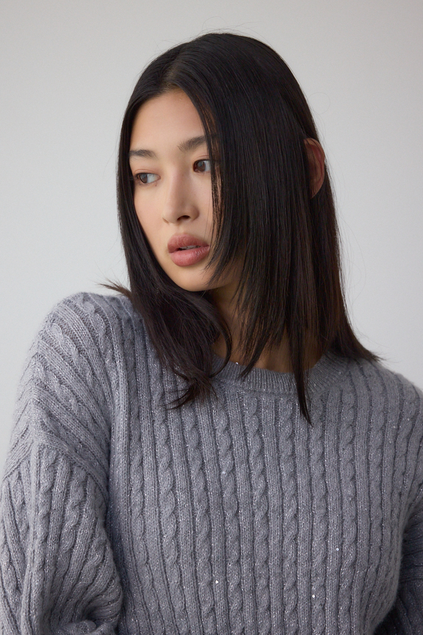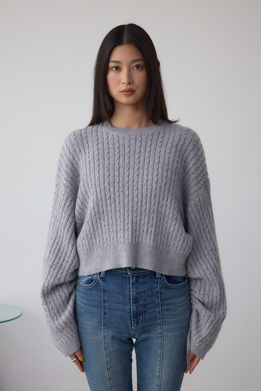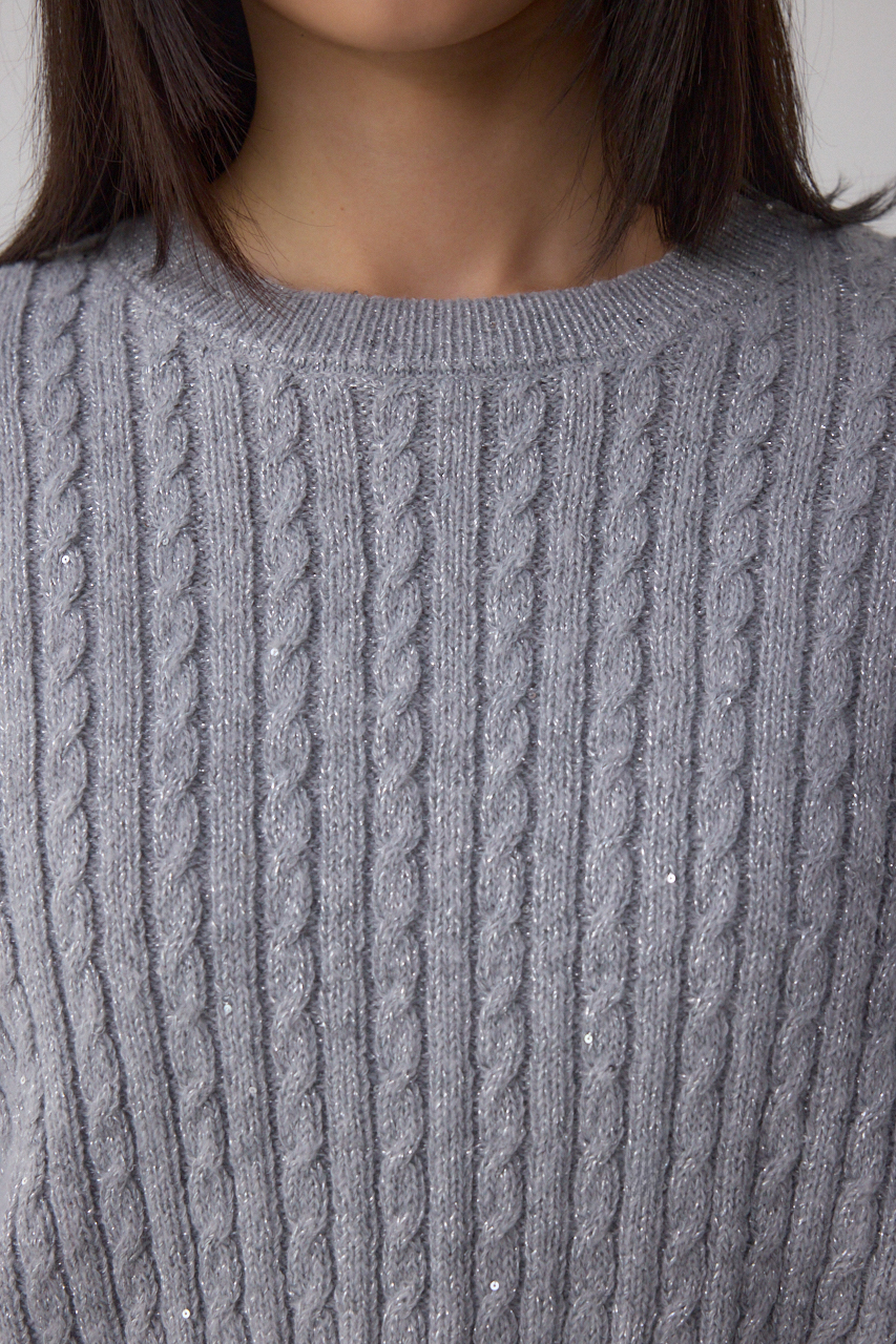 ラメ入りの少し毛足のある糸とスパンコール入りの糸を掛け合わせたニット素材。