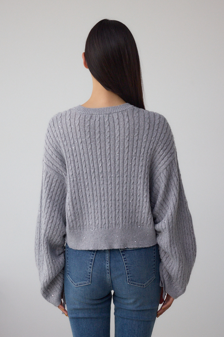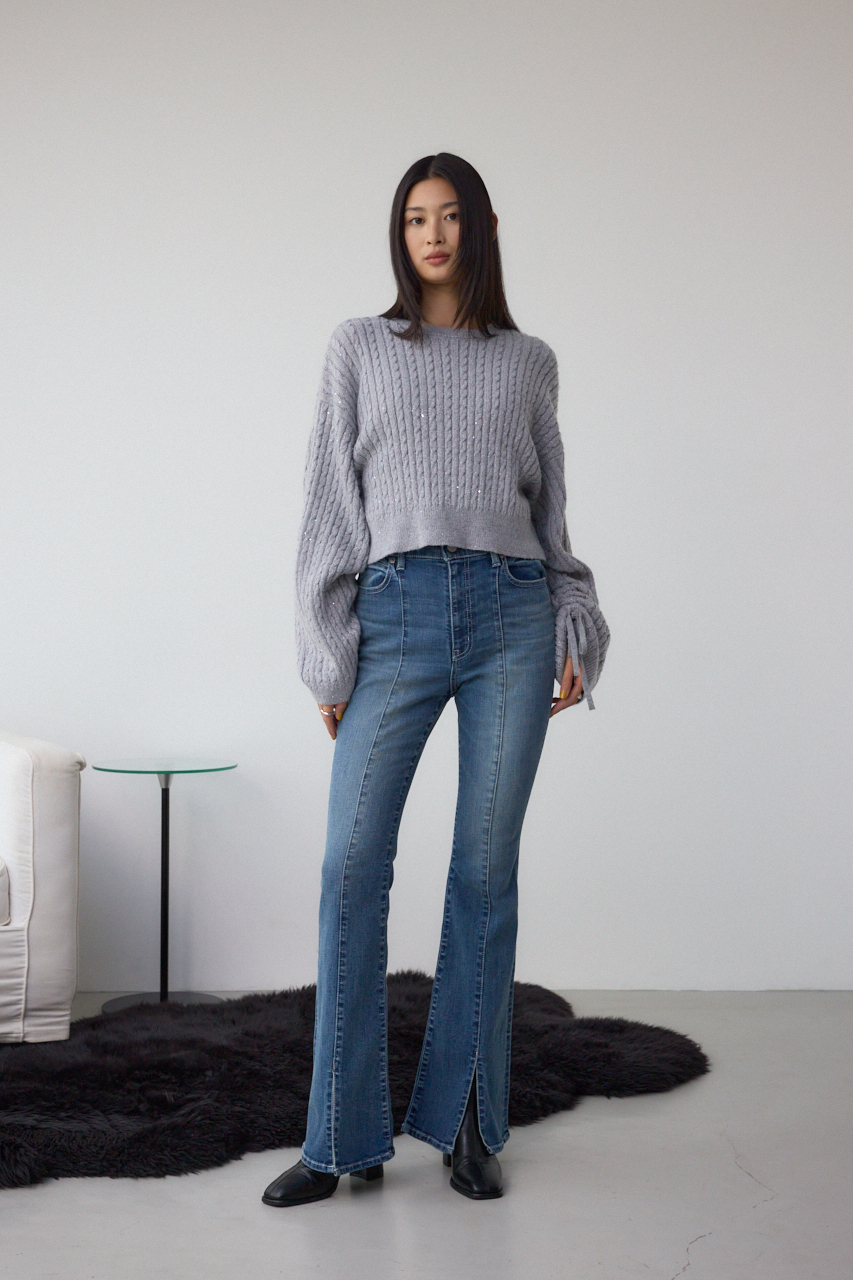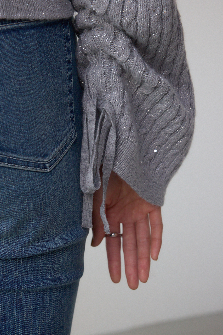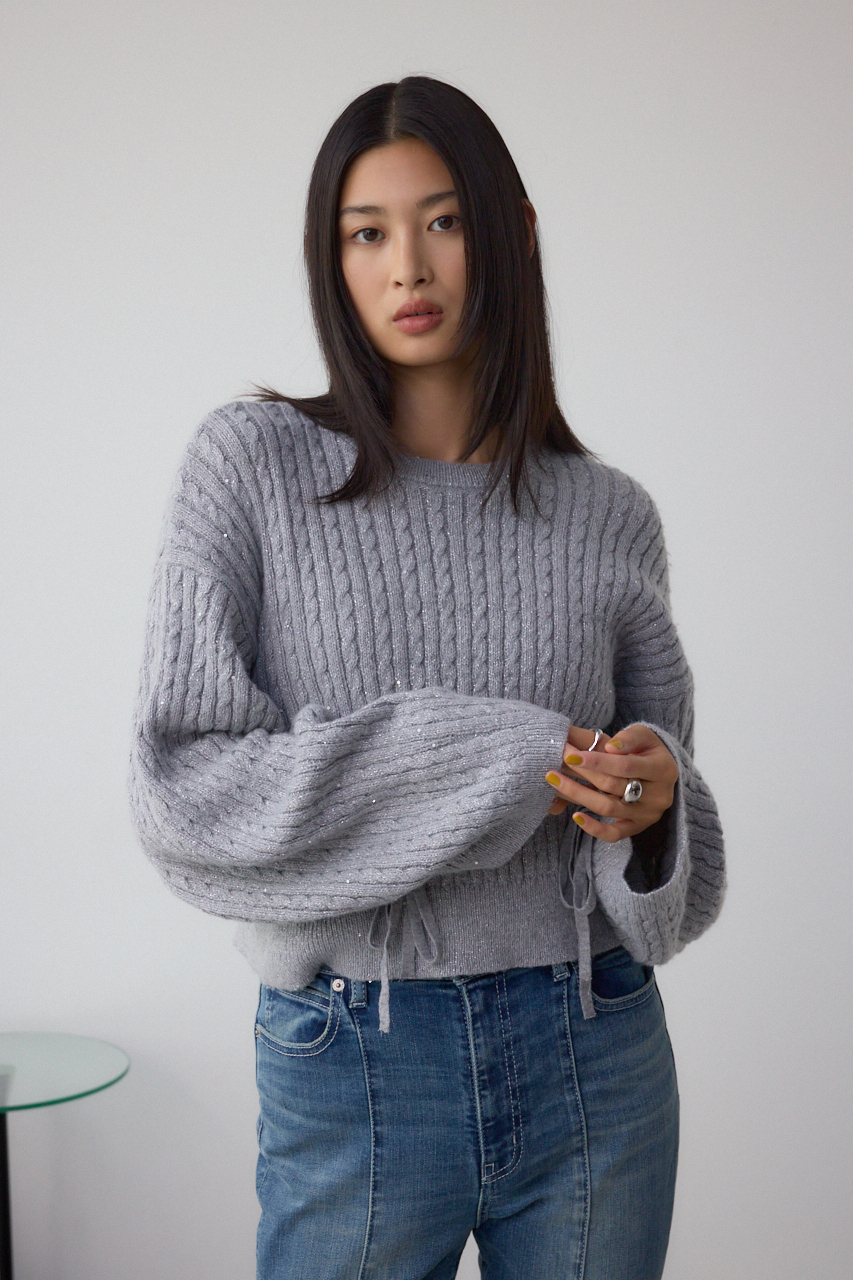 大胆な袖のドロストデザインとボリューム感のある袖が目を惹くニットです。