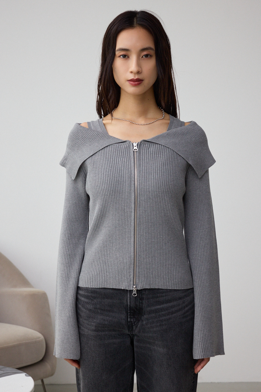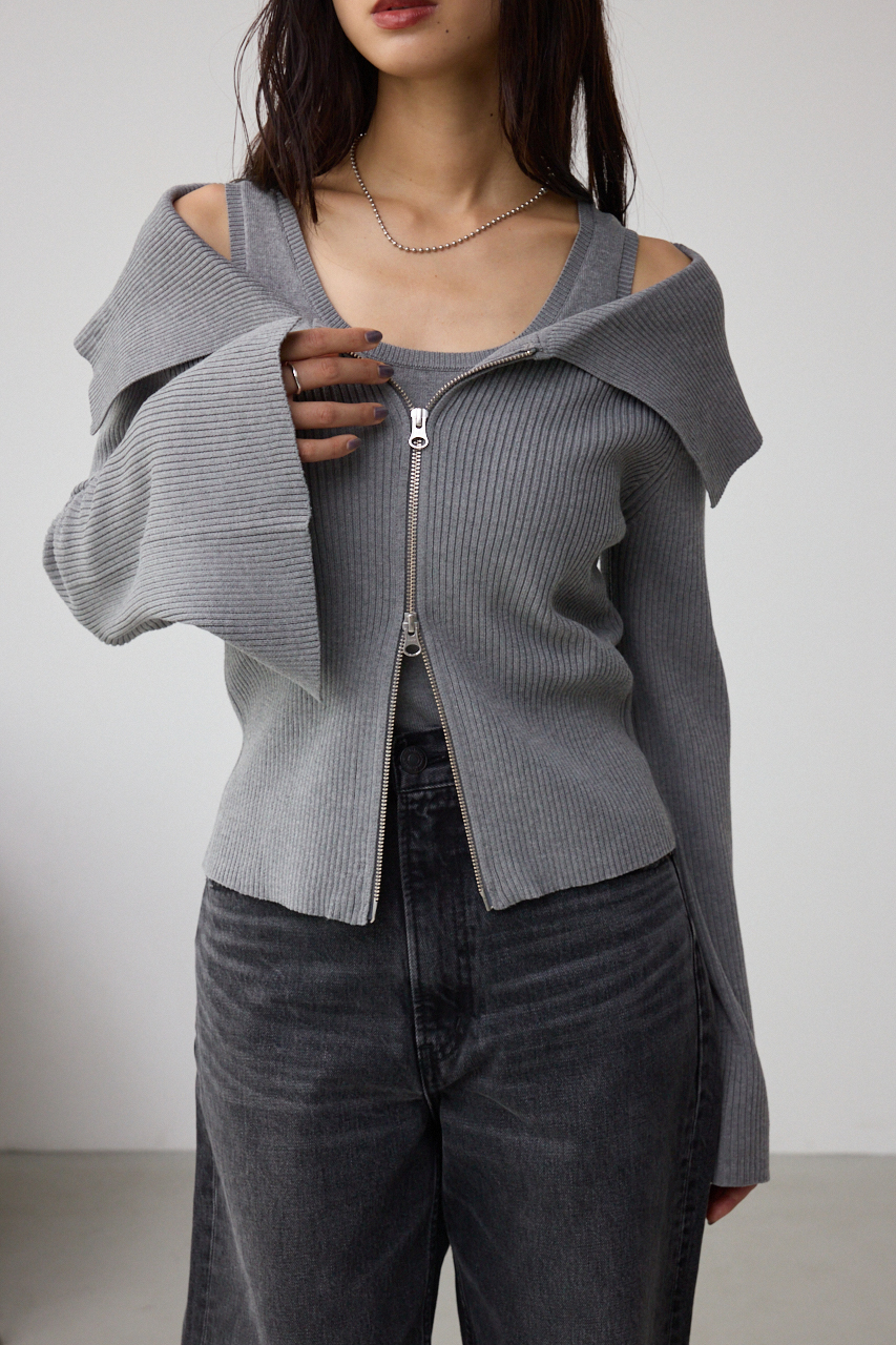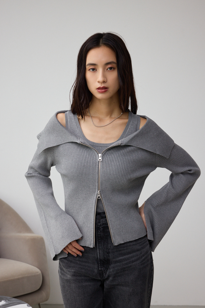 インナーのニットタンクとビッグカラーのジップカーディガンがセットになったデザイントップスです。