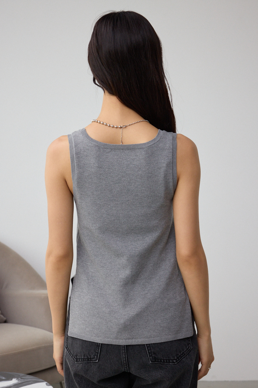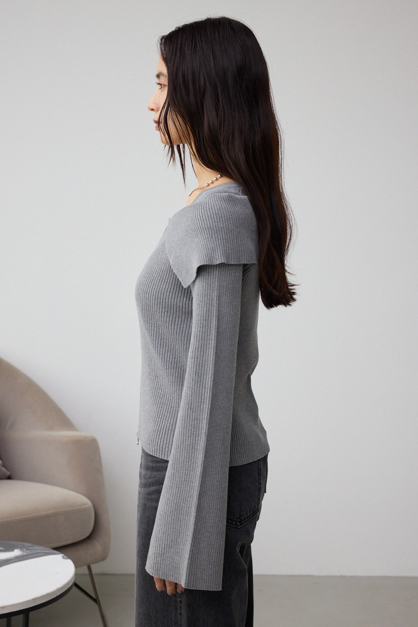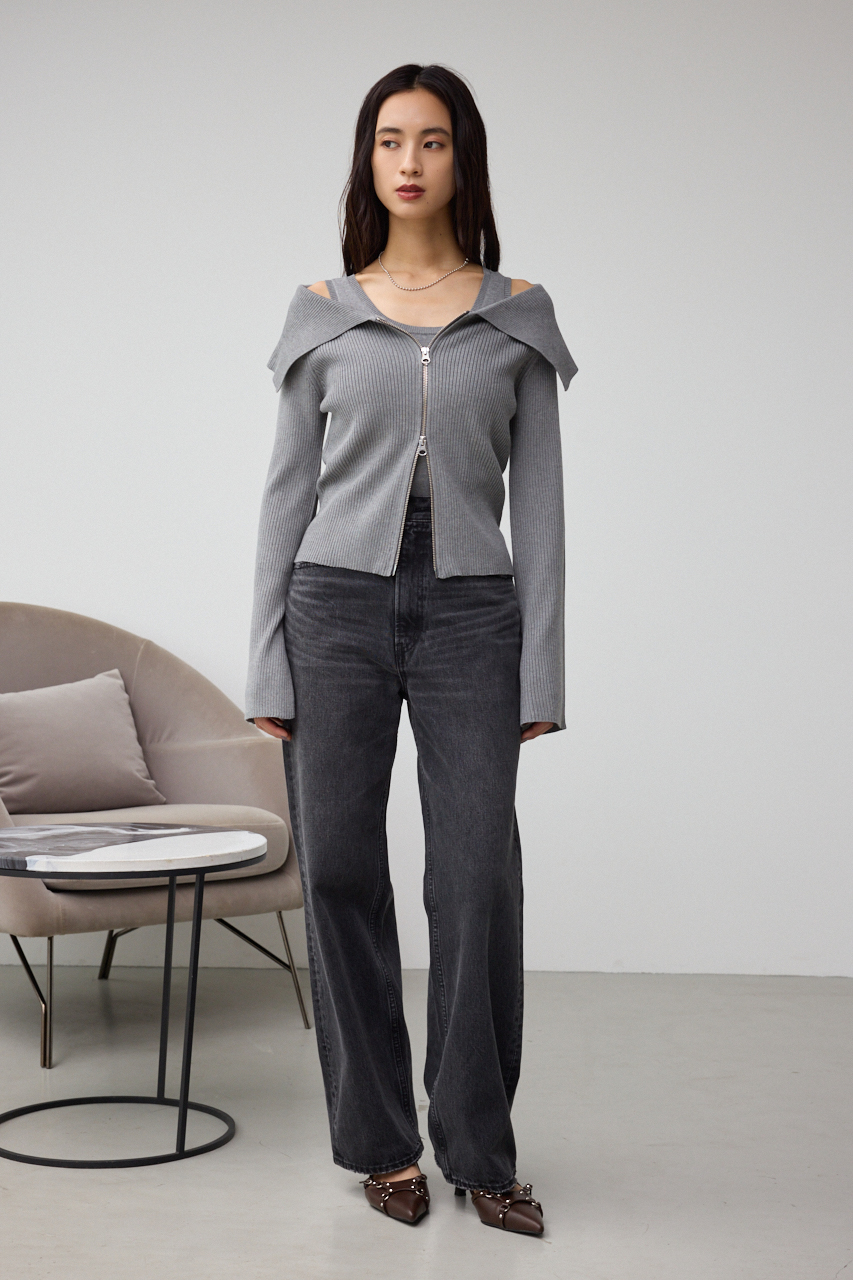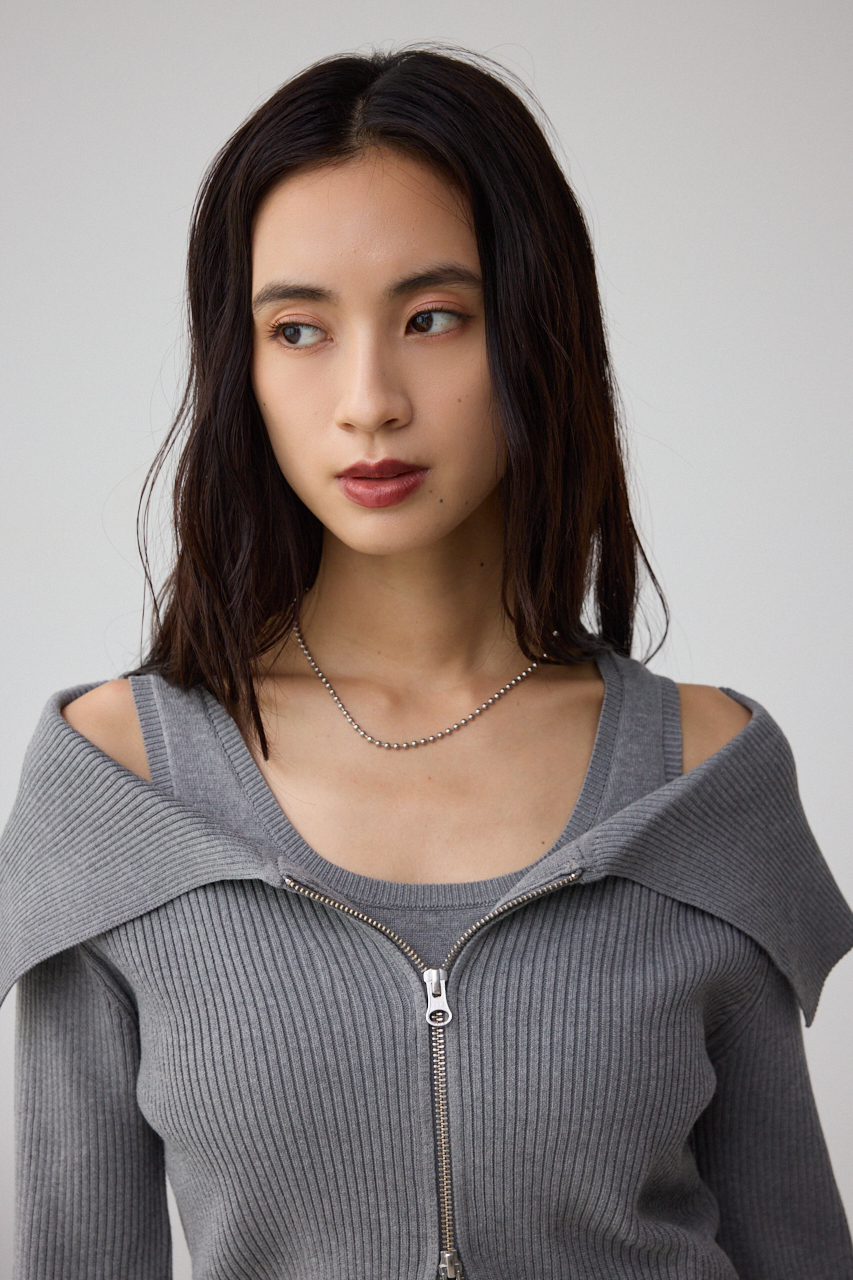 インナーのニットタンクとビッグカラーのジップカーディガンがセットになったデザイントップスです。