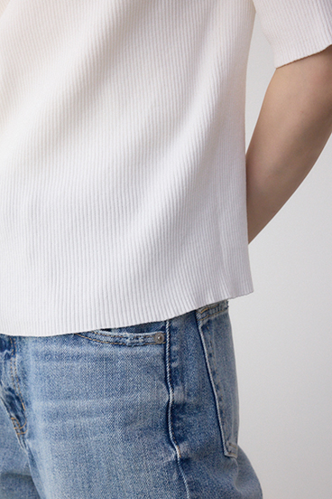 レーヨン糸にポリエステル糸を織り交ぜ、ドライタッチに編みたてたリブニット。