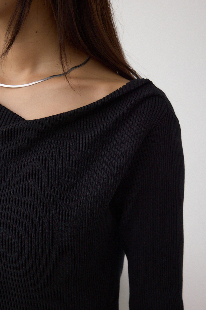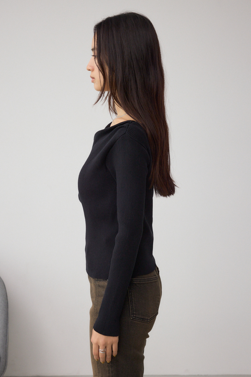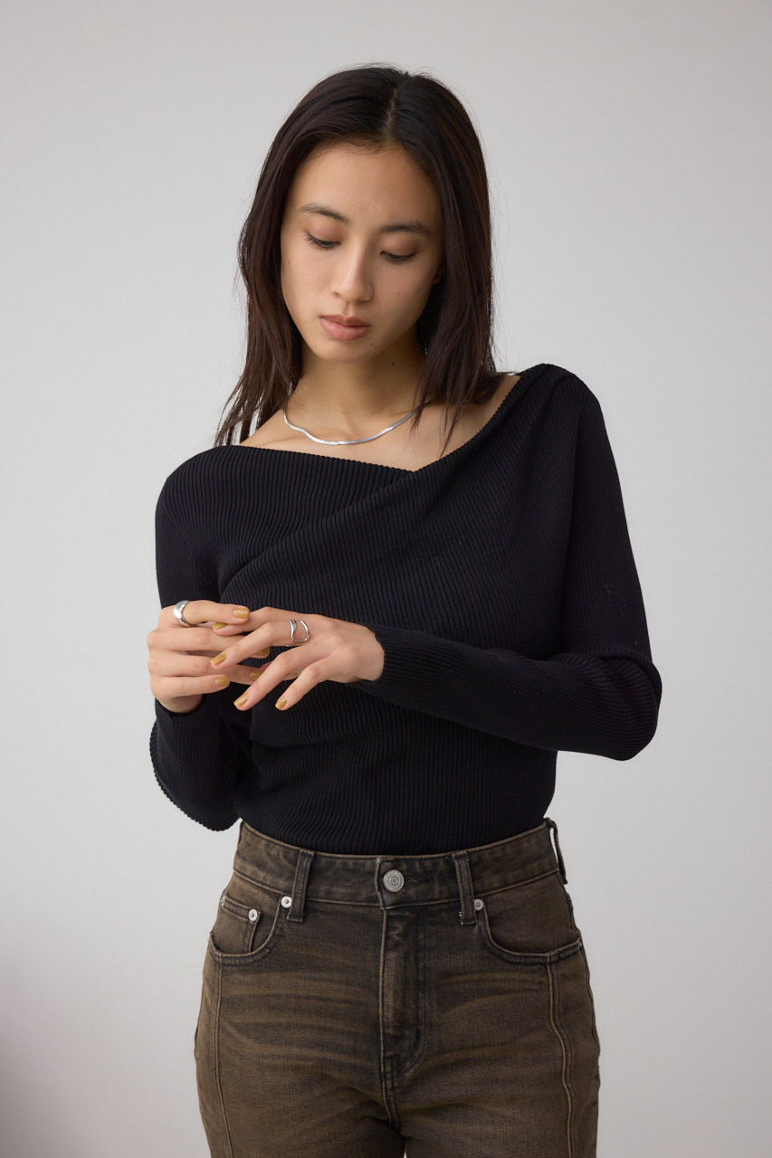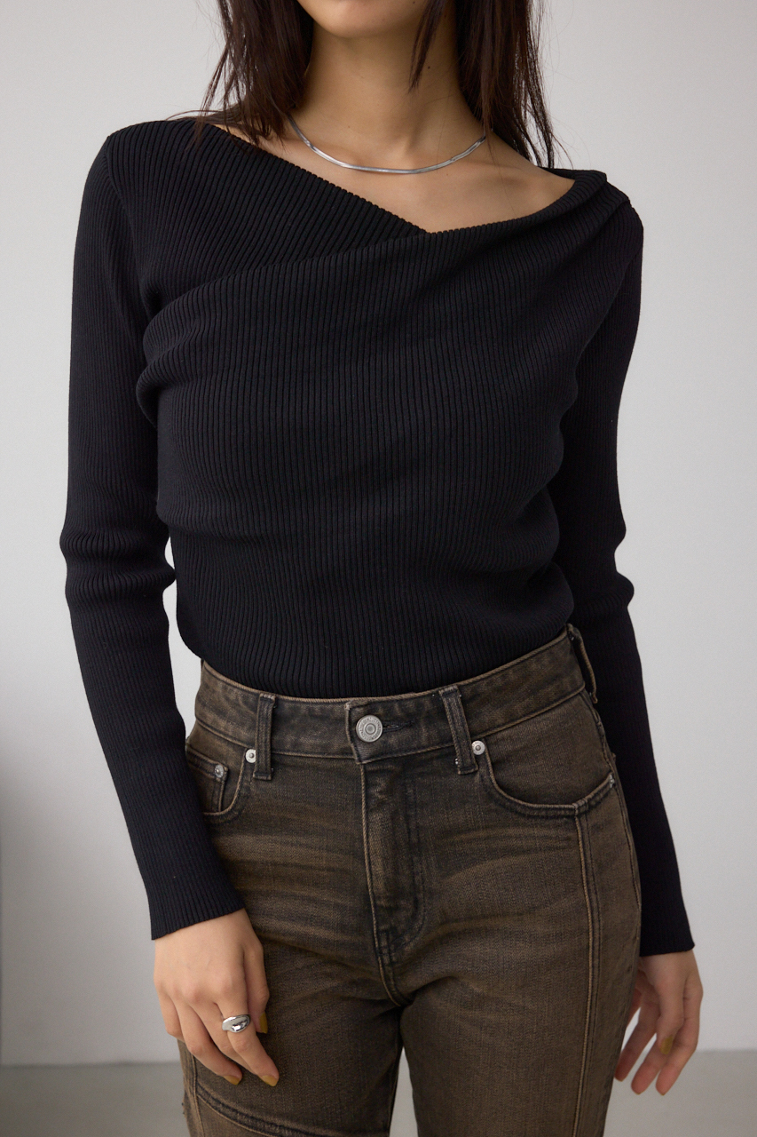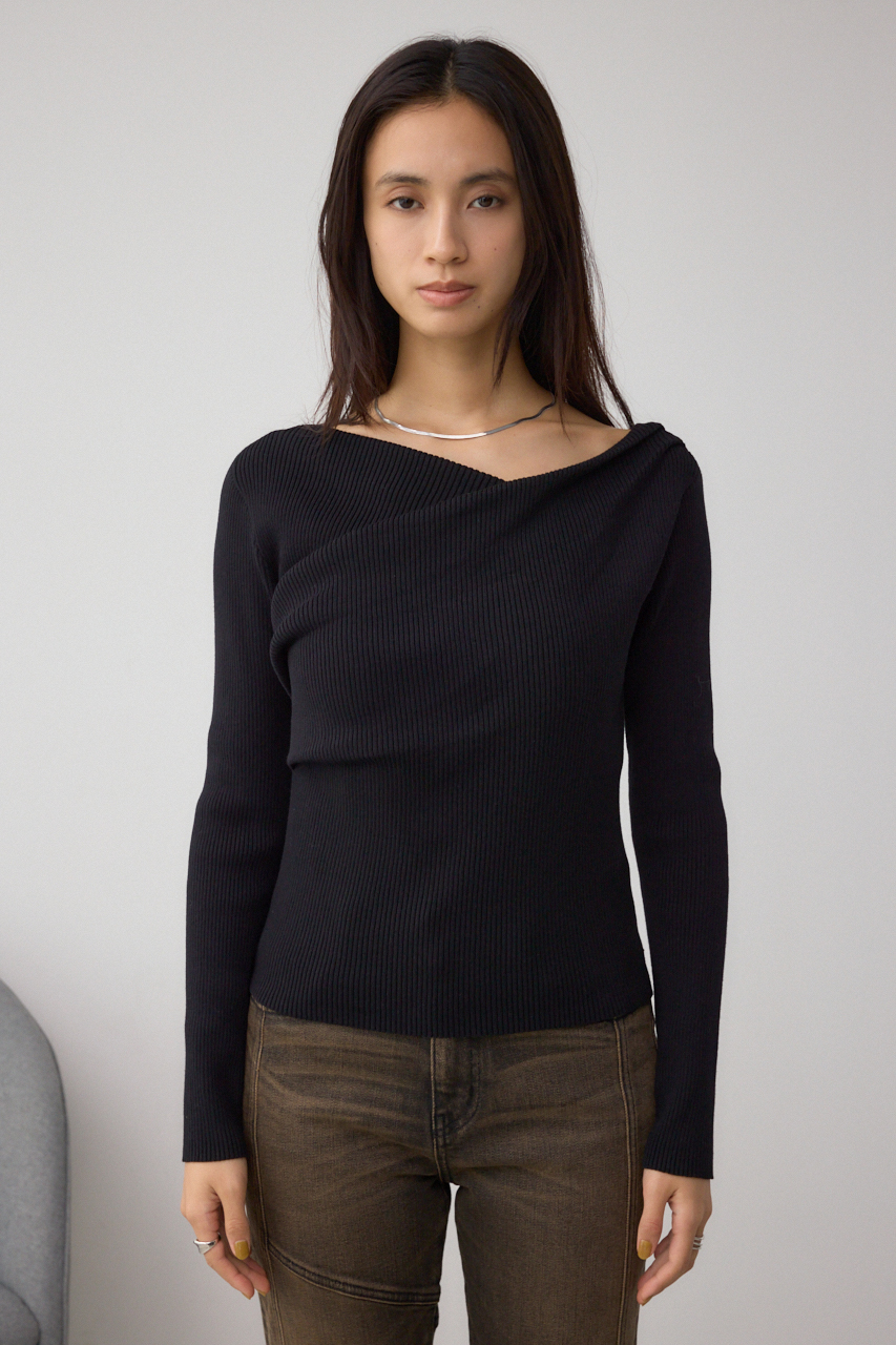 前身頃にアシンメトリーなドレープを入れたデザインのドライタッチなリブニット。