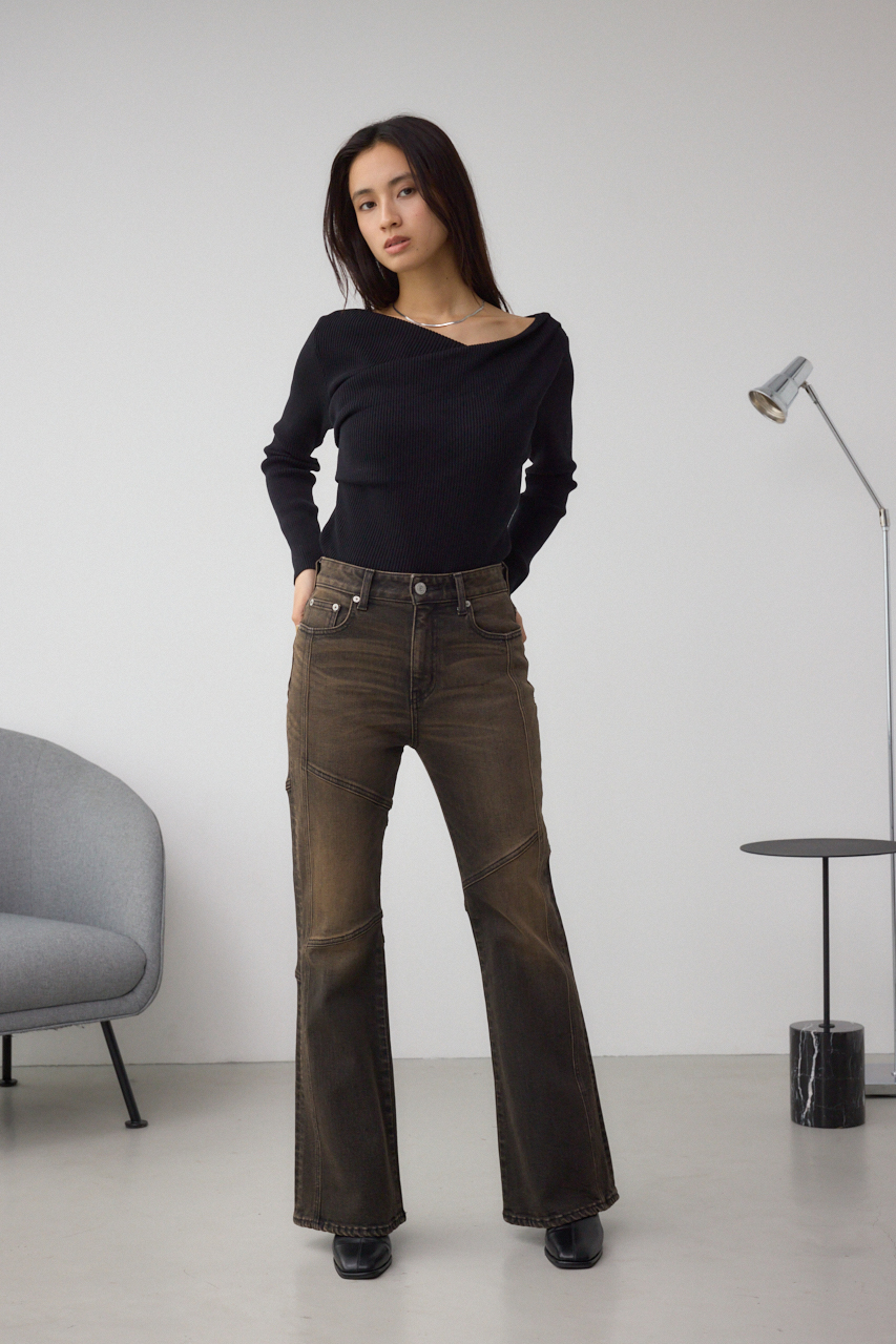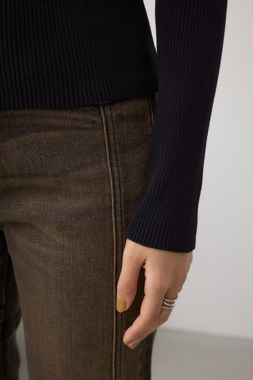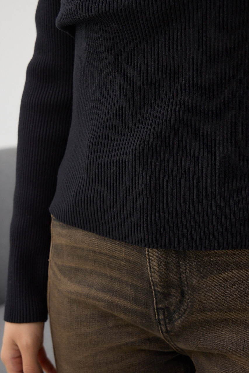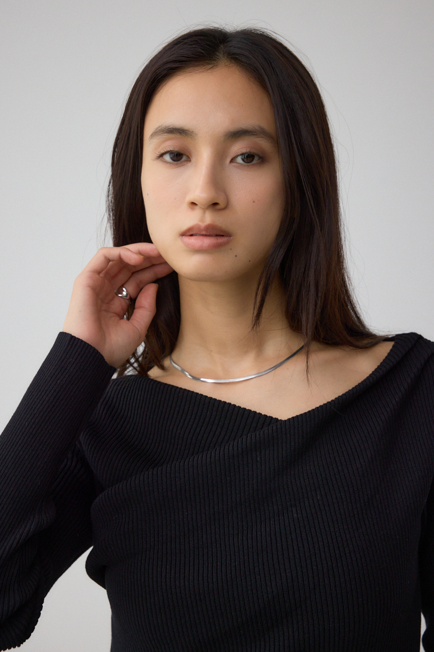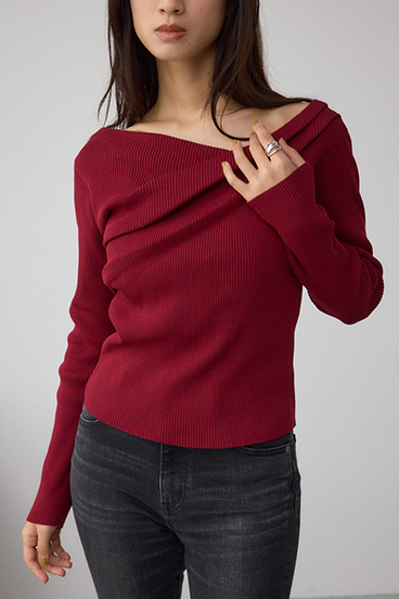 前身頃にアシンメトリーなドレープを入れたデザインのドライタッチなリブニット。