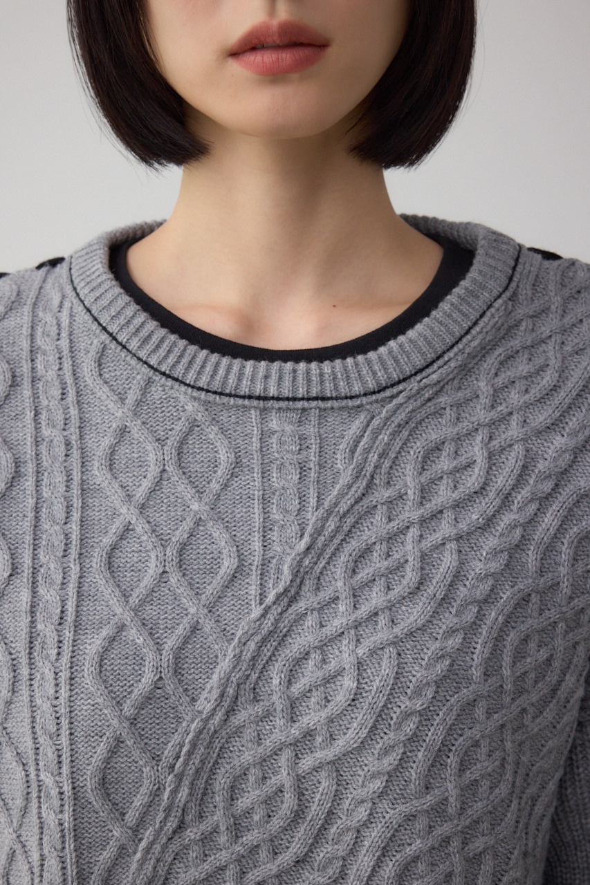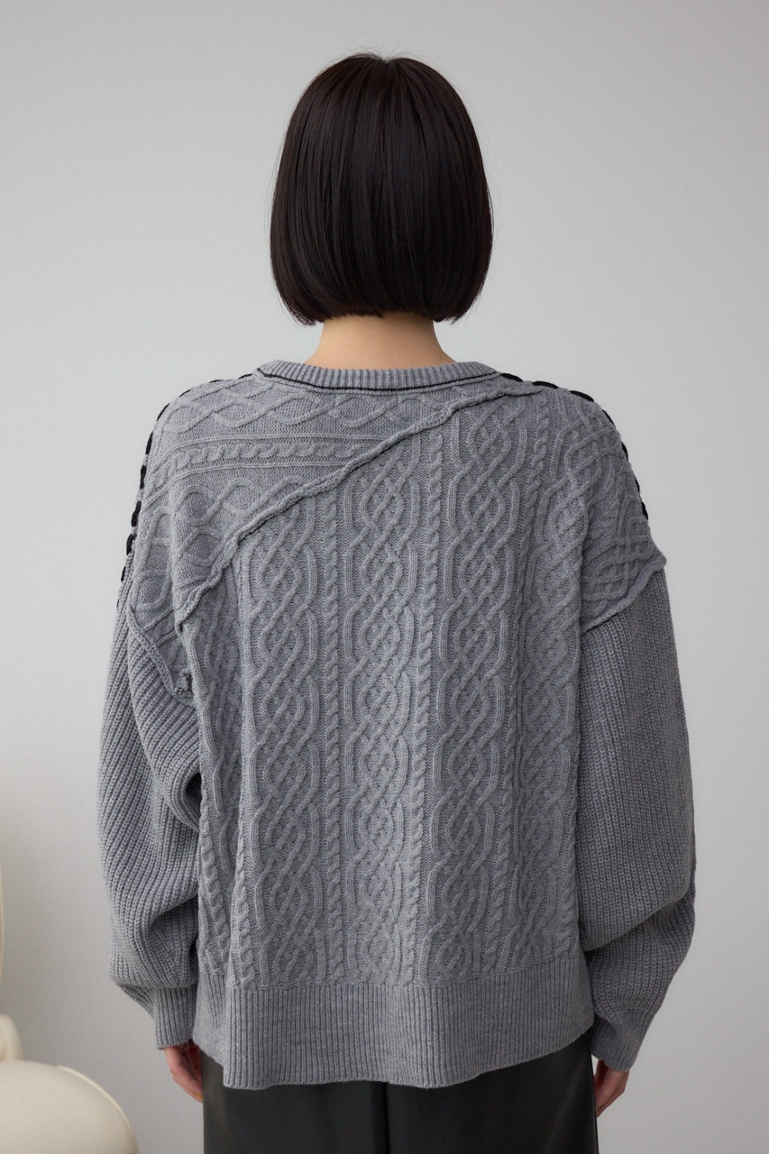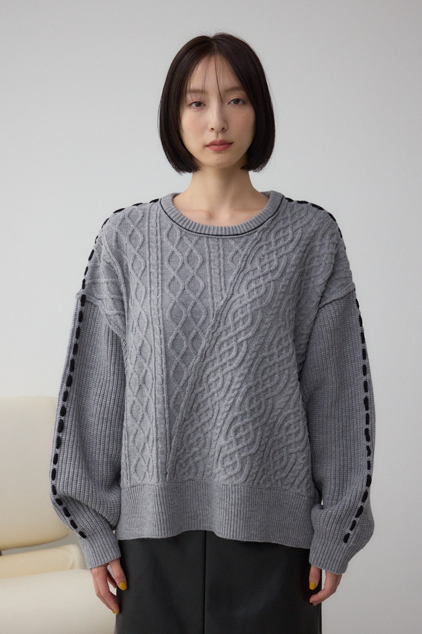 ケーブル柄をパッチワークのように配置したデザインのニットトップス。