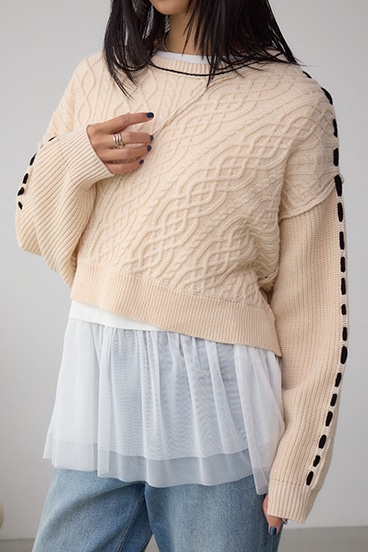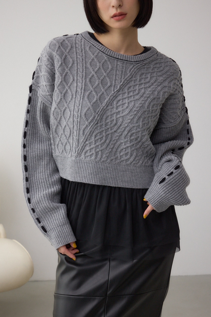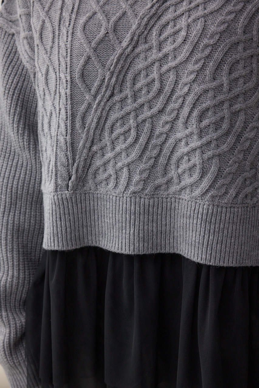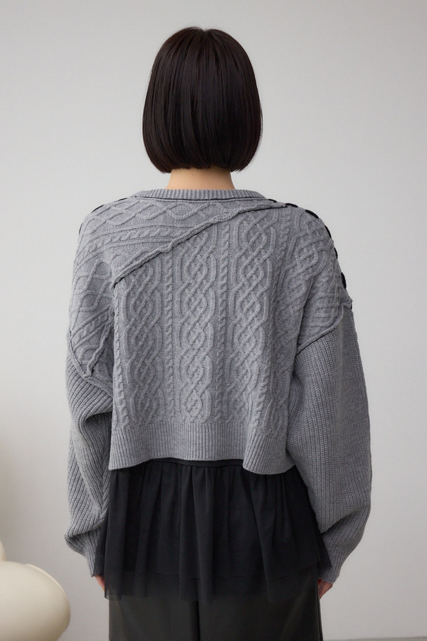 ケーブル柄をパッチワークのように配置したデザインのニットトップス。
