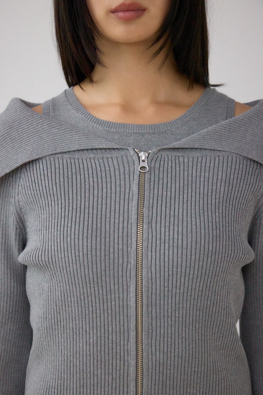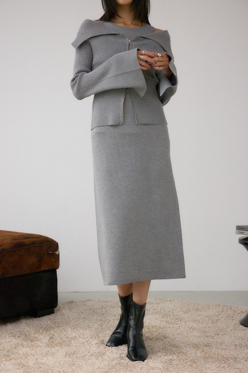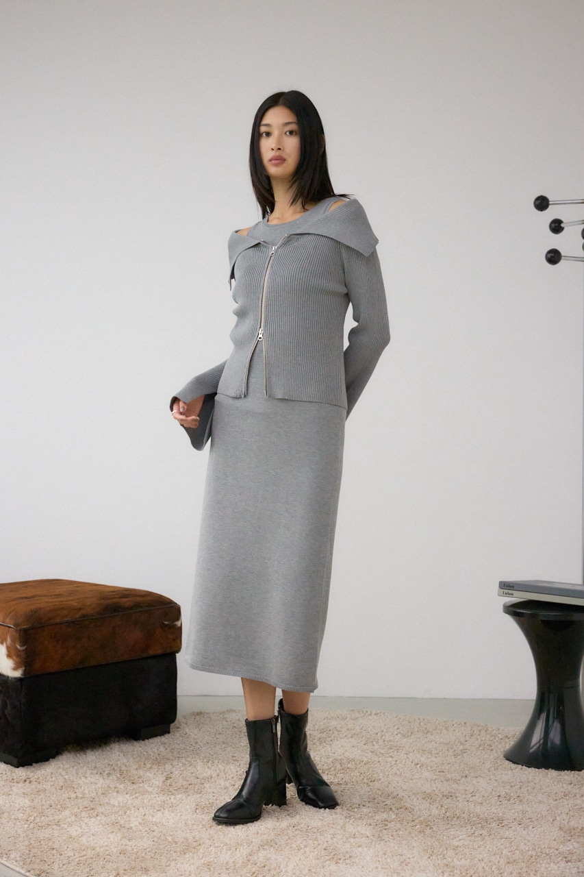 ニットタンクとビッグカラーのジップカーディガンがセットになった、セットで着られるレイヤードワンピースです。
