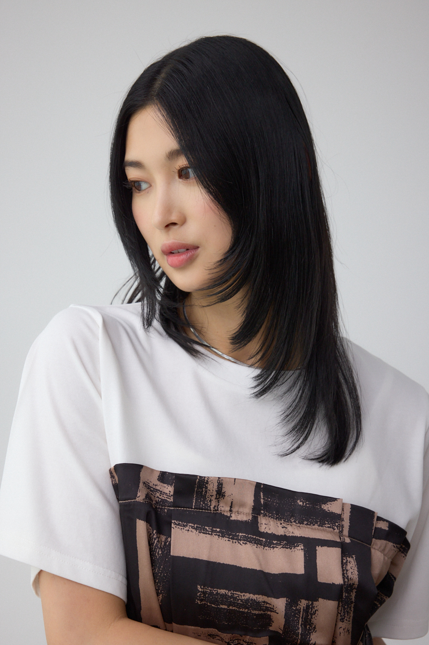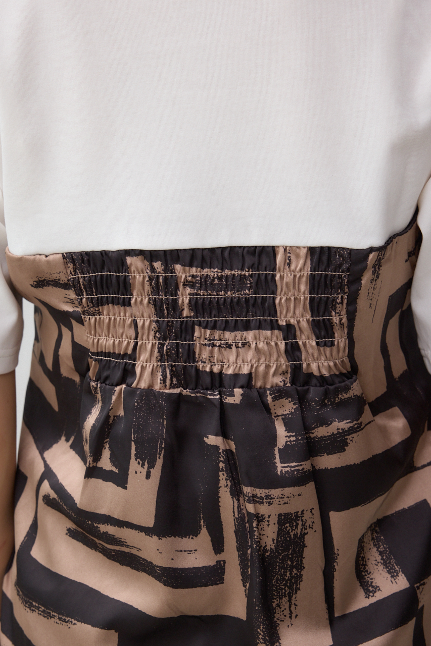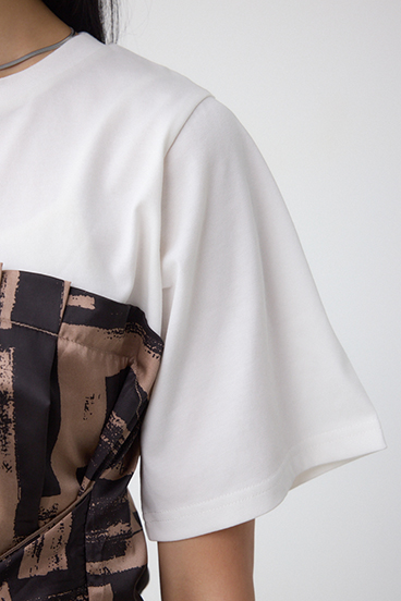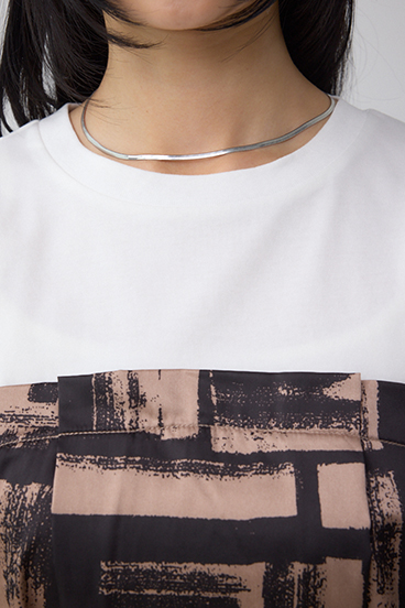 綿にポリエステル糸をプレーティングし、表面感をきれいに仕上げた天竺生地と大判柄でスカーフのような素材を使用しています。