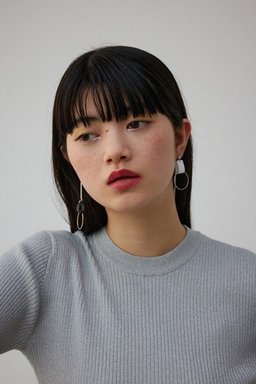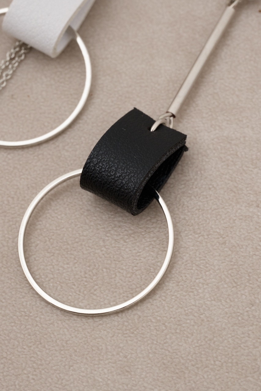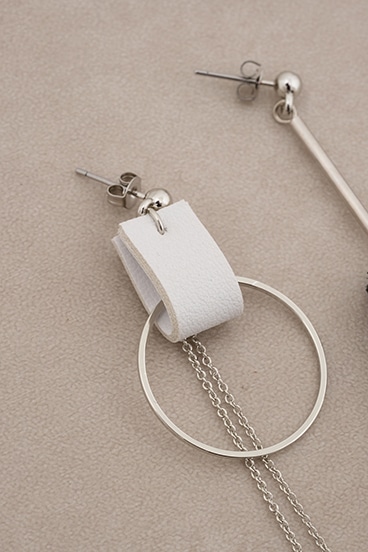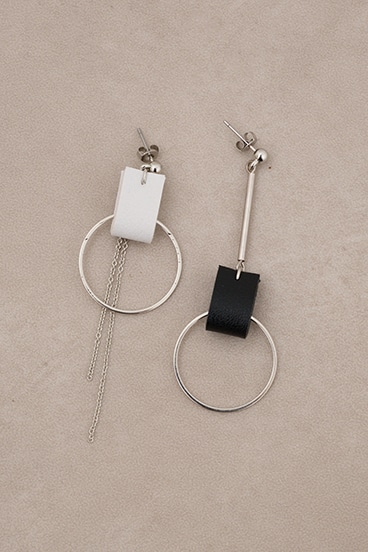 コントラストの効いたカラー使いのレザーにメタルパーツの組み合わせがポイントのピアス。