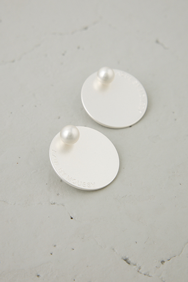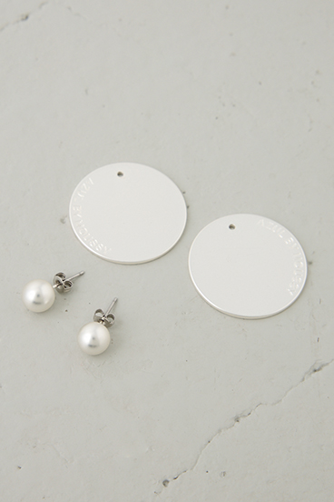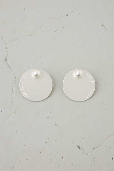 大ぶりなサークル型プレートにロゴをさりげなくあしらった、シンプルながらも存在感のあるピアス。