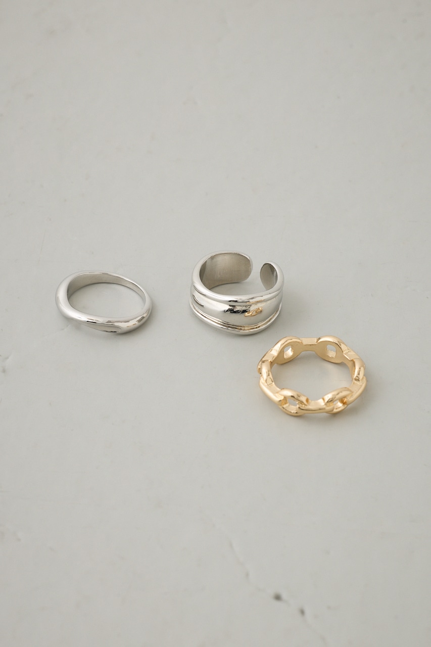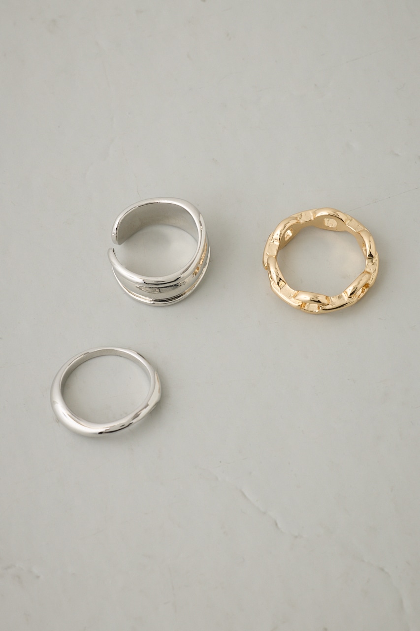 異なるデザインのリングを組み合わせた、1点使いも重ね付けも楽しめるトレンド感満載の3連セット。