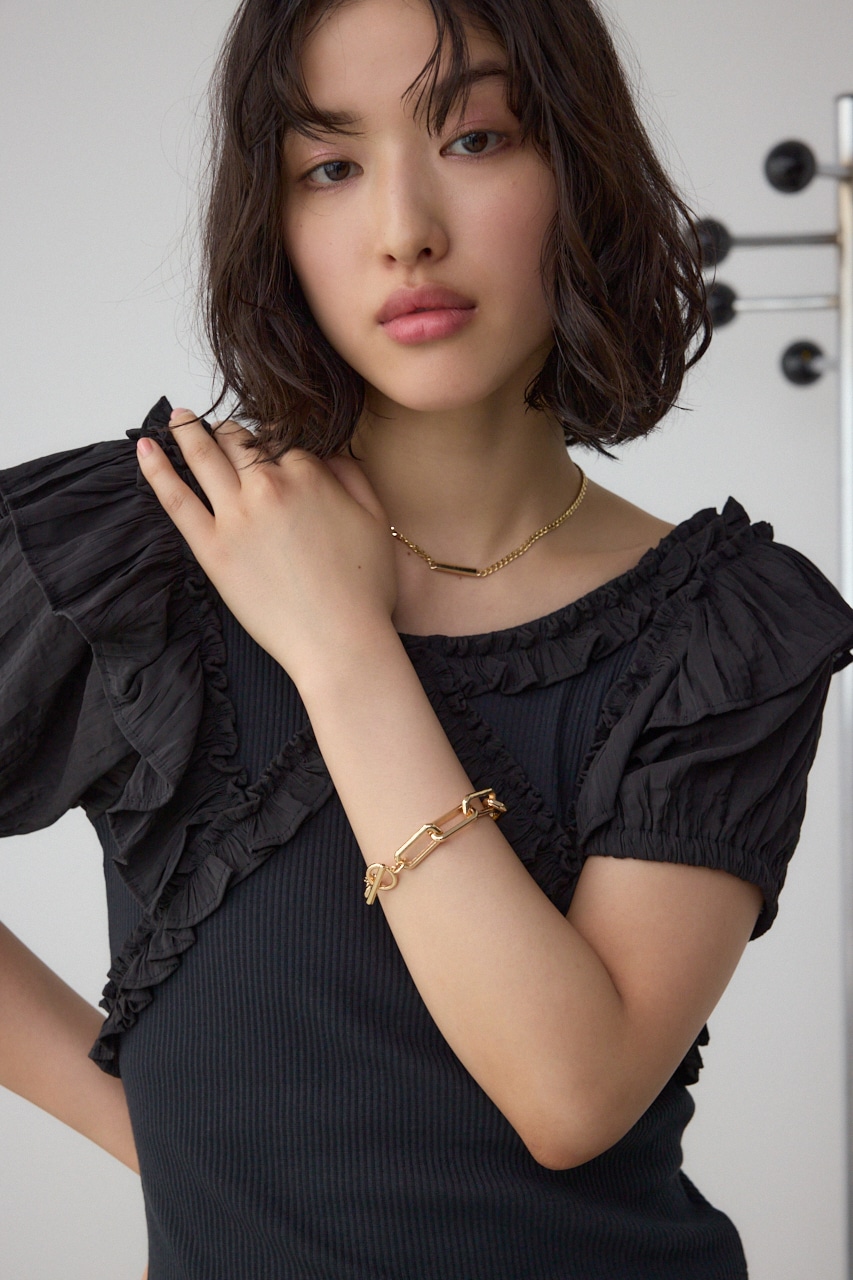 程よい太さのチェーンを連ねたブレスレットは、無駄を削がれたミニマルなデザインながら、しっかりとした存在感を放つアイテム。