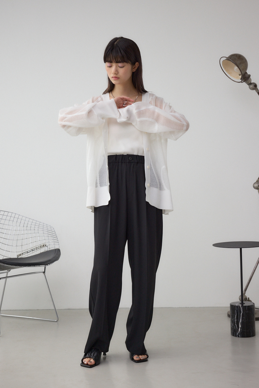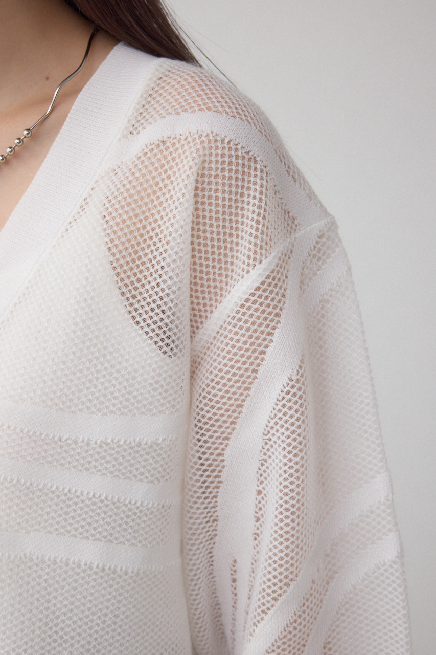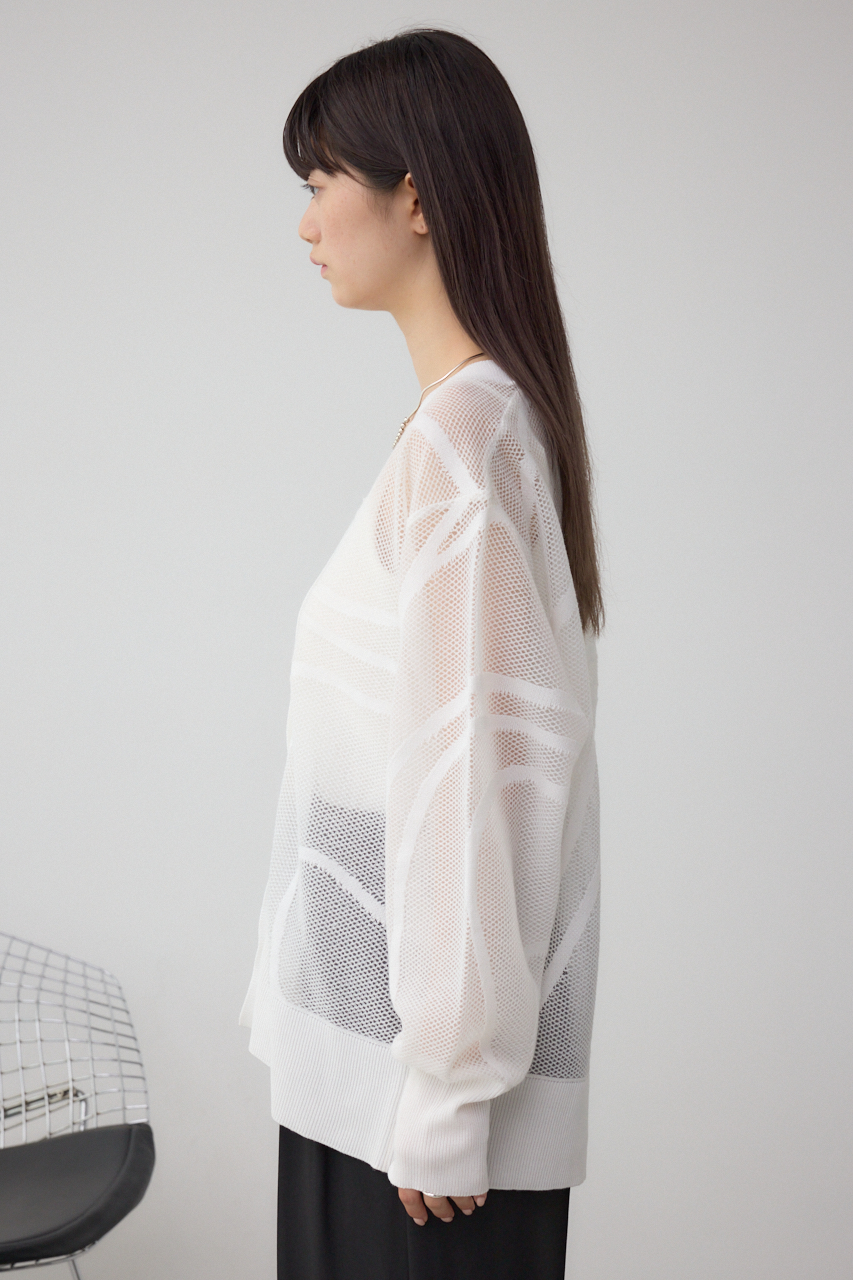 極細90番のポリエステル糸をプレーティングしてトレンドのシアー感と編柄の安定感を出しています。