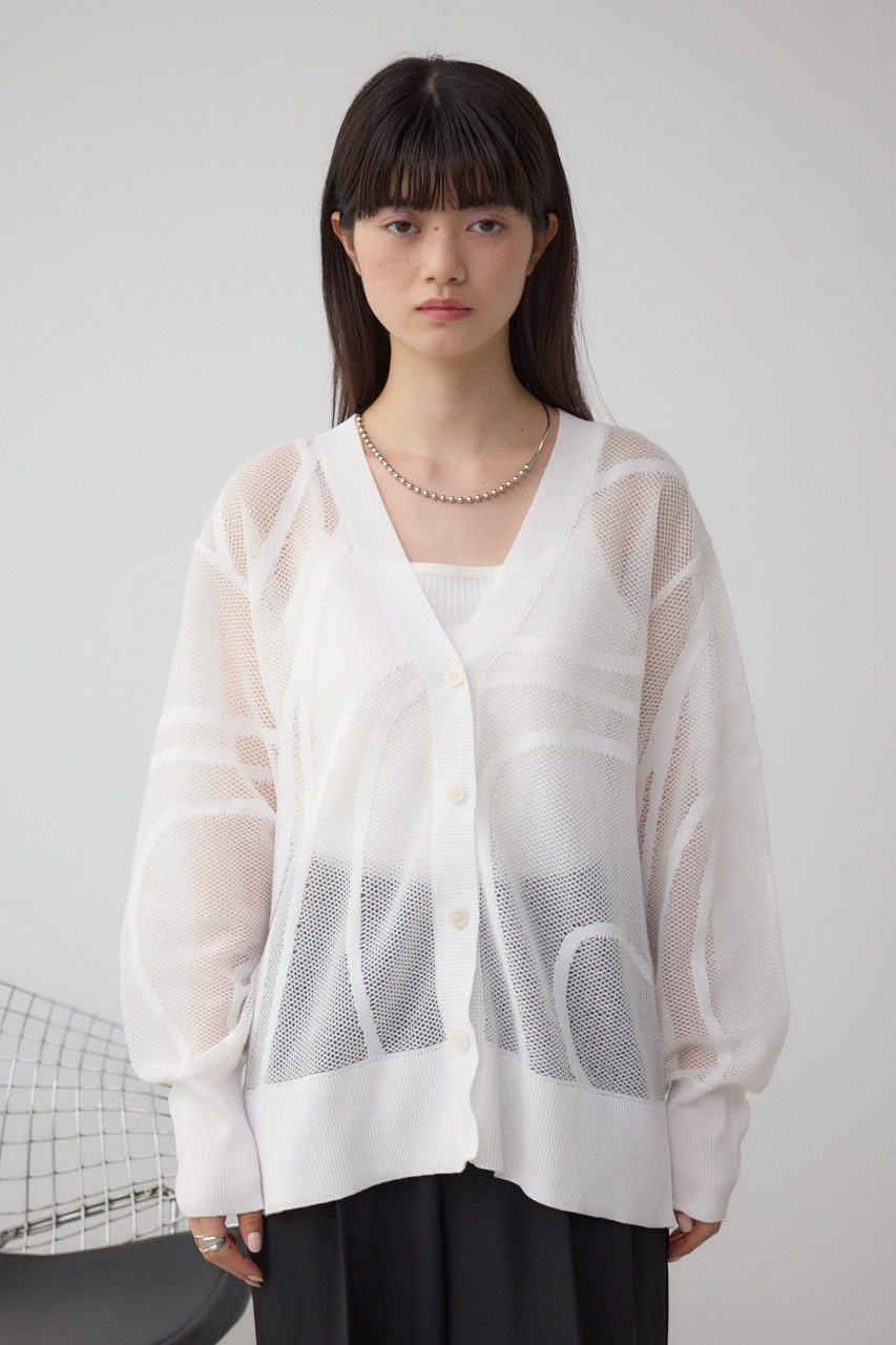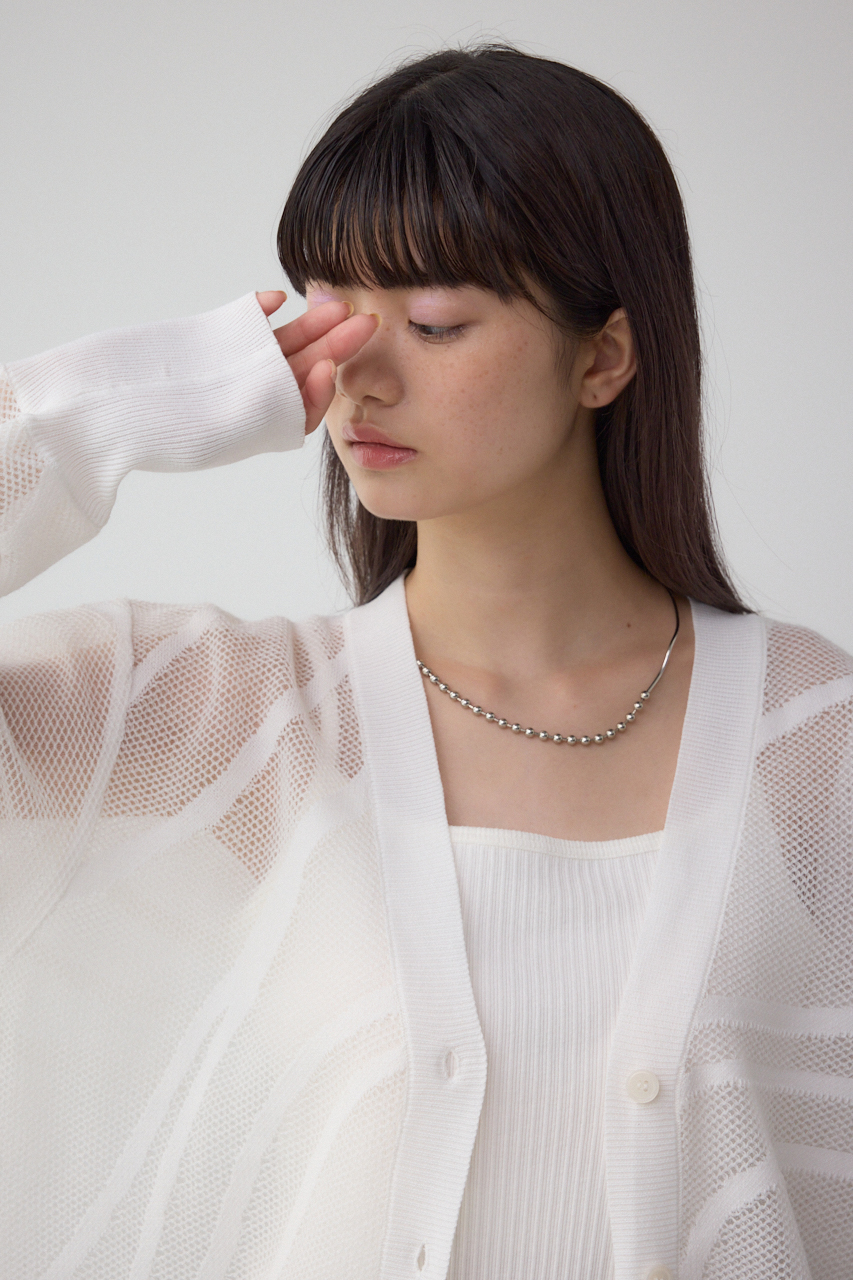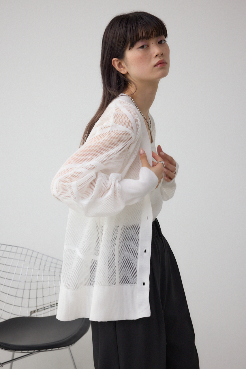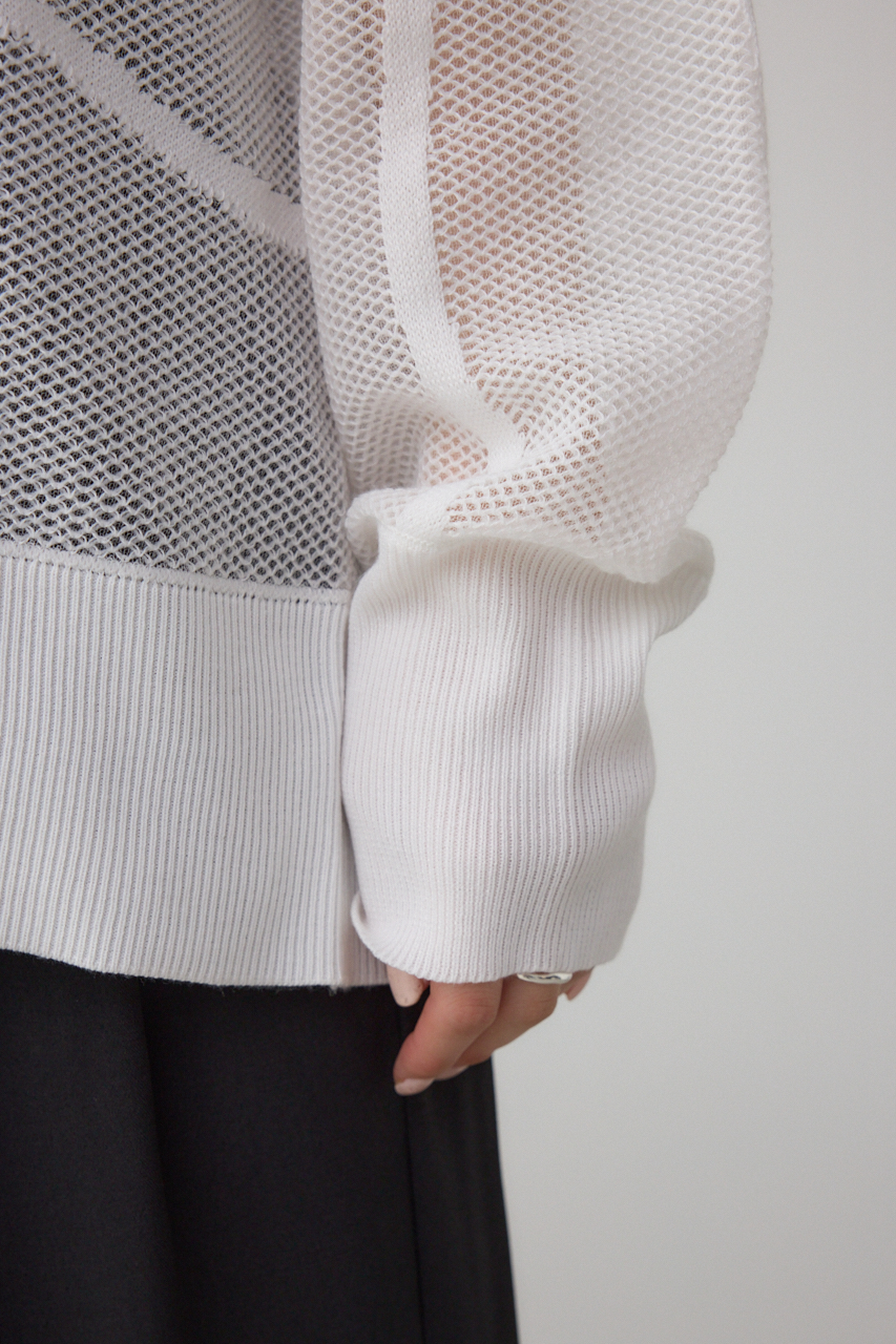 極細90番のポリエステル糸をプレーティングしてトレンドのシアー感と編柄の安定感を出しています。