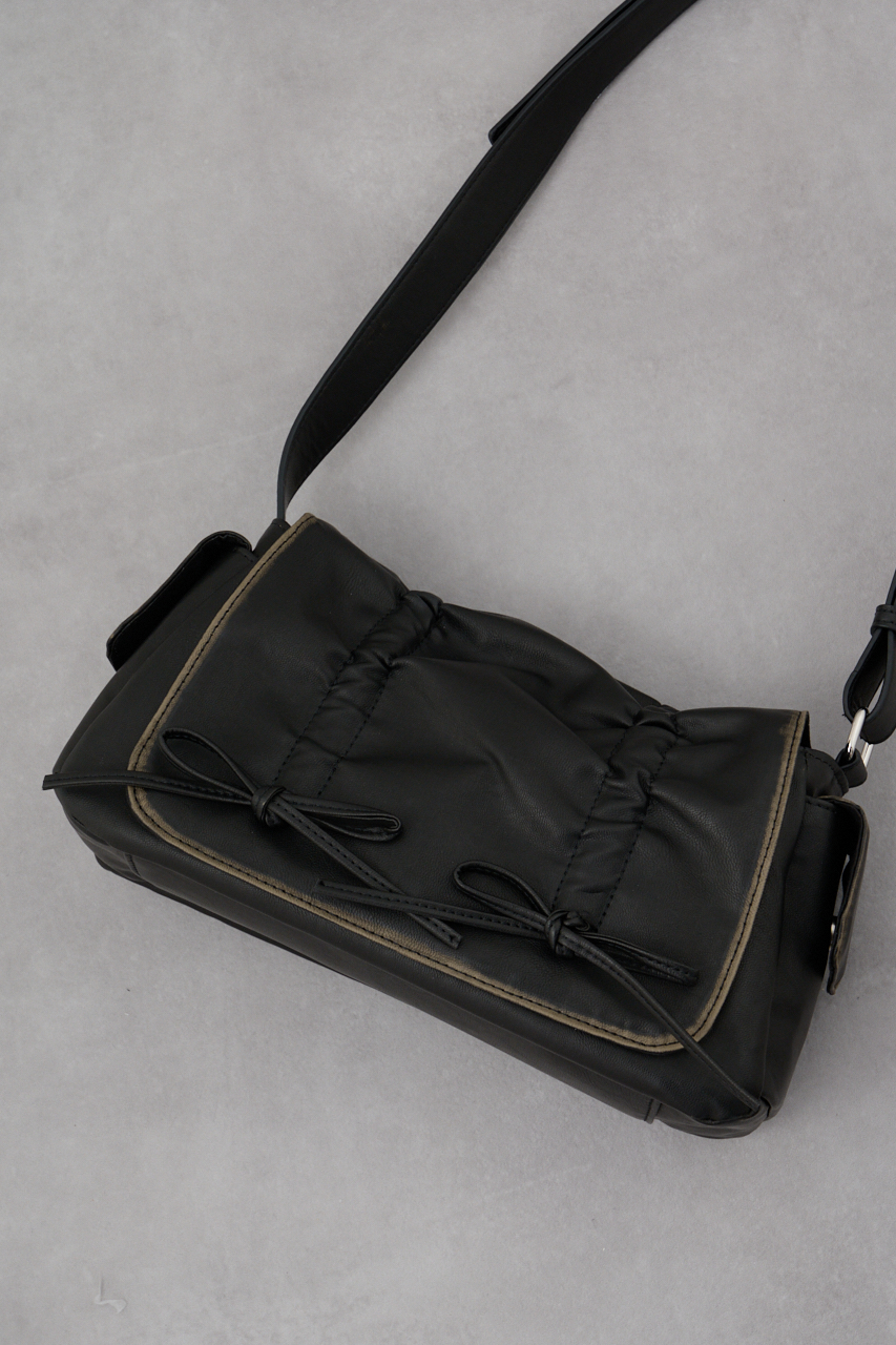 フラップ部分にドロストリボンデザインが2本ついており、トレンド感満載のスタイリッシュなアイテムです。