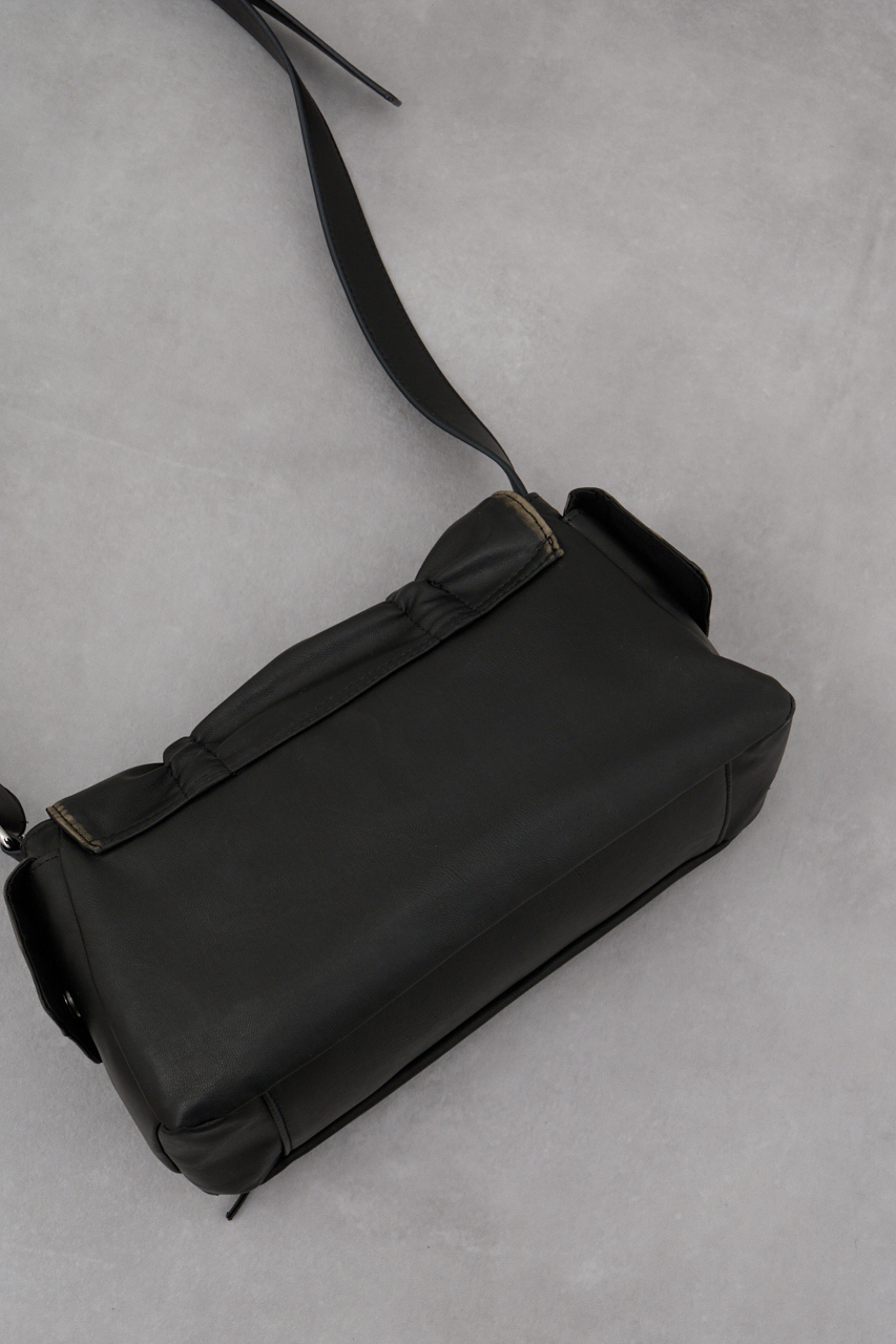 フラップにはバフ加工が施され、シボ感やむら染め風の合成皮革が使用されており、ヴィンテージライクな見え方を実現。