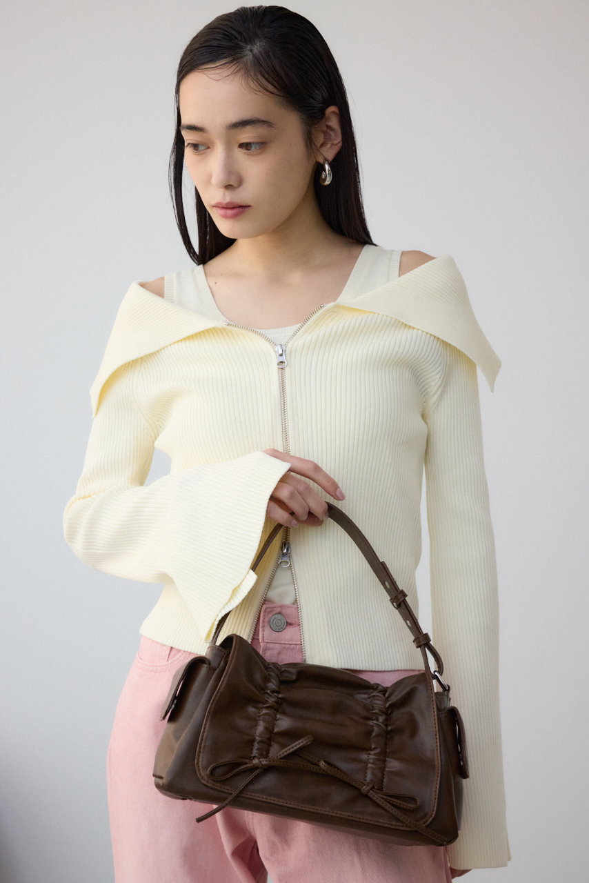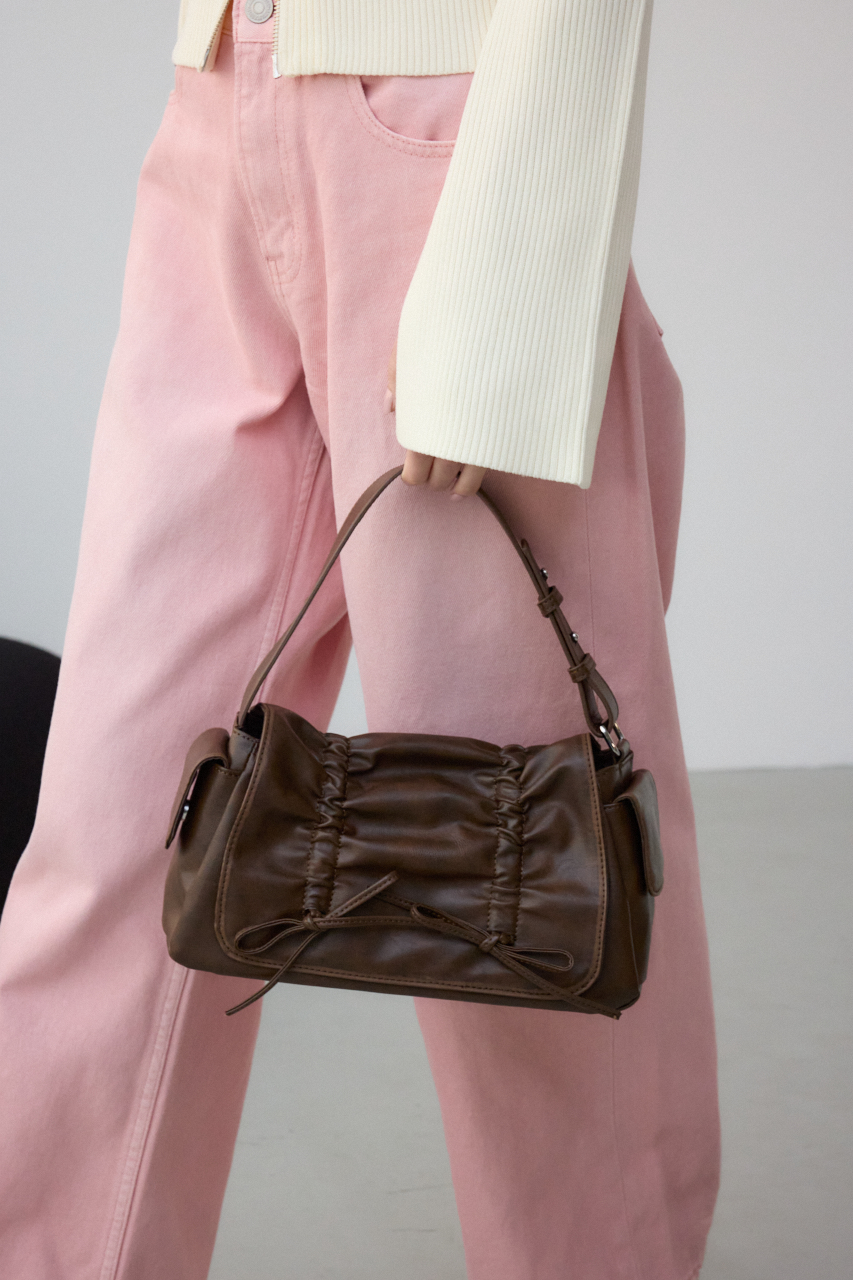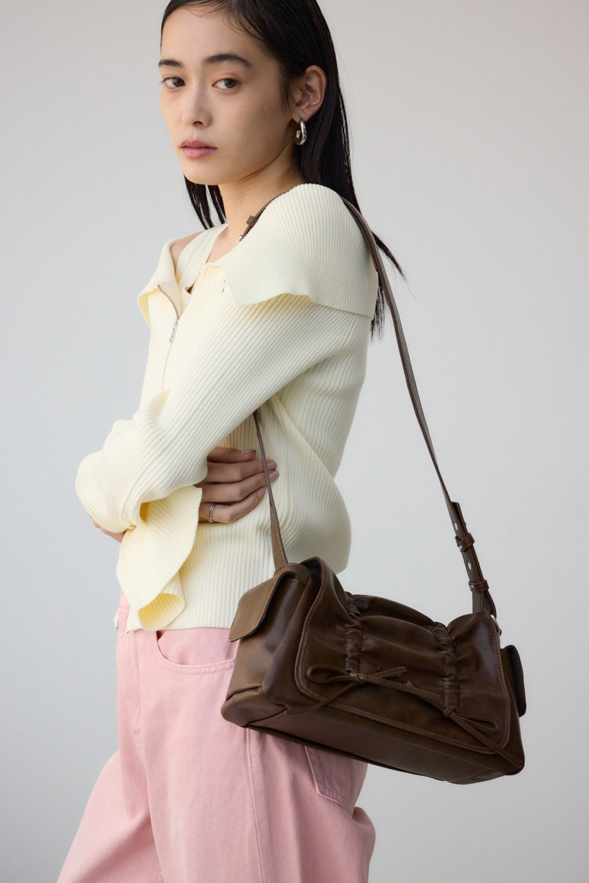フラップ部分にドロストリボンデザインが2本ついており、トレンド感満載のスタイリッシュなアイテムです。