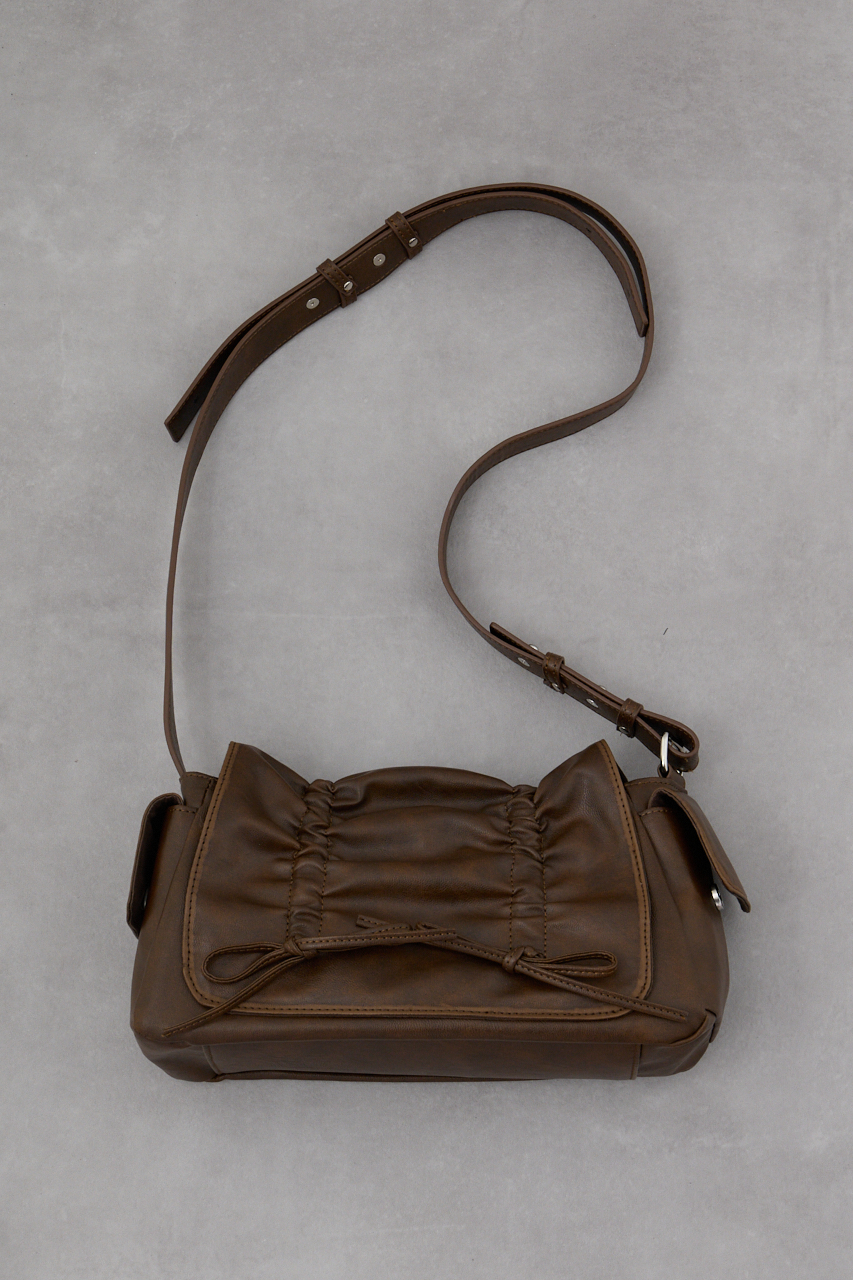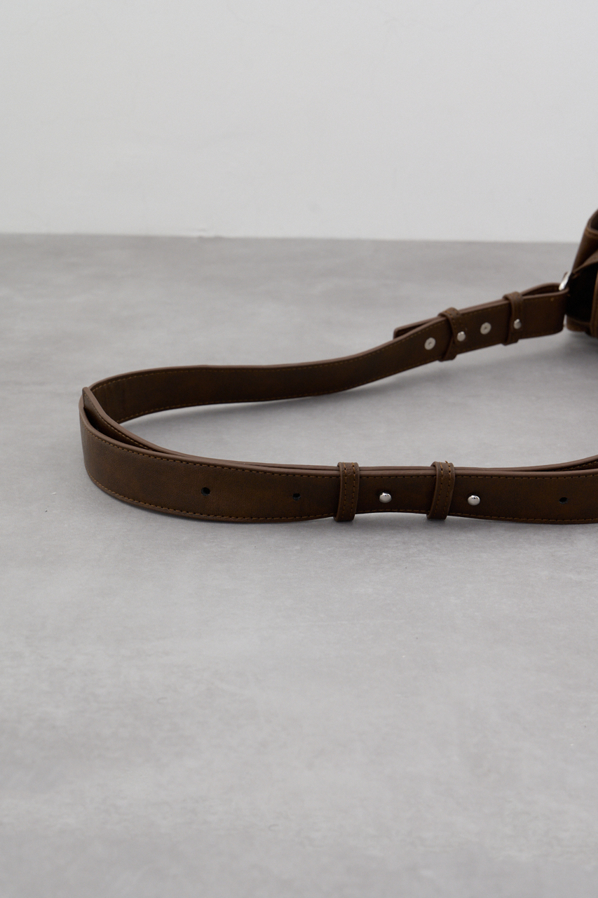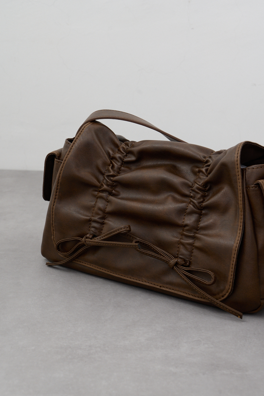 フラップ部分にドロストリボンデザインが2本ついており、トレンド感満載のスタイリッシュなアイテムです。