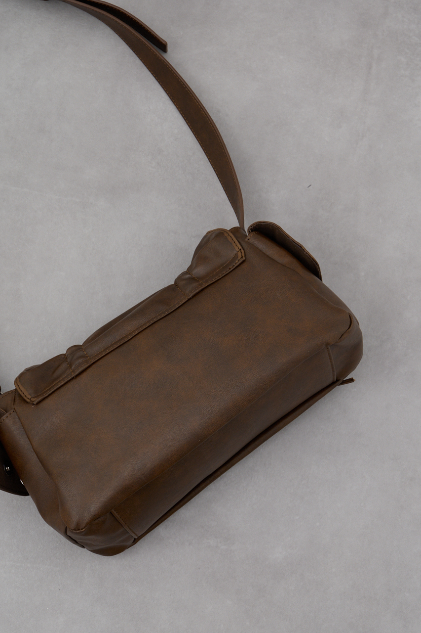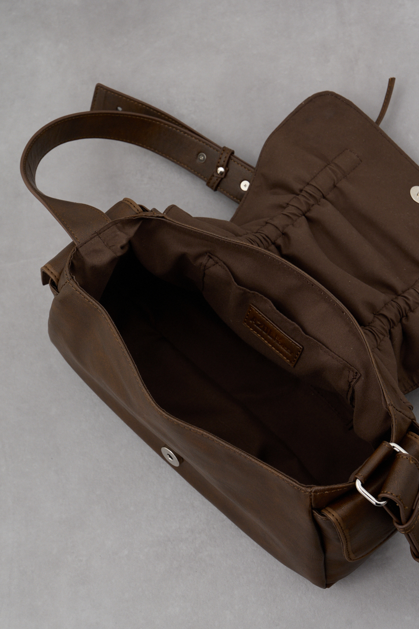 フラップにはバフ加工が施され、シボ感やむら染め風の合成皮革が使用されており、ヴィンテージライクな見え方を実現。