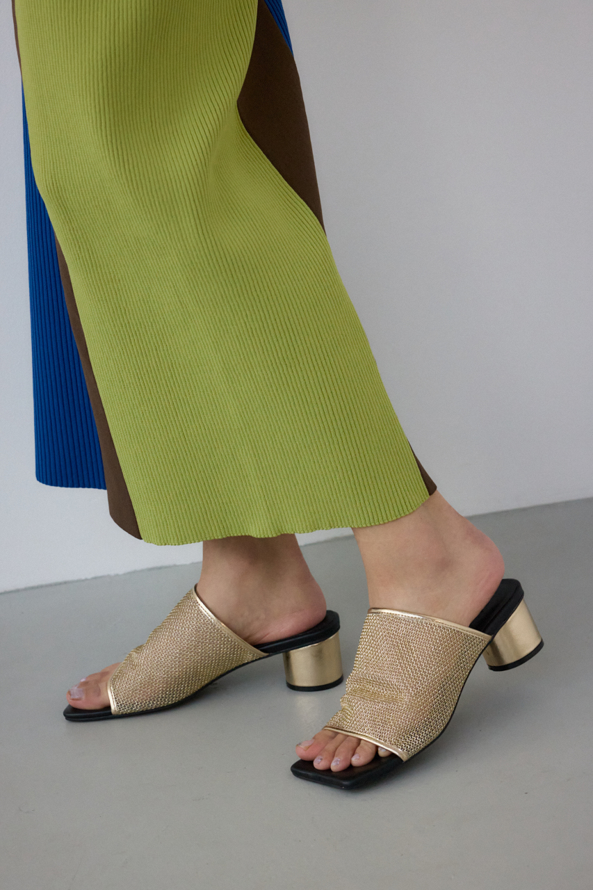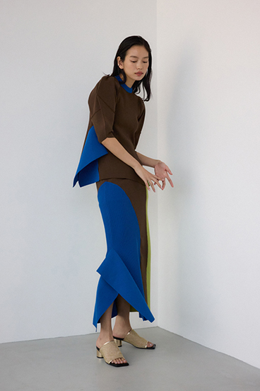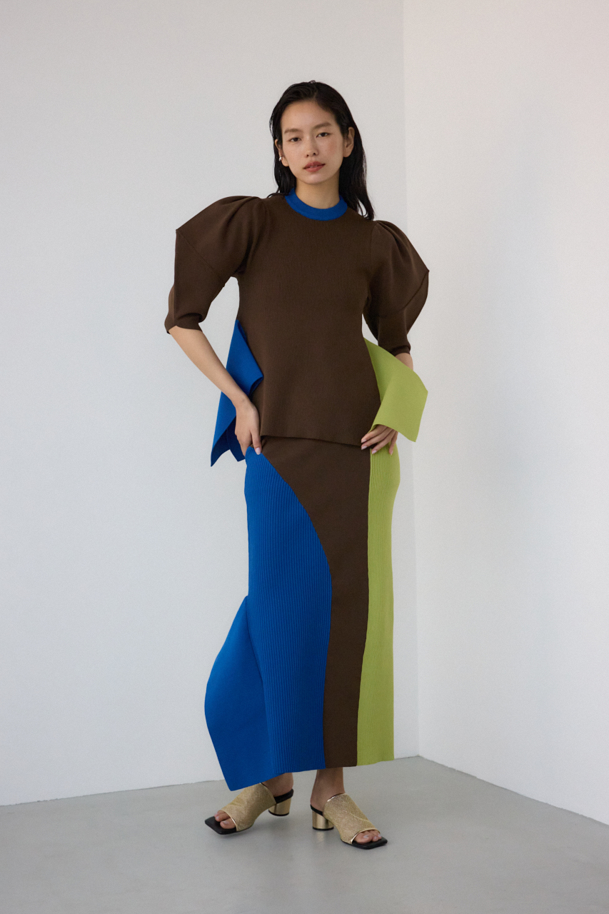 カラーブロックデザインが目を惹くアシンメトリーデザインのニットスカートです。