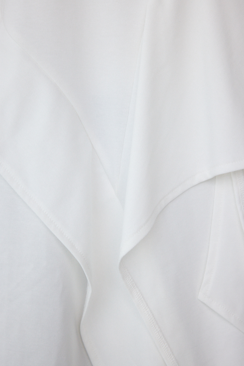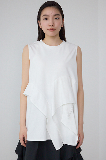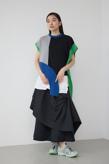 パーツをランダムにドッキングさせ、タックを施した動きのあるデザインカットソーに仕上げています。