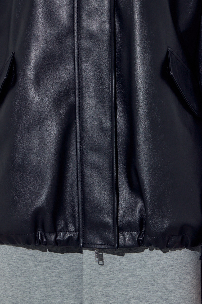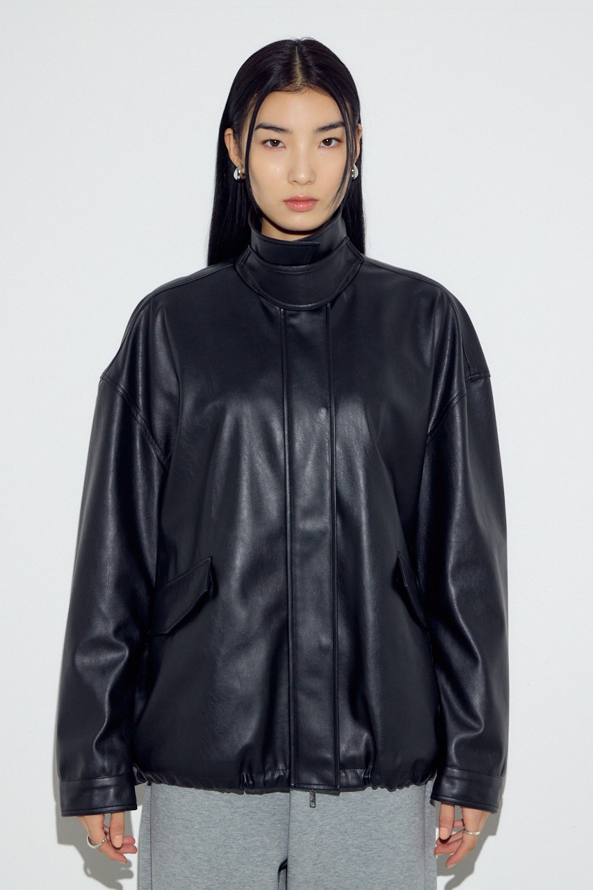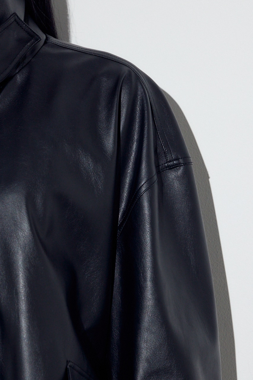 ハードになりすぎず、女性らしいモードな印象に仕上げたミドル丈のフェイクレザーコートです。