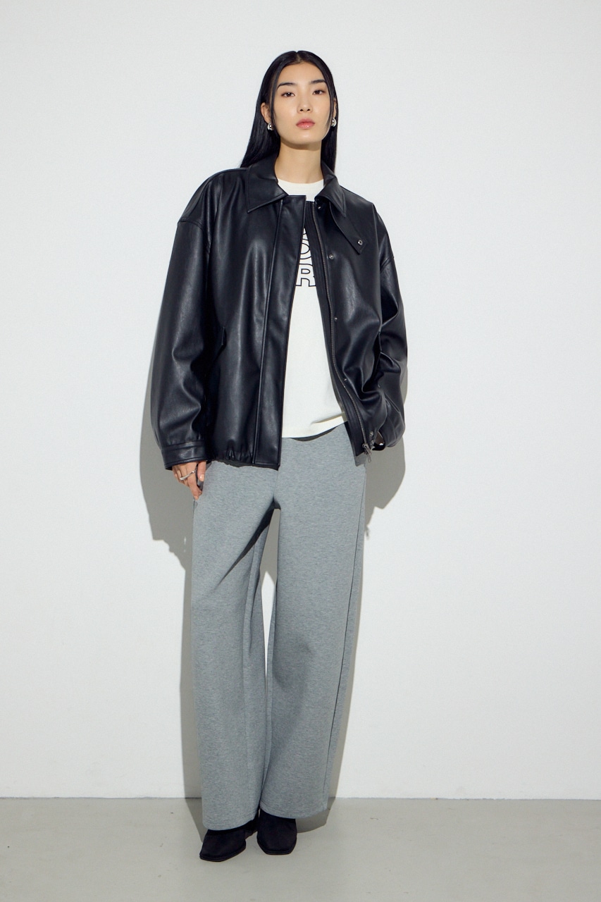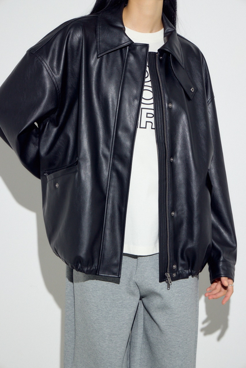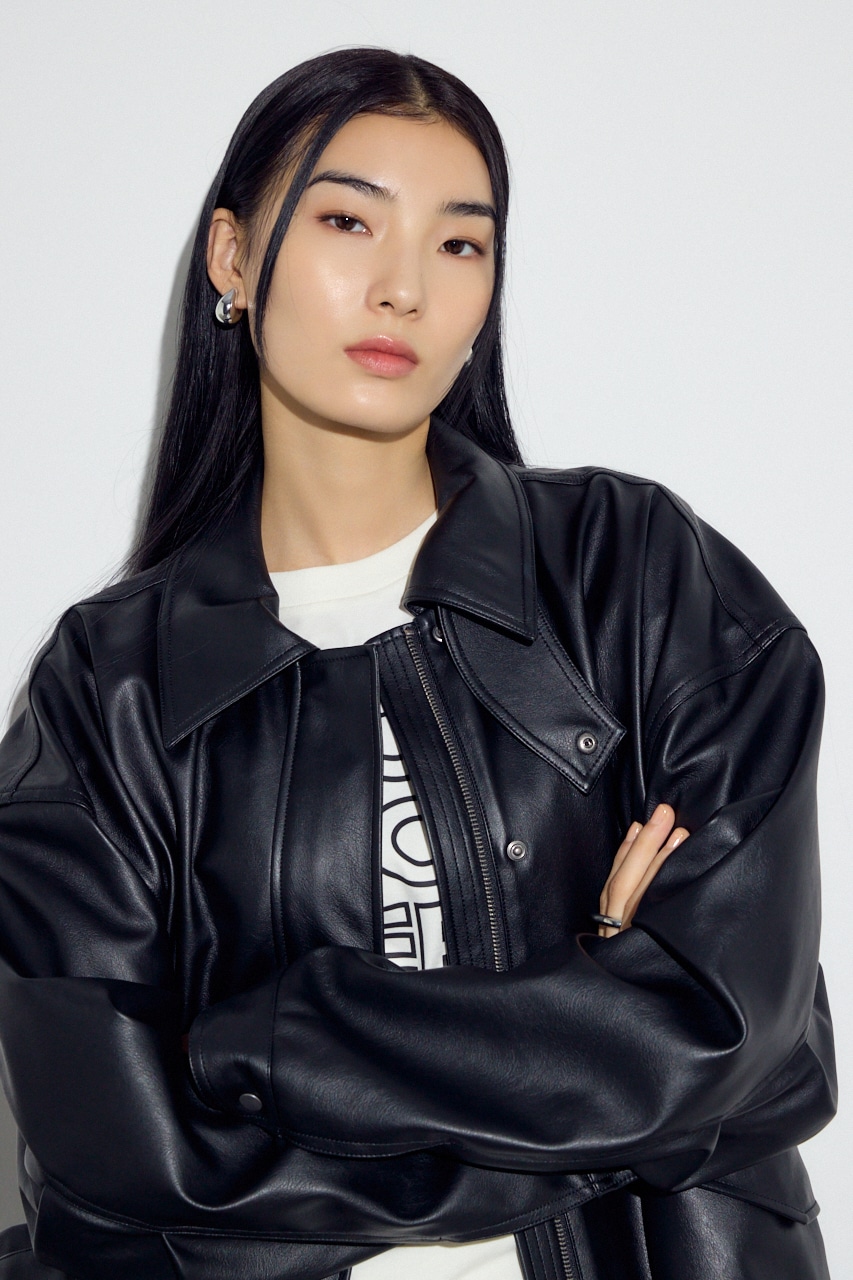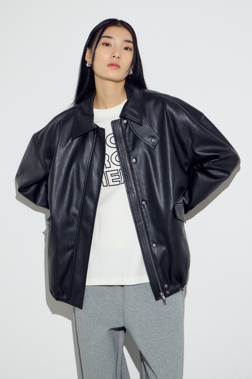ハードになりすぎず、女性らしいモードな印象に仕上げたミドル丈のフェイクレザーコートです。
