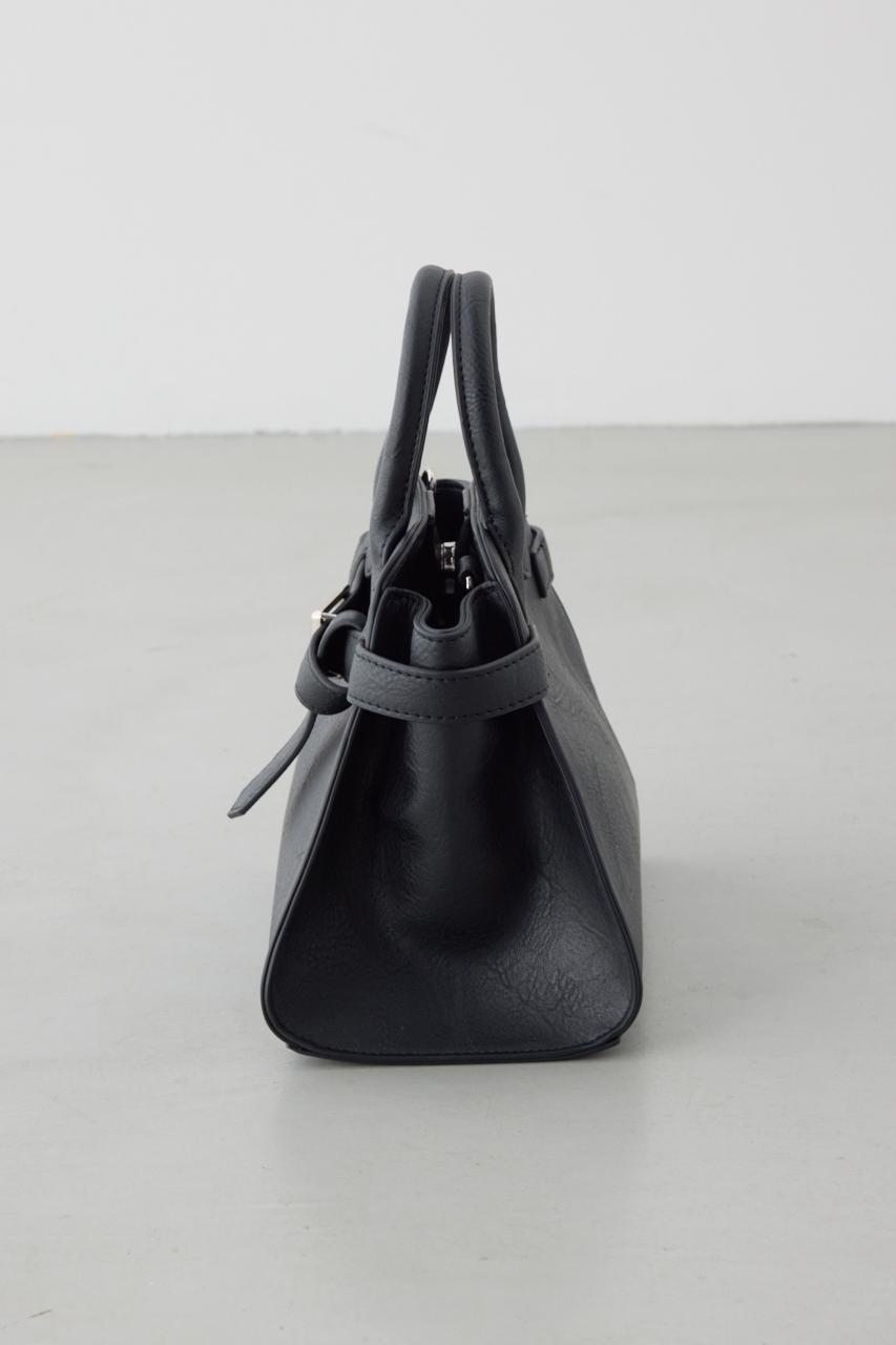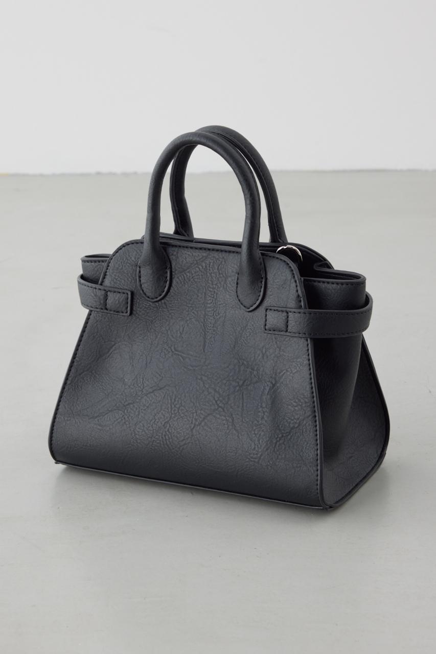 表面感のある合成皮革素材とベルトデザインがアクセントになった、きれいめにもカジュアルにも合わせやすいトートバッグ。