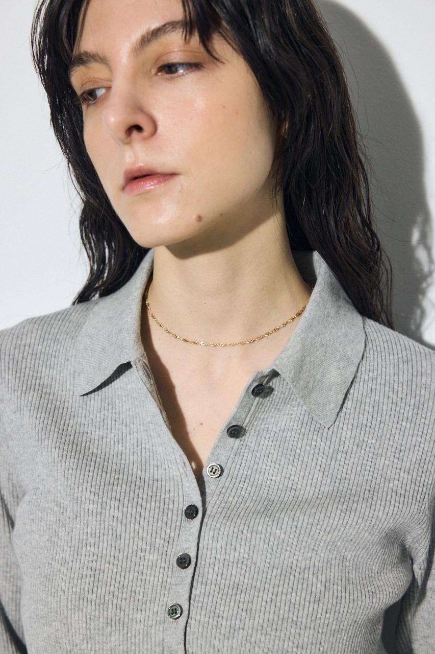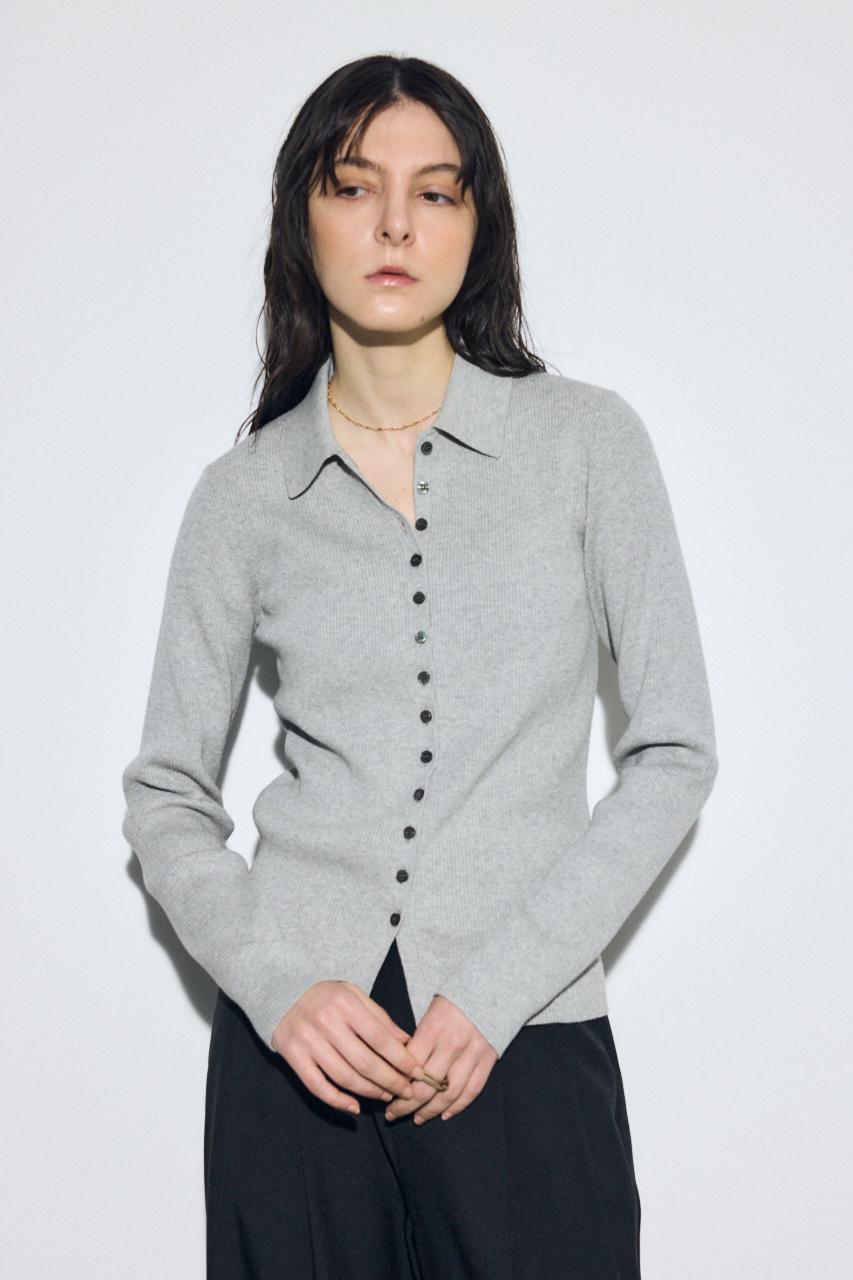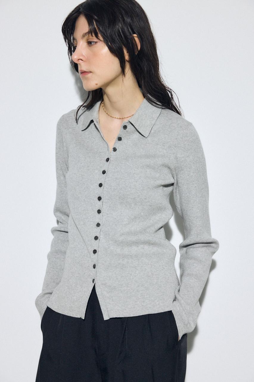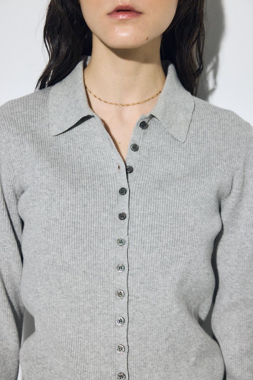 多ボタンが印象的な襟付きのリブニット。
