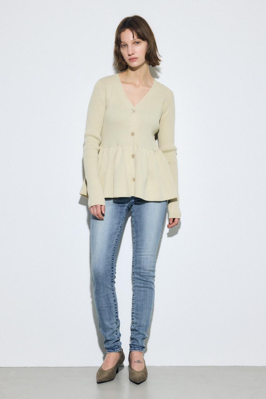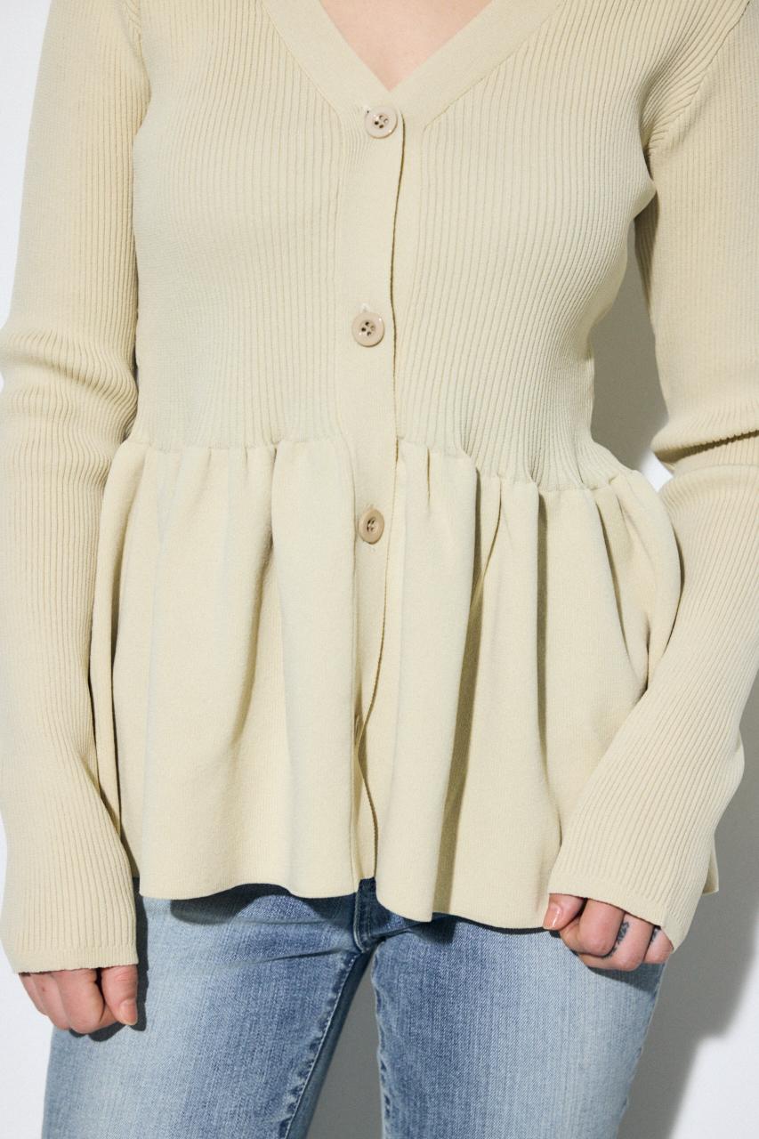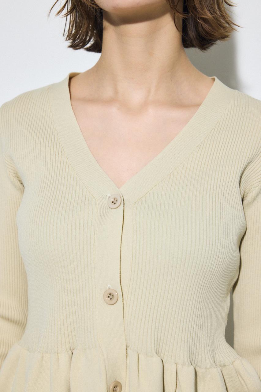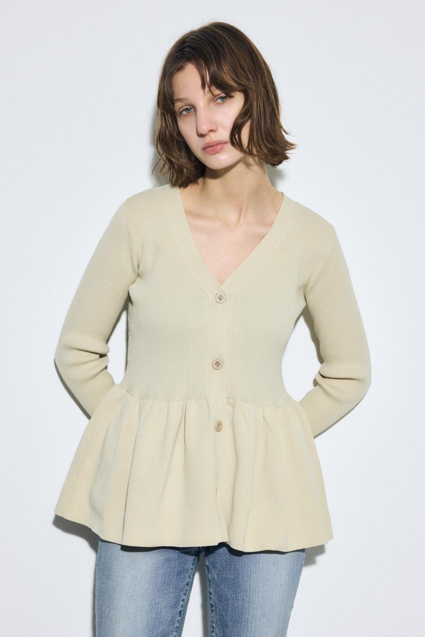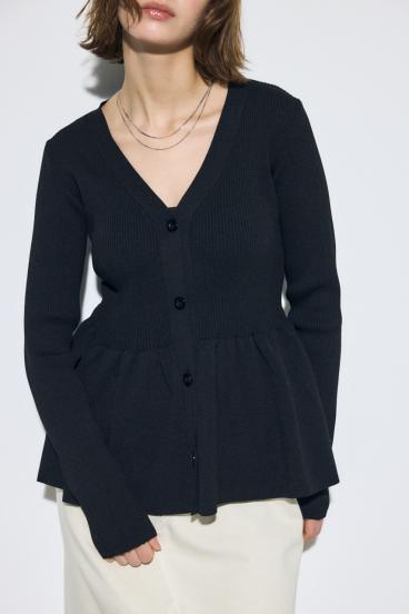 裾に向かって広がるペプラムシルエットが女性らしい、ニットカーディガン。