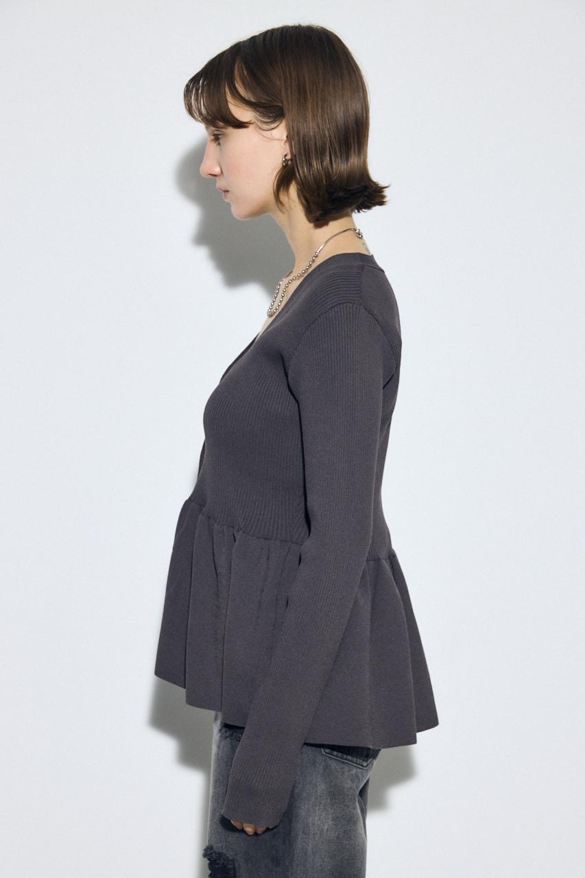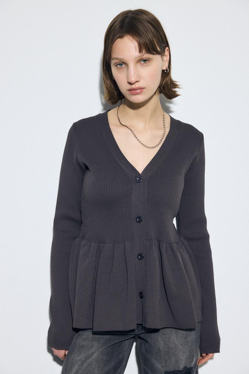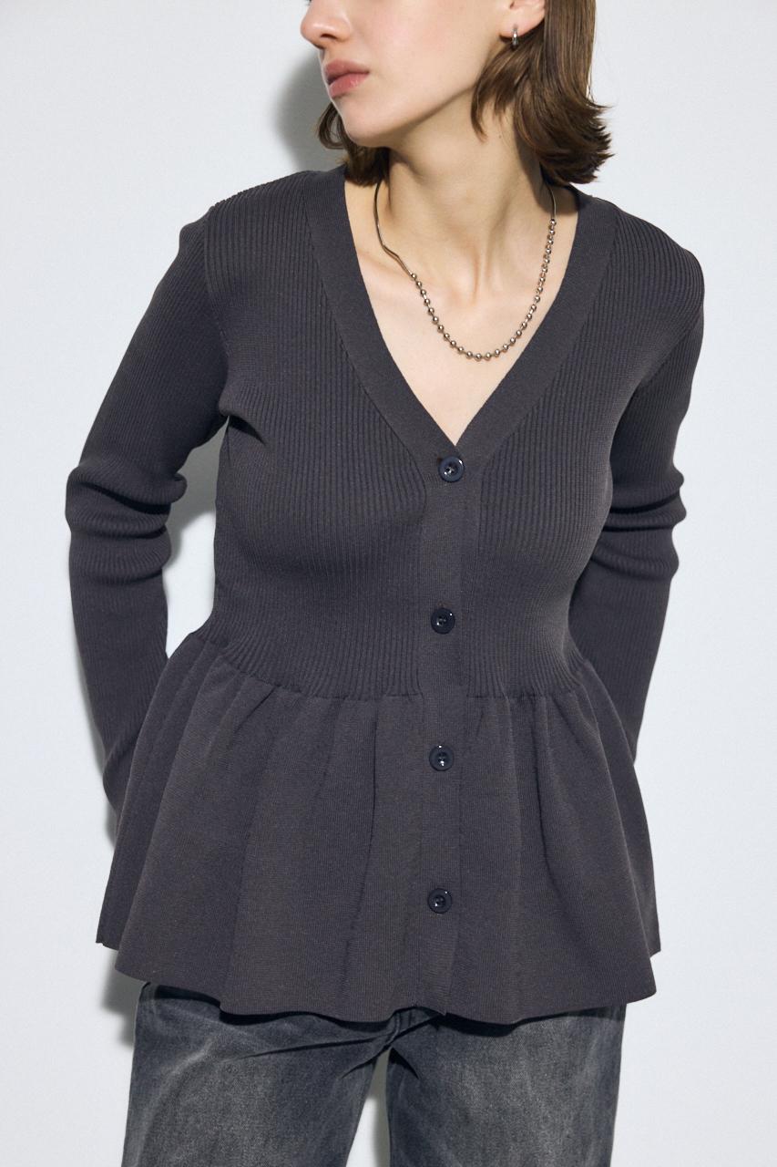 裾に向かって広がるペプラムシルエットが女性らしい、ニットカーディガン。