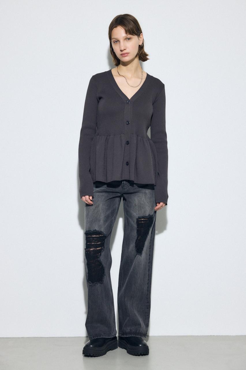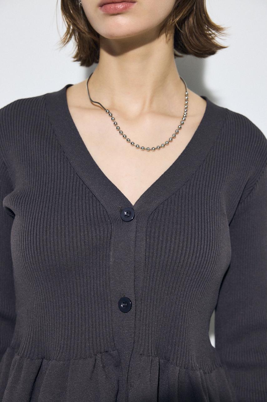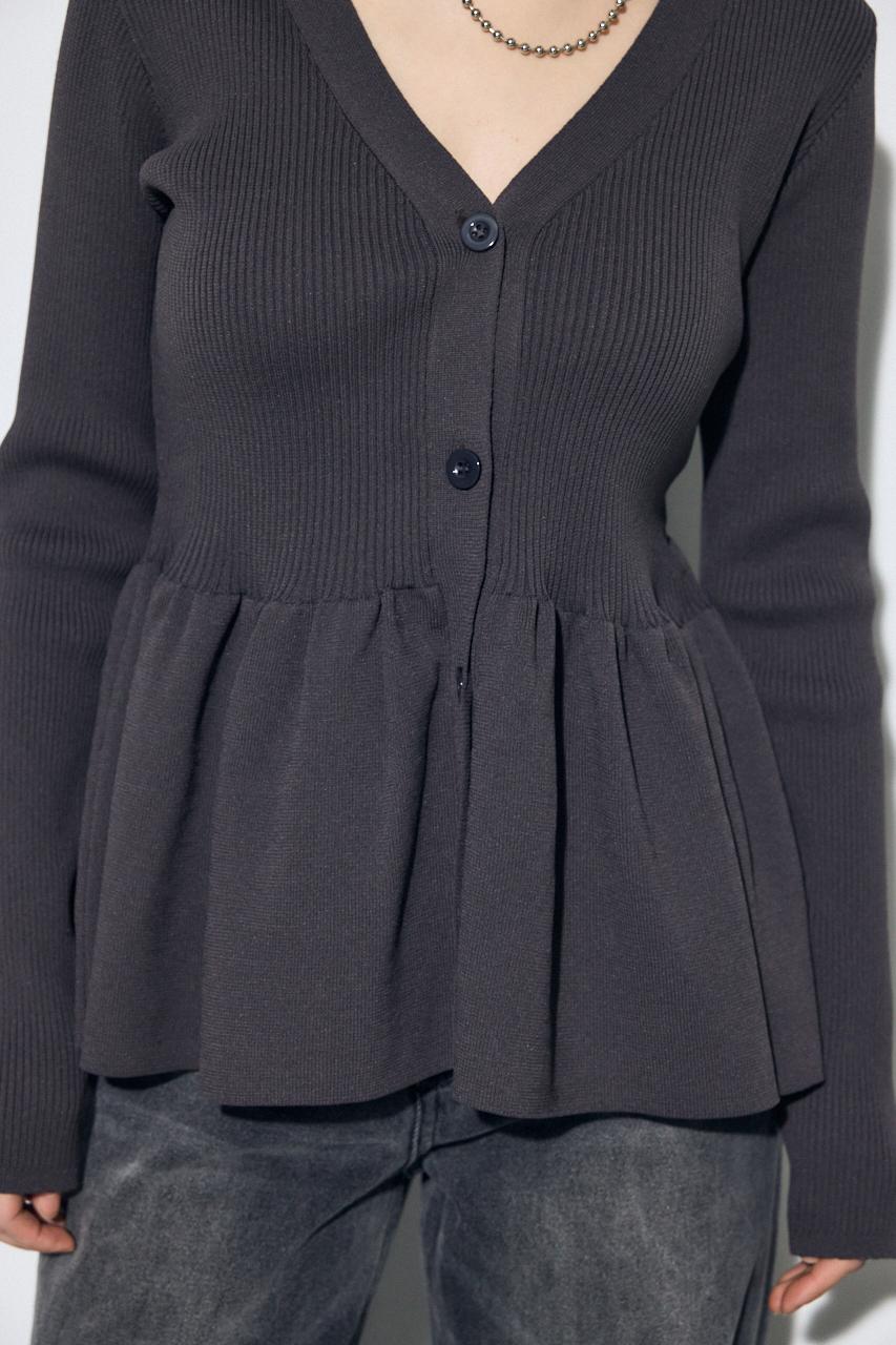 裾に向かって広がるペプラムシルエットが女性らしい、ニットカーディガン。