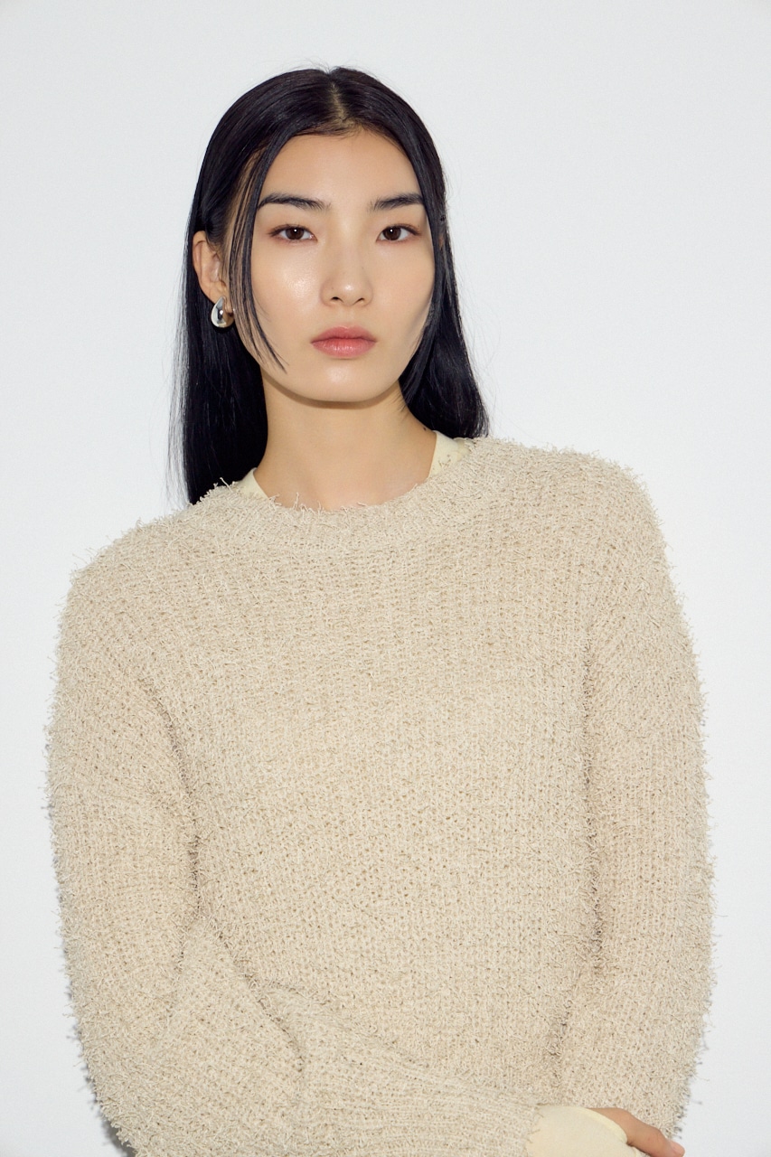 柔らかく膨らみのある糸にくるくるとカールをした糸を掛け合わせて編み立てる事により、独特の表情がある編地に仕上げています。